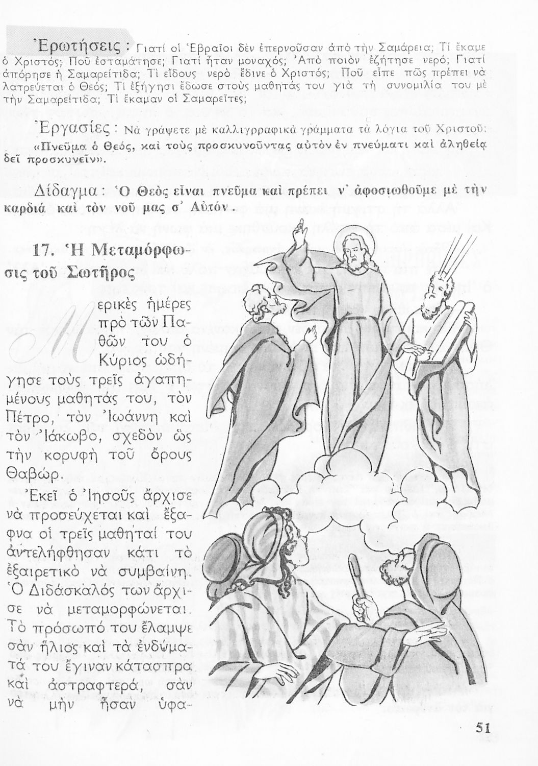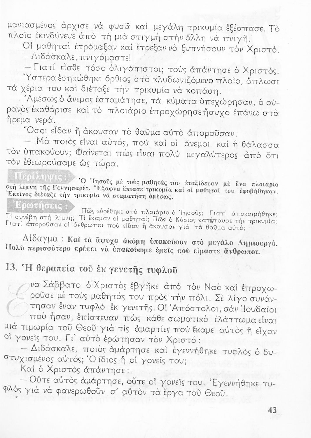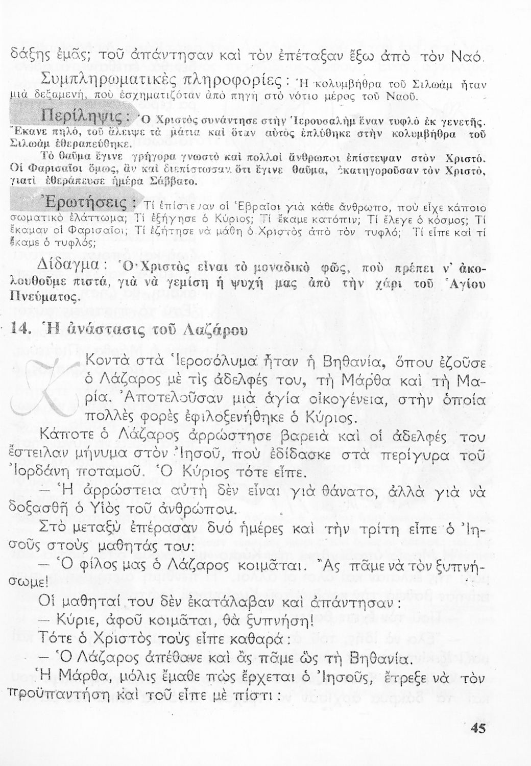 Βαθμίδα εκπαίδευσης: Πρωτοβάθμια Τάξη: Δ' Δημοτικού Μάθημα: Θρησκευτικά Γλώσσα: Δημοτική με στοιχεία καθαρεύουσας Παρουσίαση περιεχομένου: Μαθητικό βοήθημα Θρησκευτικών Δ΄ Δημοτικού που αποτελεί μια εξιστόρηση της Καινής Διαθήκης από τη γέννηση της Θεοτόκου μέχρι την ανάληψη του Χριστού. |