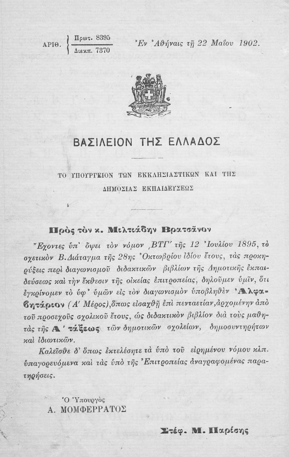 Εκδότης: Ιωάννης Ν. Σιδέρης Έτος έκδοσης: 1916 Τόπος έκδοσης: Αθήνα Υπουργική απόφαση / Σύμβαση: 8395/22-5-1902 Έτος έγκρισης: 1902 |