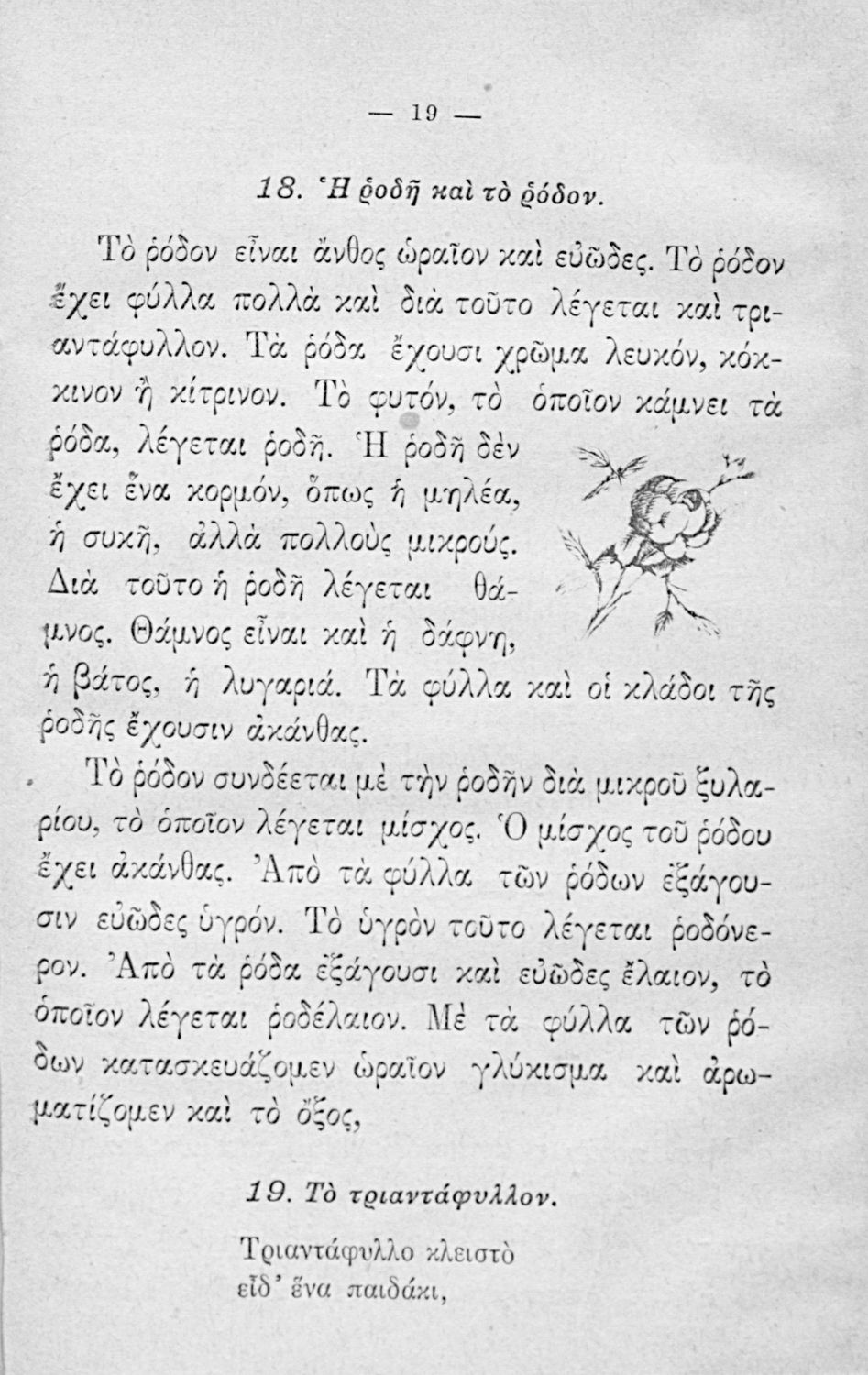 Σχολικό εγχειρίδιο Γεωγραφίας για την Α΄ Ελληνικών Σχολείων. Βιβλίο Φυσικής Ιστορίας με ζώα και φυτά που αναφέρονται οι χρήσεις τους, οι εχθροί και οι προφυλάξεις.