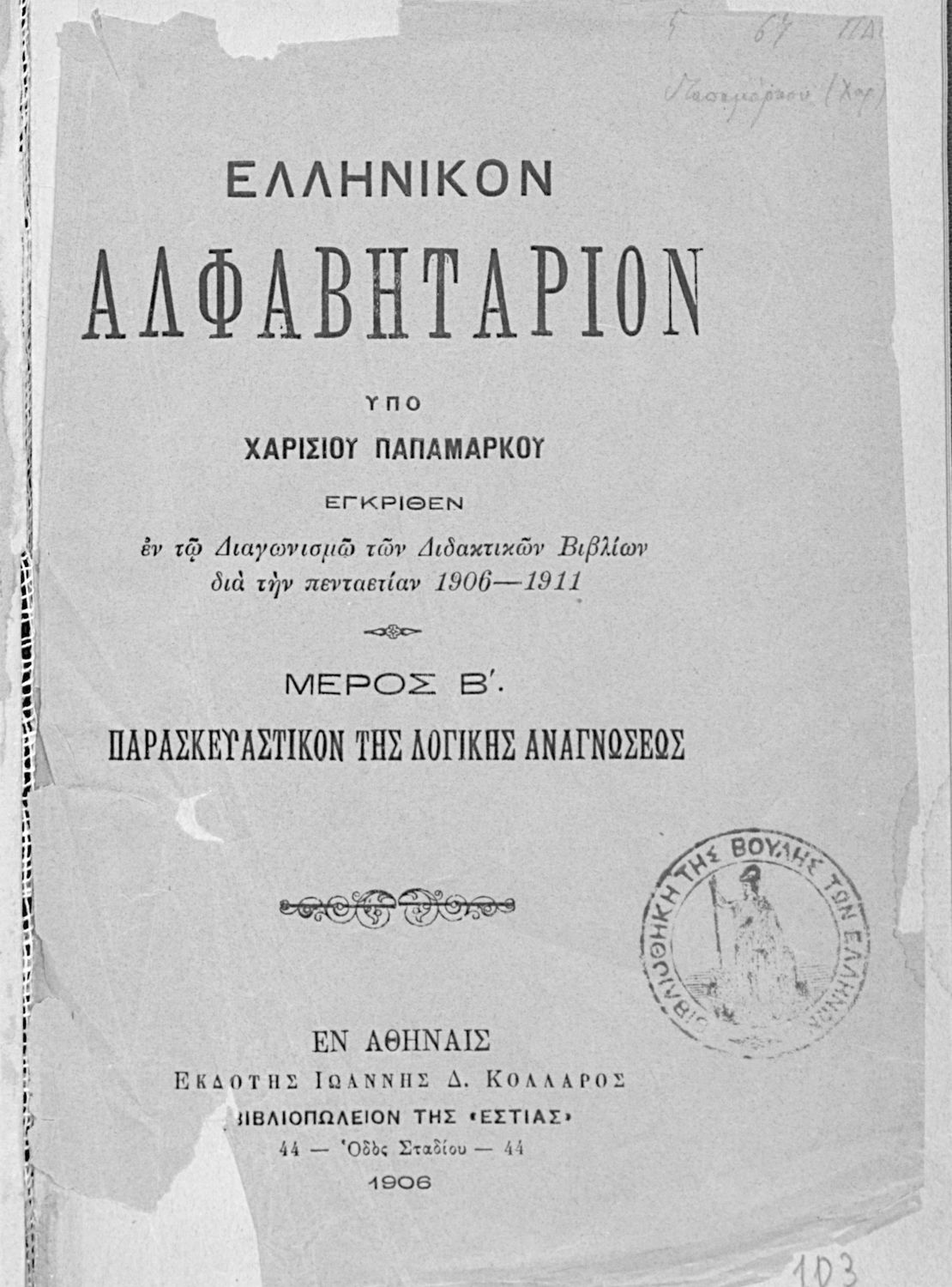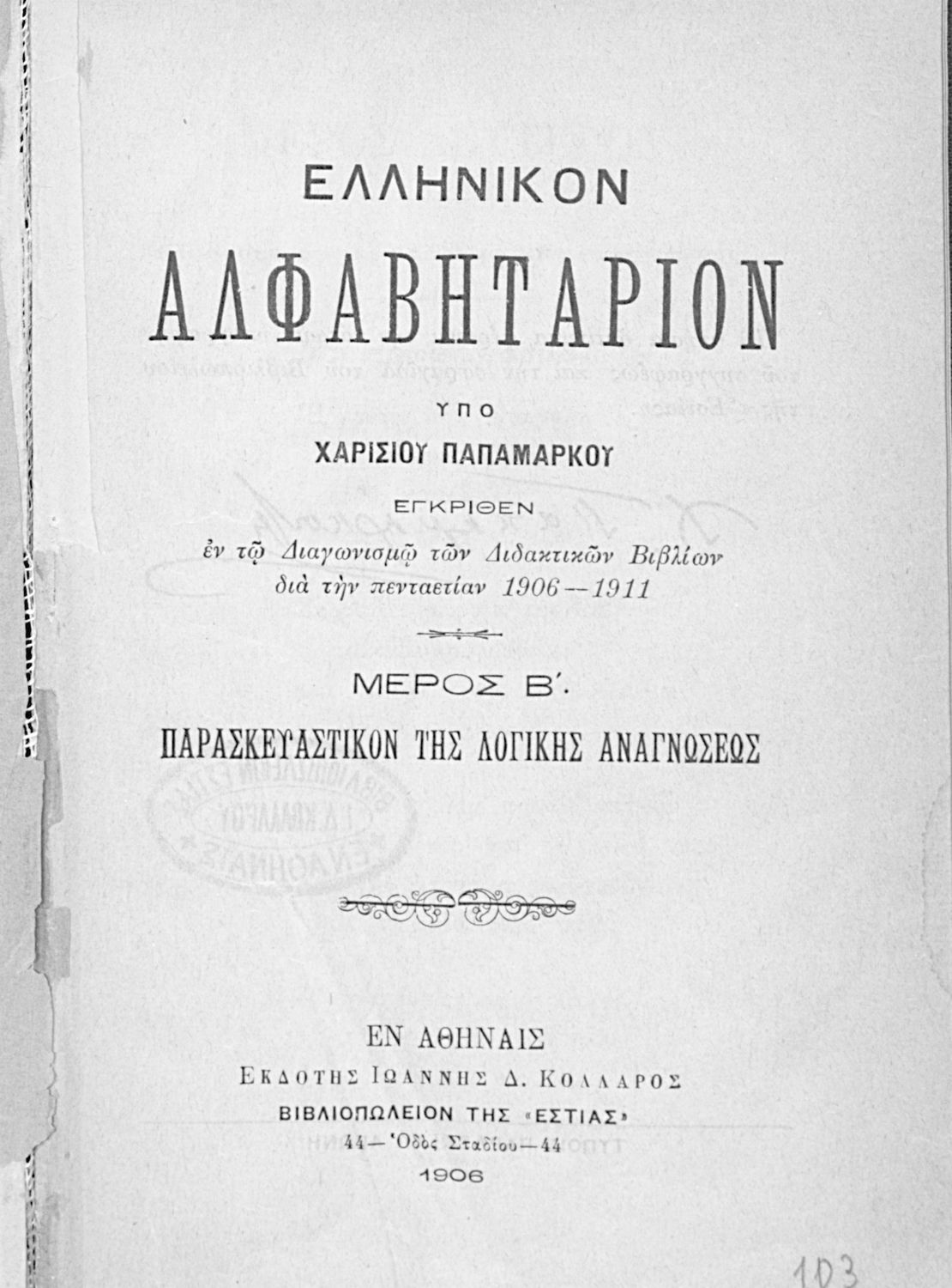 Τίτλος: Ελληνικόν αλφαβητάριον Μέρος Β΄ Προπαρασκευαστικόν της λογικής αναγνώσεως