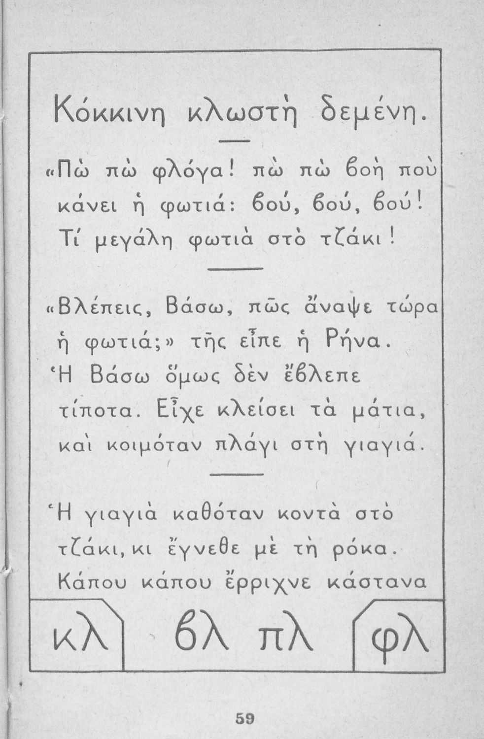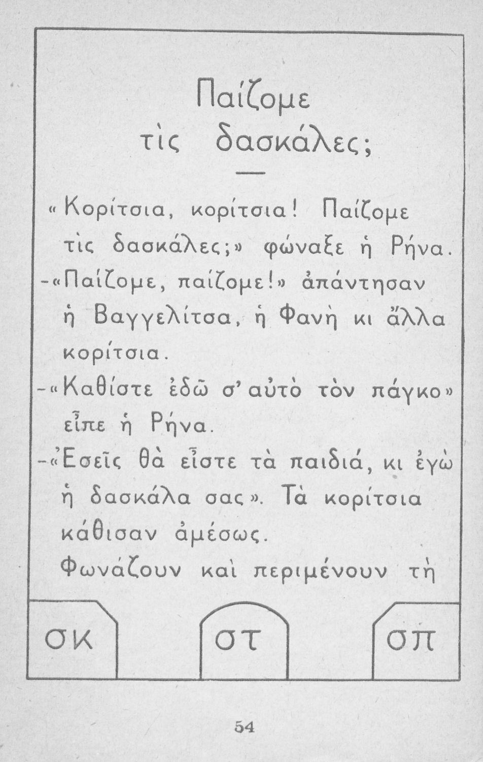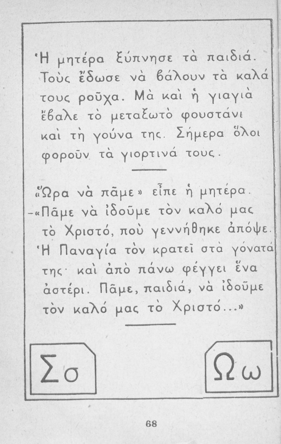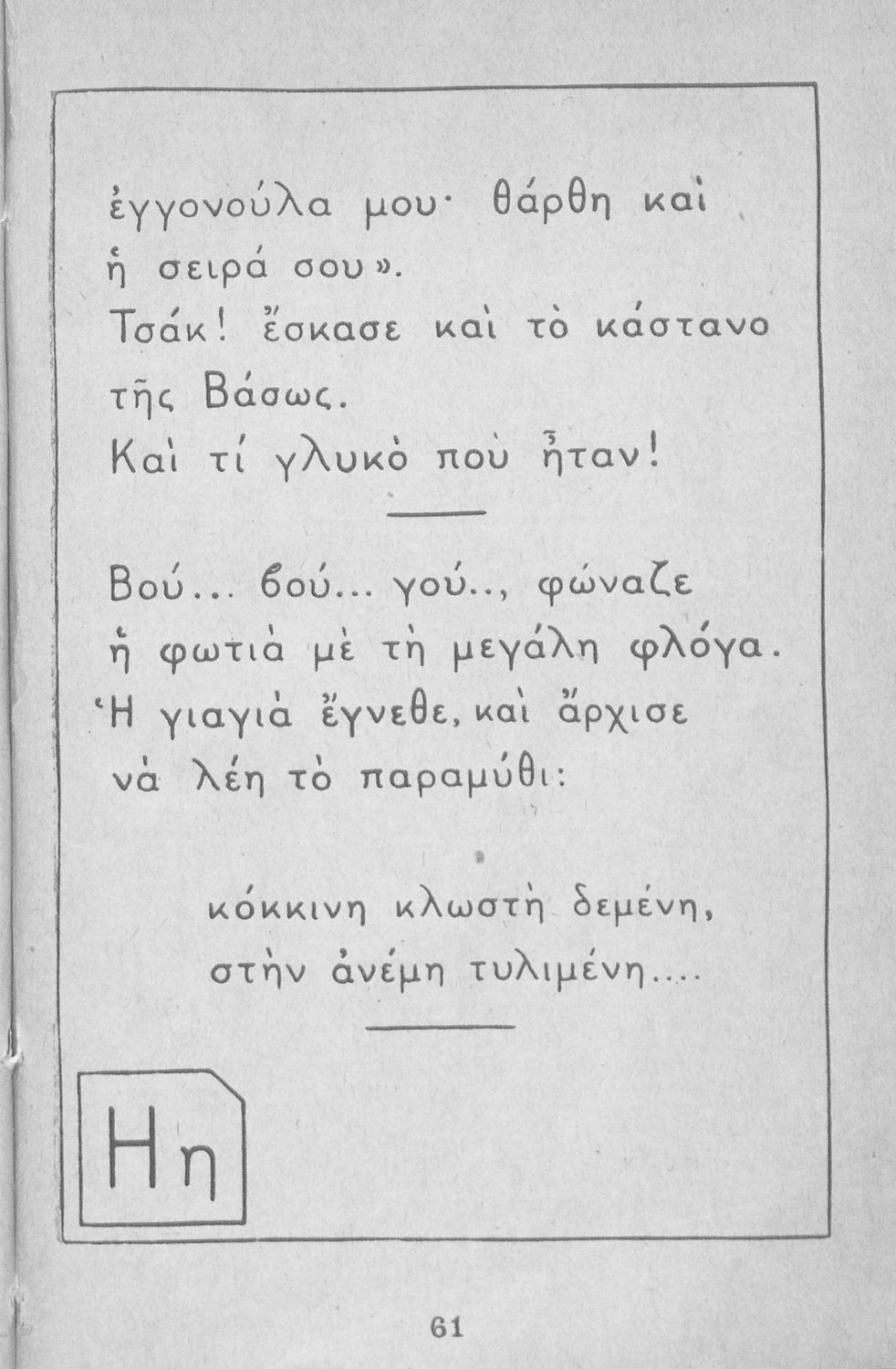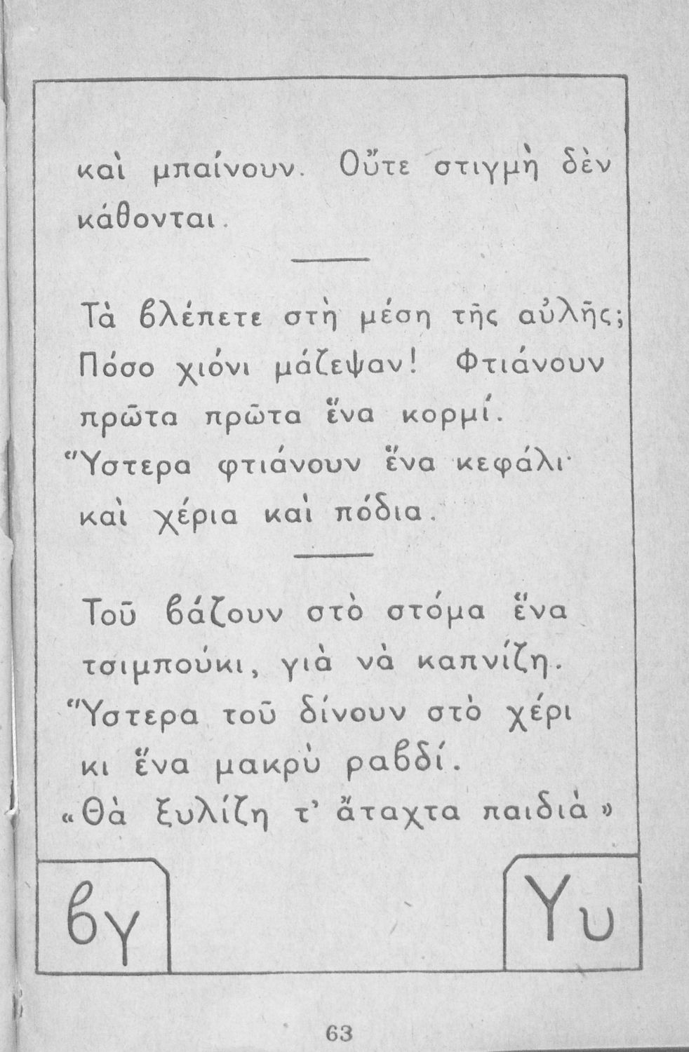 Βαθμίδα εκπαίδευσης: Πρωτοβάθμια Τάξη: Α' Δημοτικού Μάθημα: Νέα Ελληνικά Γλώσσα: Δημοτική Παρουσίαση περιεχομένου: Αναγνωστικό Α΄ Δημοτικού που περιλαμβάνει μικρές συλλαβές και ιστορίες με θεματολογία από την οικογενειακή και κοινωνική ζωή μιας μικροαστικής οικογένειας κατά τη διάρκεια ενός χρόνου. |