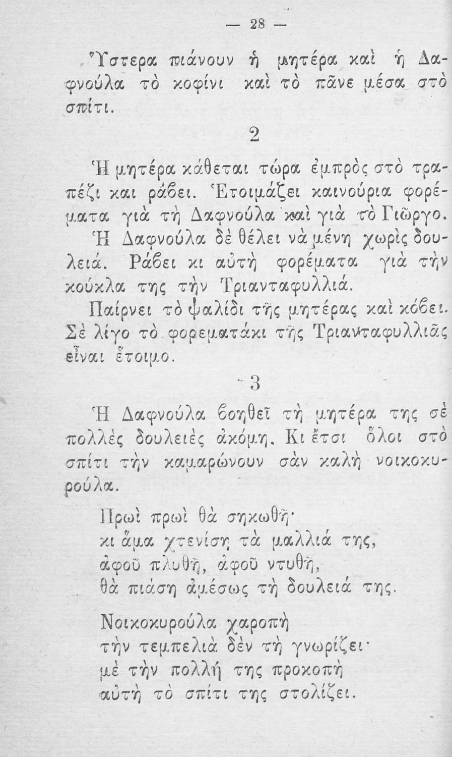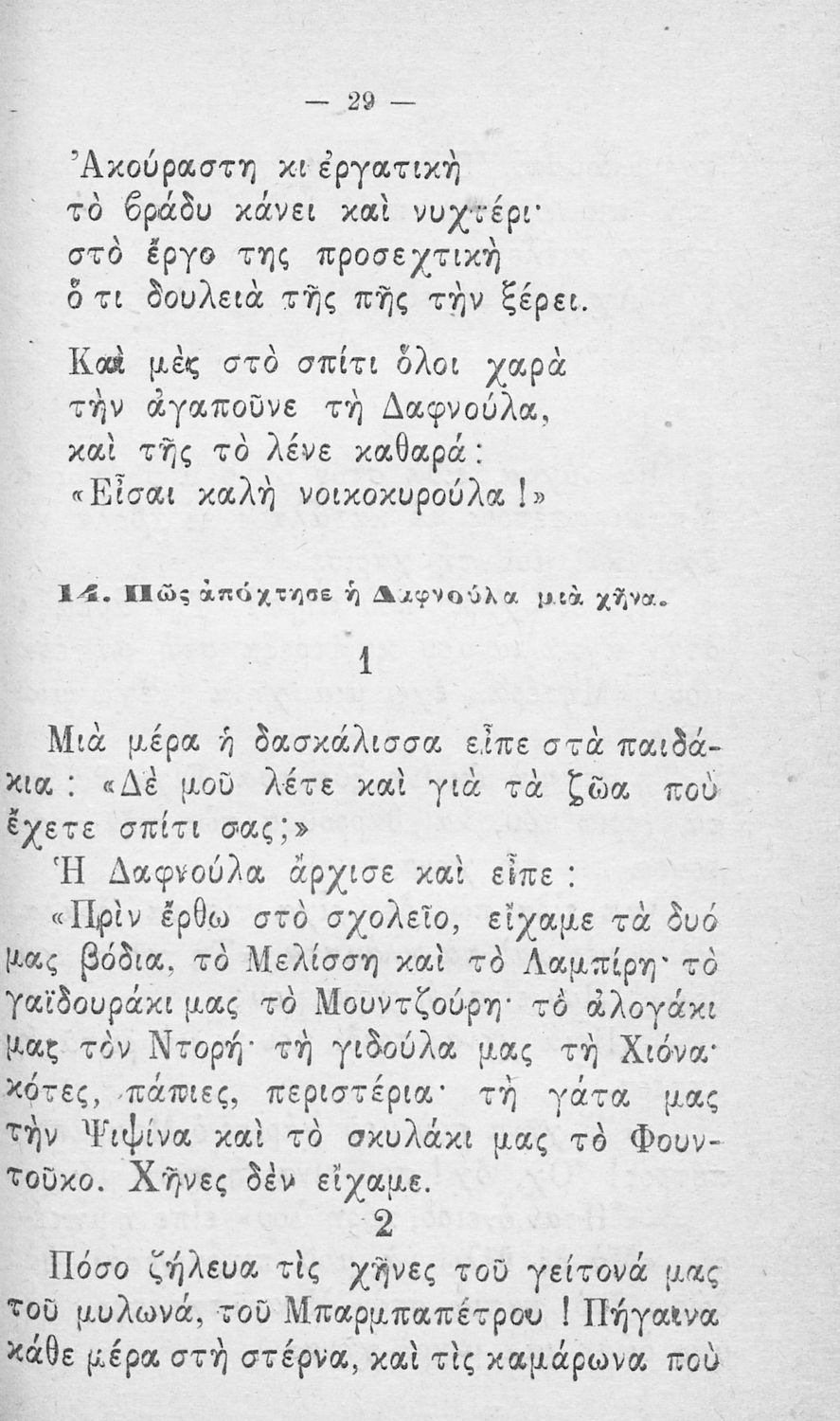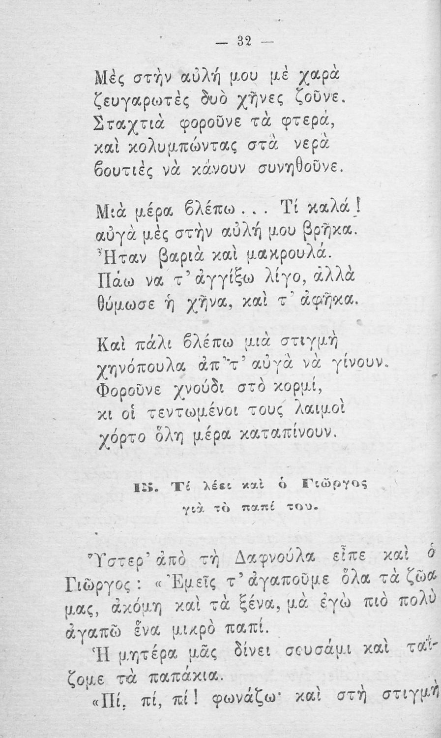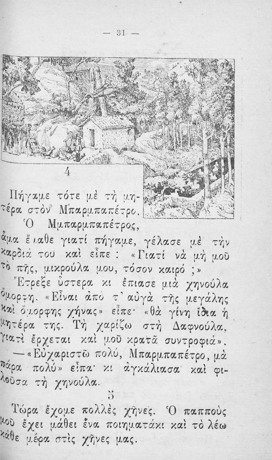 Αναγνωστικό [Α΄ Δημοτικού] που περιλαμβάνει ποιηματάκια και ιστοριούλες και αντλεί τη θεματολογία του από καθημερινά περιστατικά, την ελληνική ύπαιθρο και την ελληνική οικογένεια.