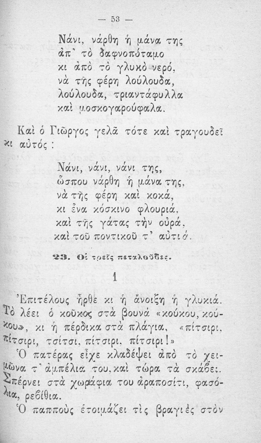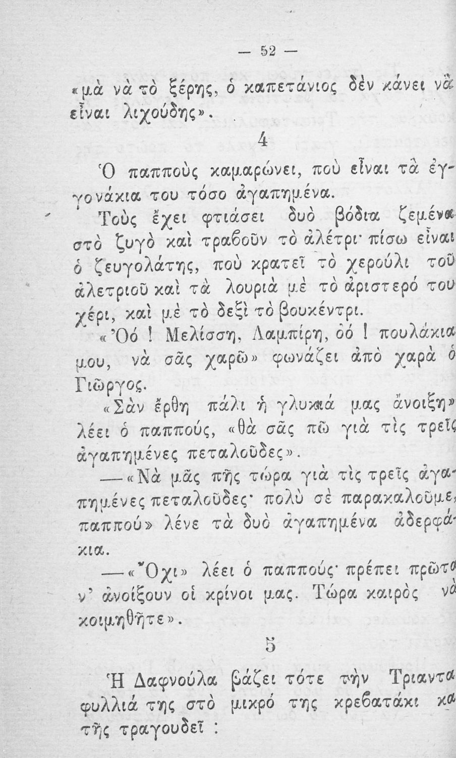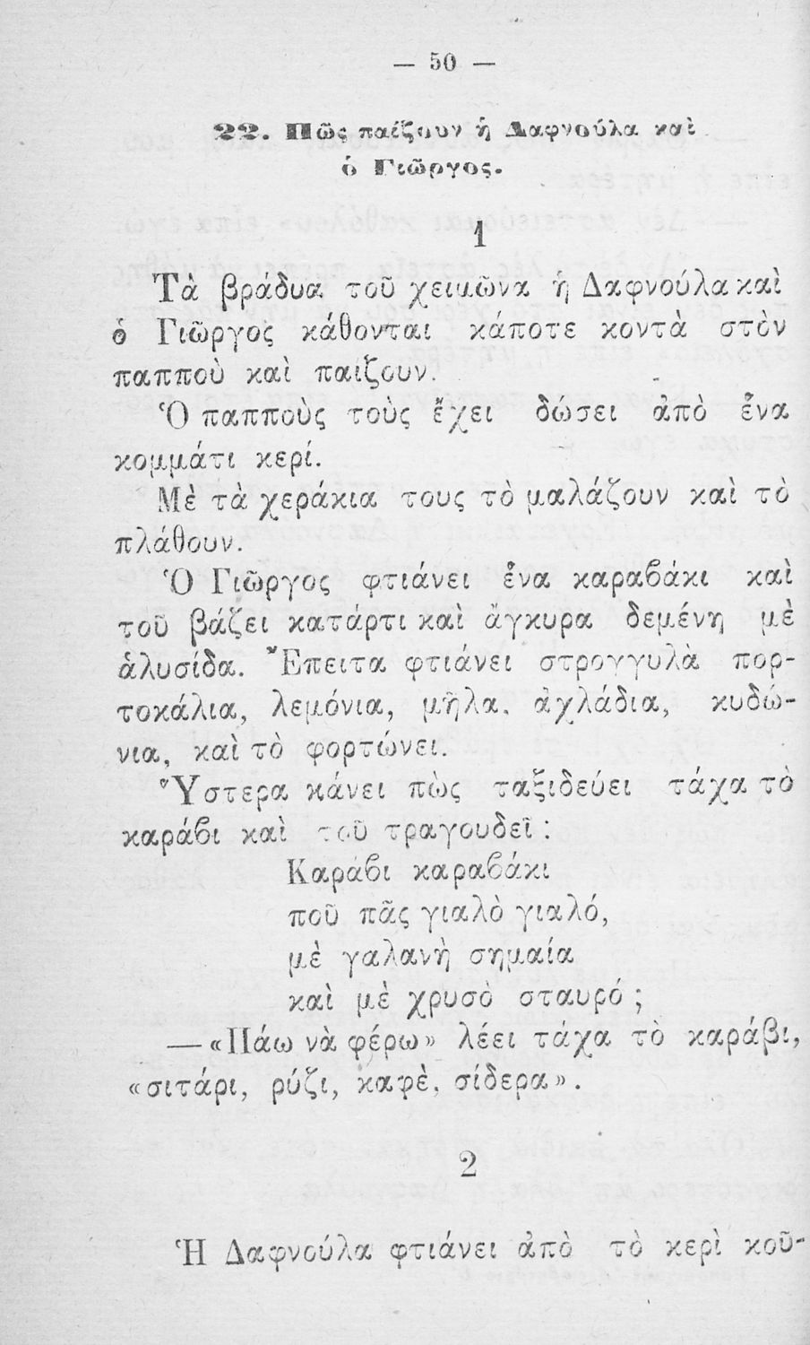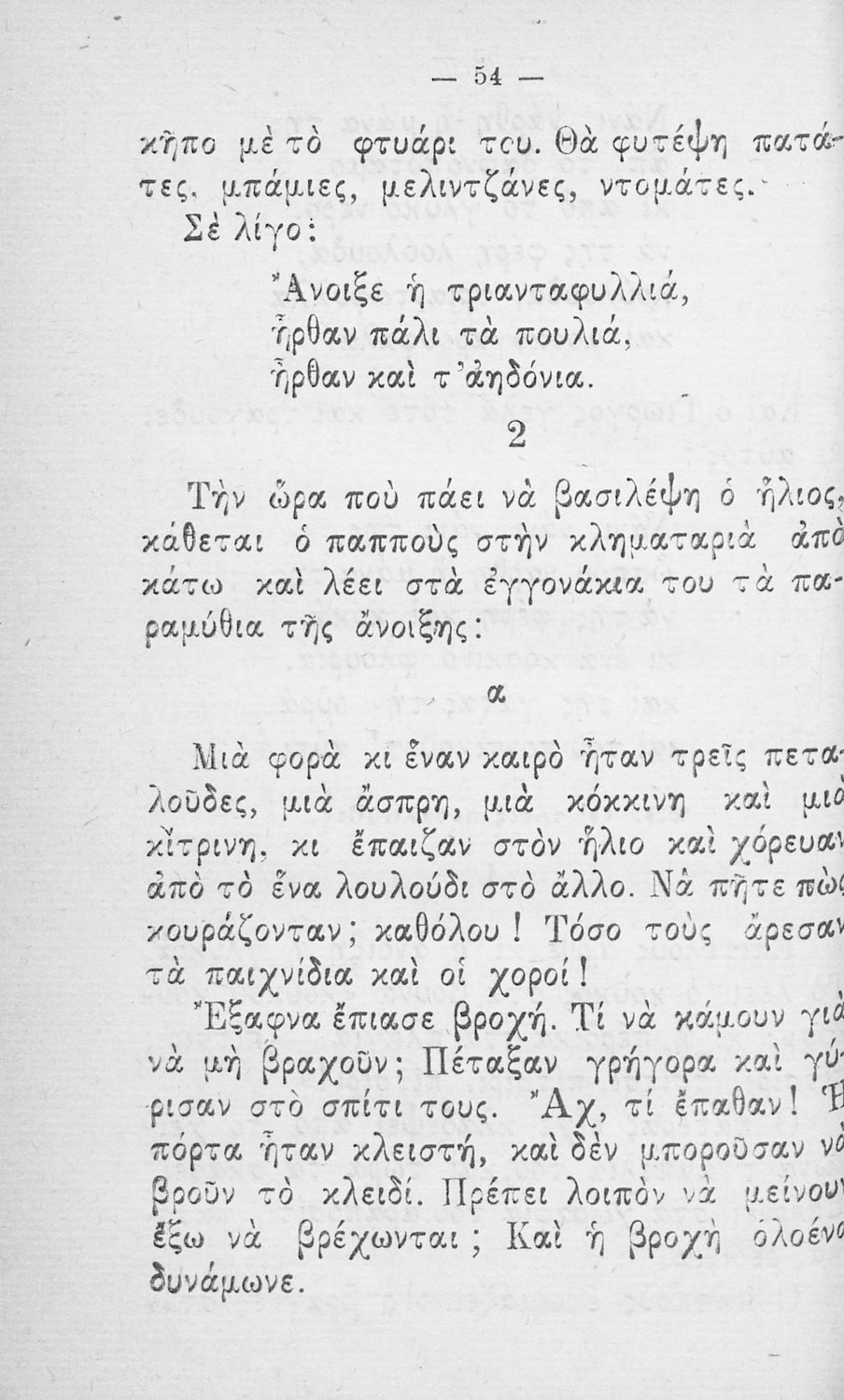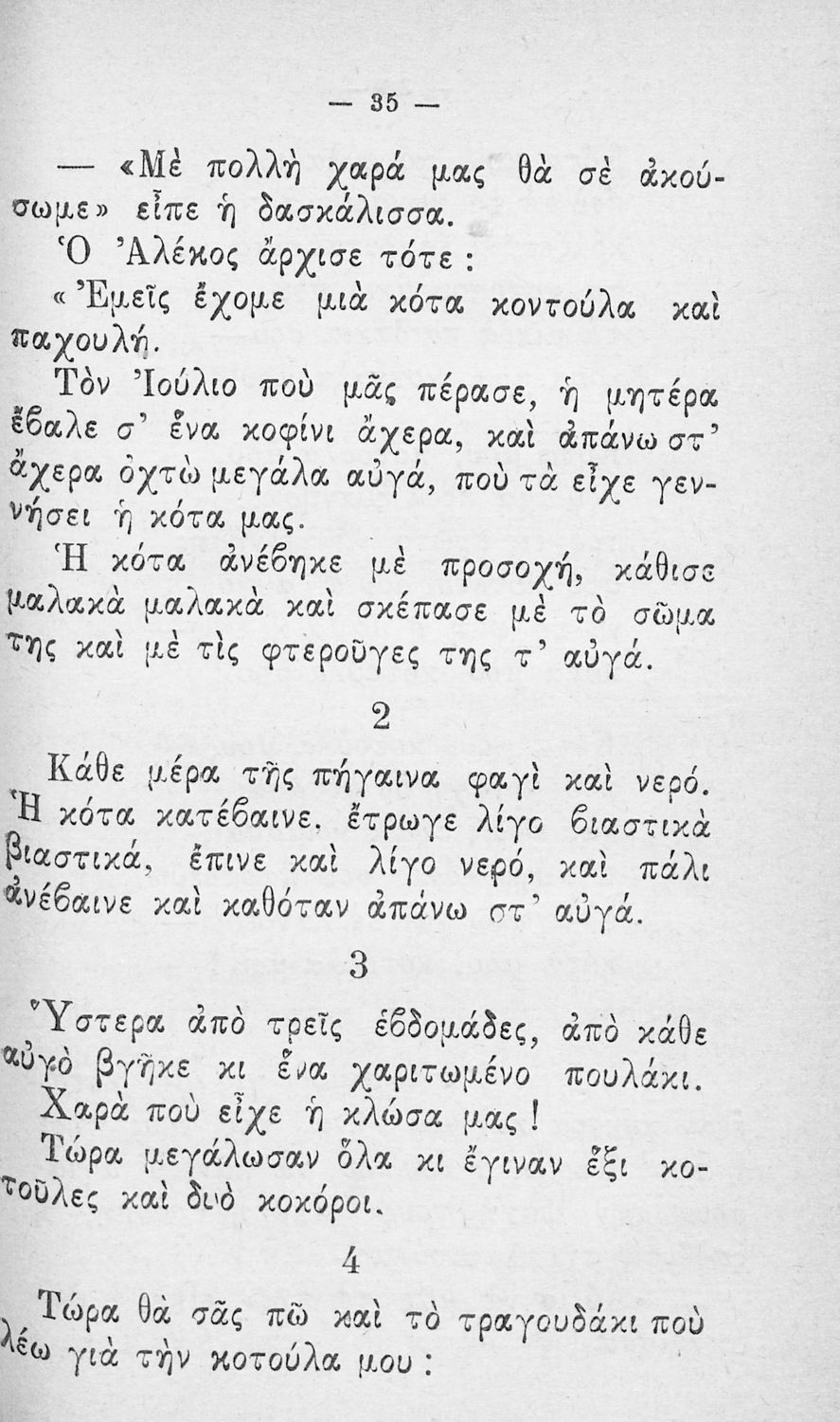 Αναγνωστικό [Α΄ Δημοτικού] που περιλαμβάνει ποιηματάκια και ιστοριούλες και αντλεί τη θεματολογία του από καθημερινά περιστατικά, την ελληνική ύπαιθρο και την ελληνική οικογένεια.