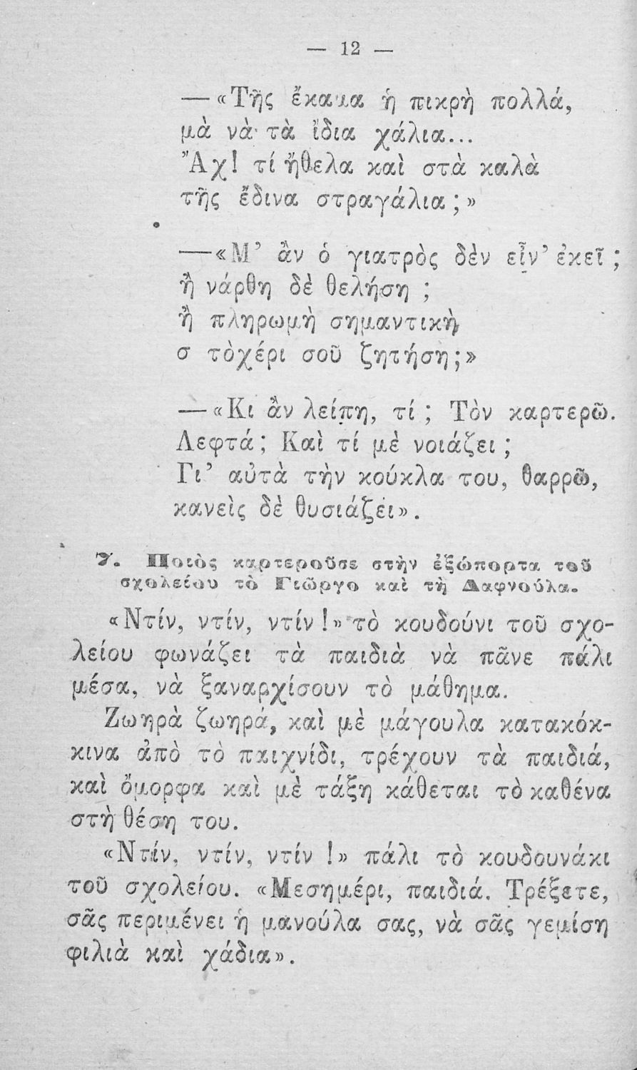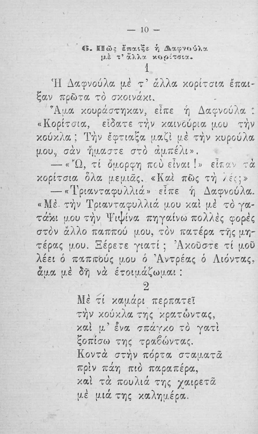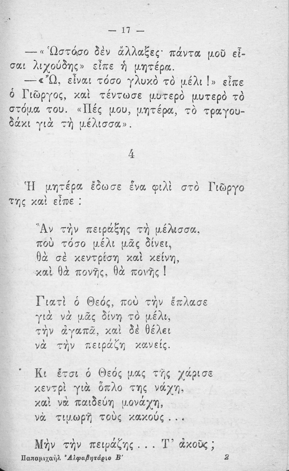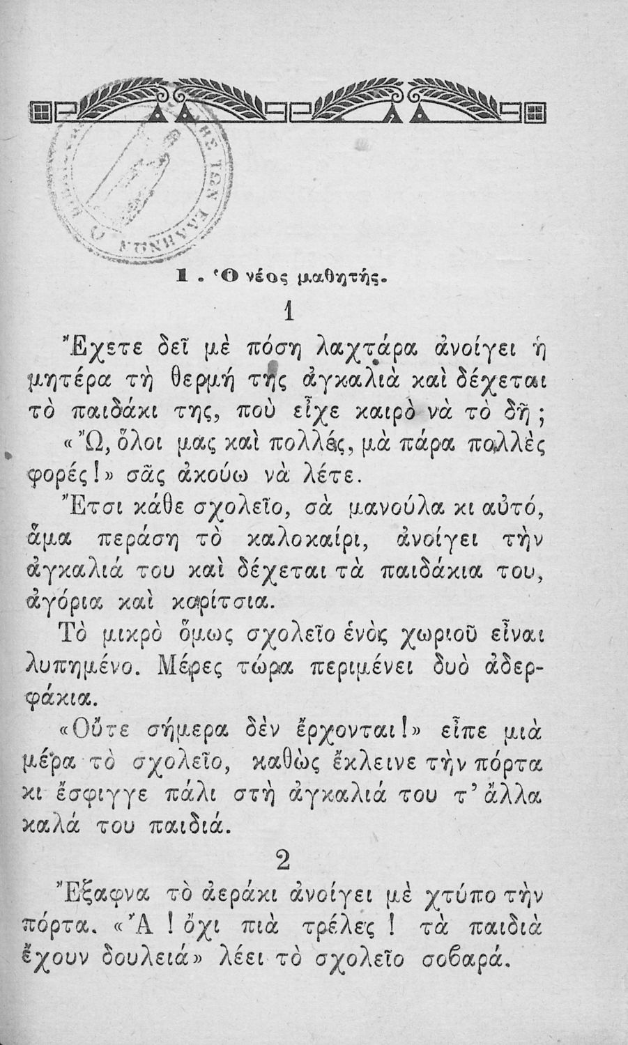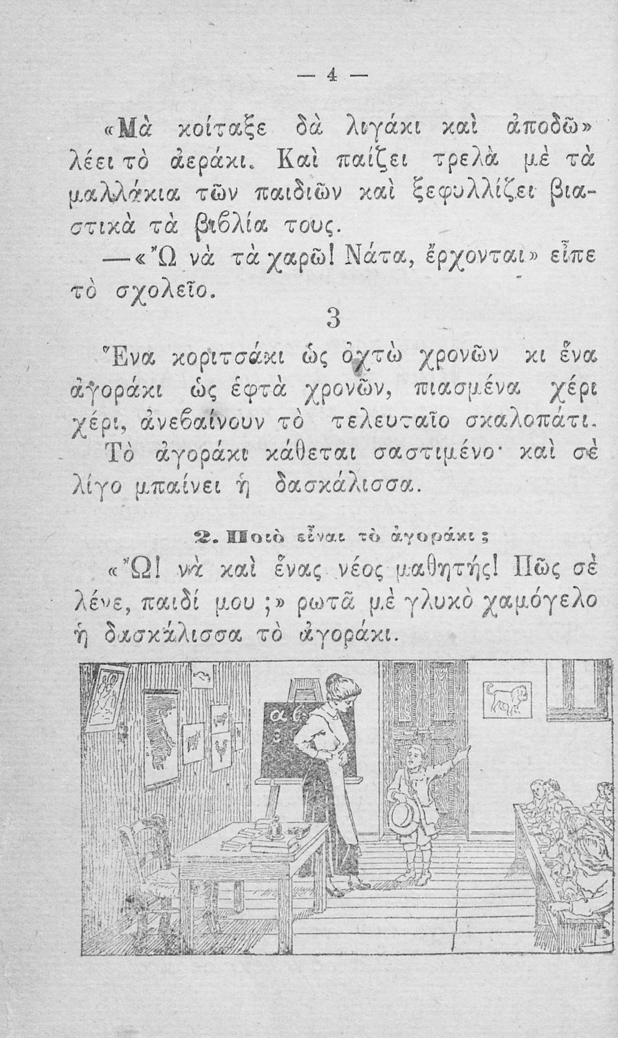 Βαθμίδα εκπαίδευσης: Πρωτοβάθμια Τάξη: Α' Δημοτικού Μάθημα: Νέα Ελληνικά Γλώσσα: Απλή καθαρεύουσα Παρουσίαση περιεχομένου: Αναγνωστικό Α΄ Δημοτικού που περιέχει γράμματα, συλλαβές και μικρά κείμενα εμπνευσμένα από την καθημερινή ζωή των παιδιών και την ελληνική φύση. |