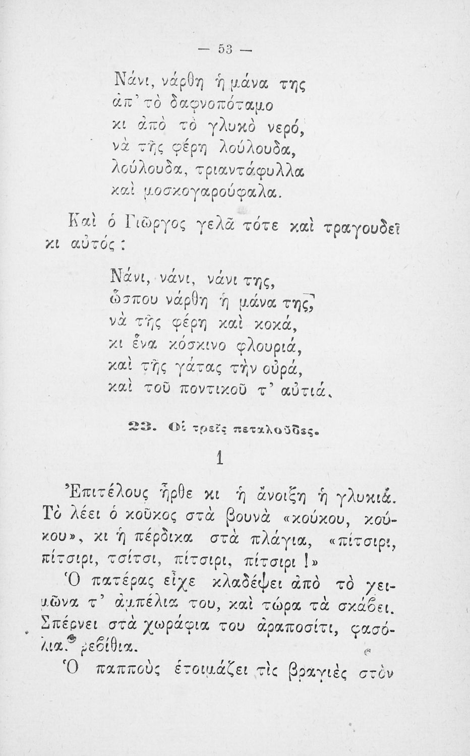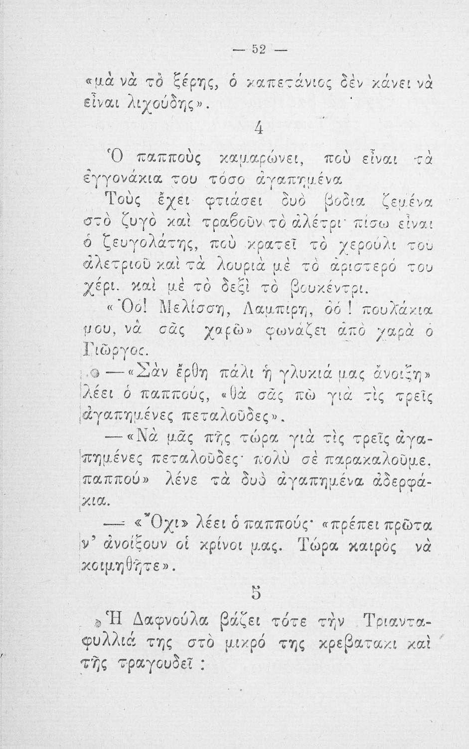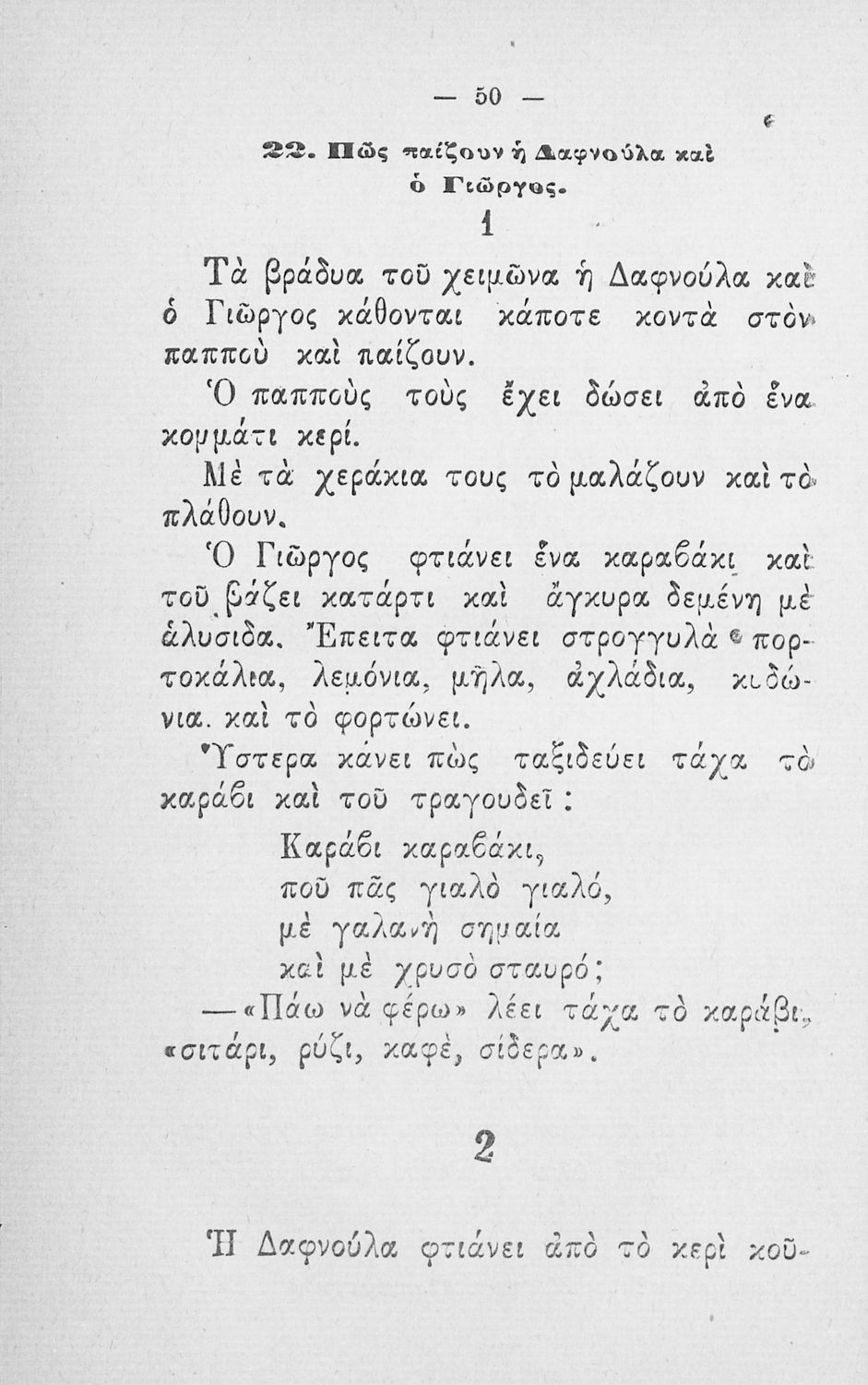 Αναγνωστικό [Α΄ Δημοτικού] που περιλαμβάνει ποιηματάκια και ιστοριούλες και αντλεί τη θεματολογία του από καθημερινά περιστατικά, την ελληνική ύπαιθρο και την ελληνική οικογένεια.