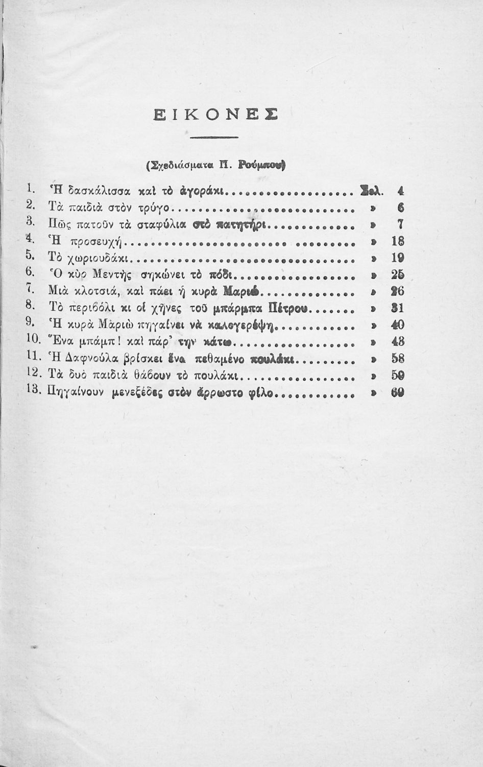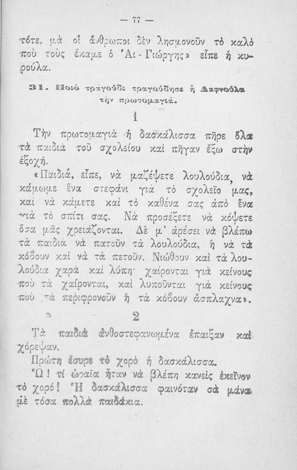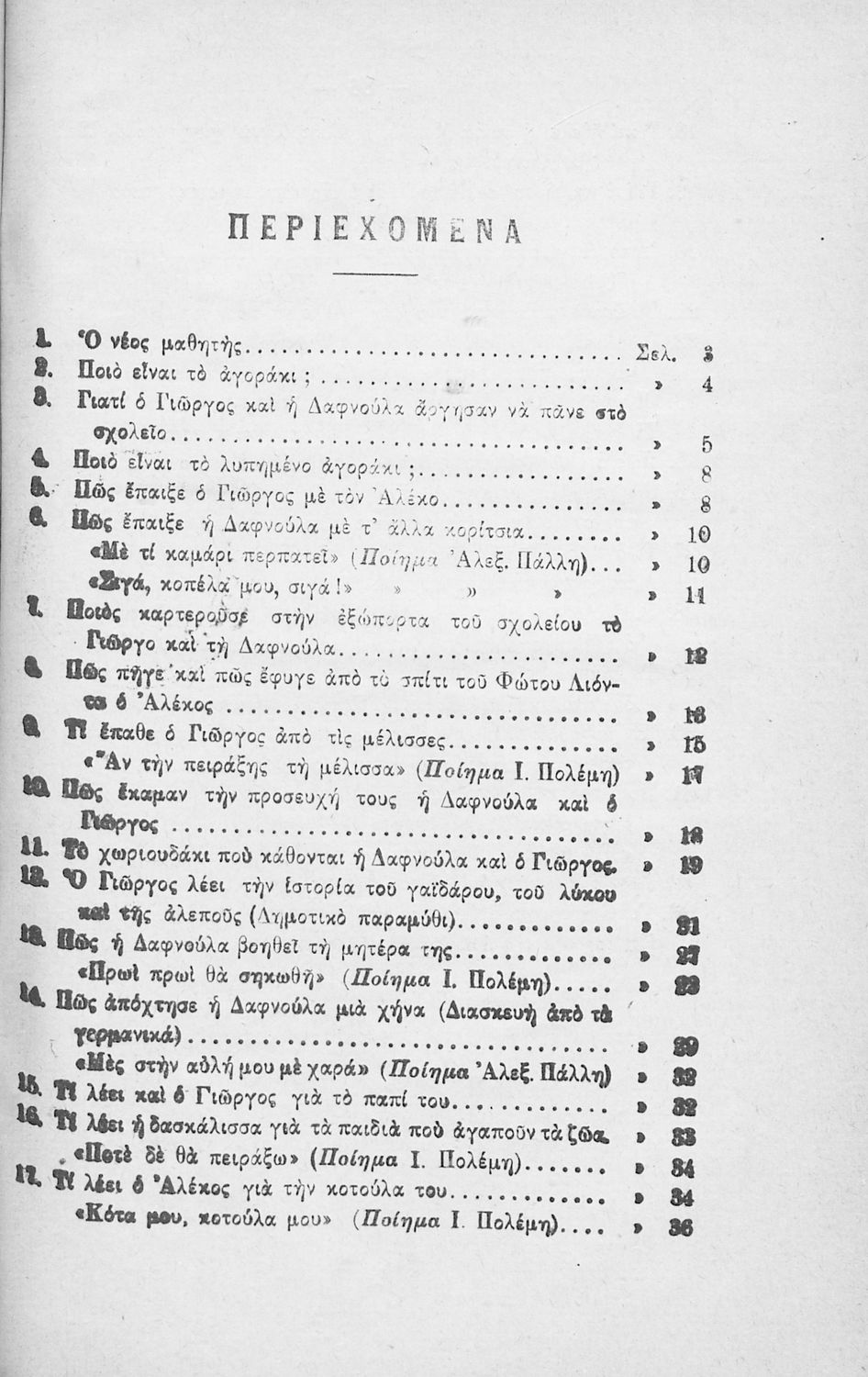 Αναγνωστικό Α΄ Δημοτικού που περιέχει μικρές αφηγηματικές ιστορίες και ποιήματα του Πάλλη και του Πολέμη με ηθικοπλαστικό περιεχόμενο.
