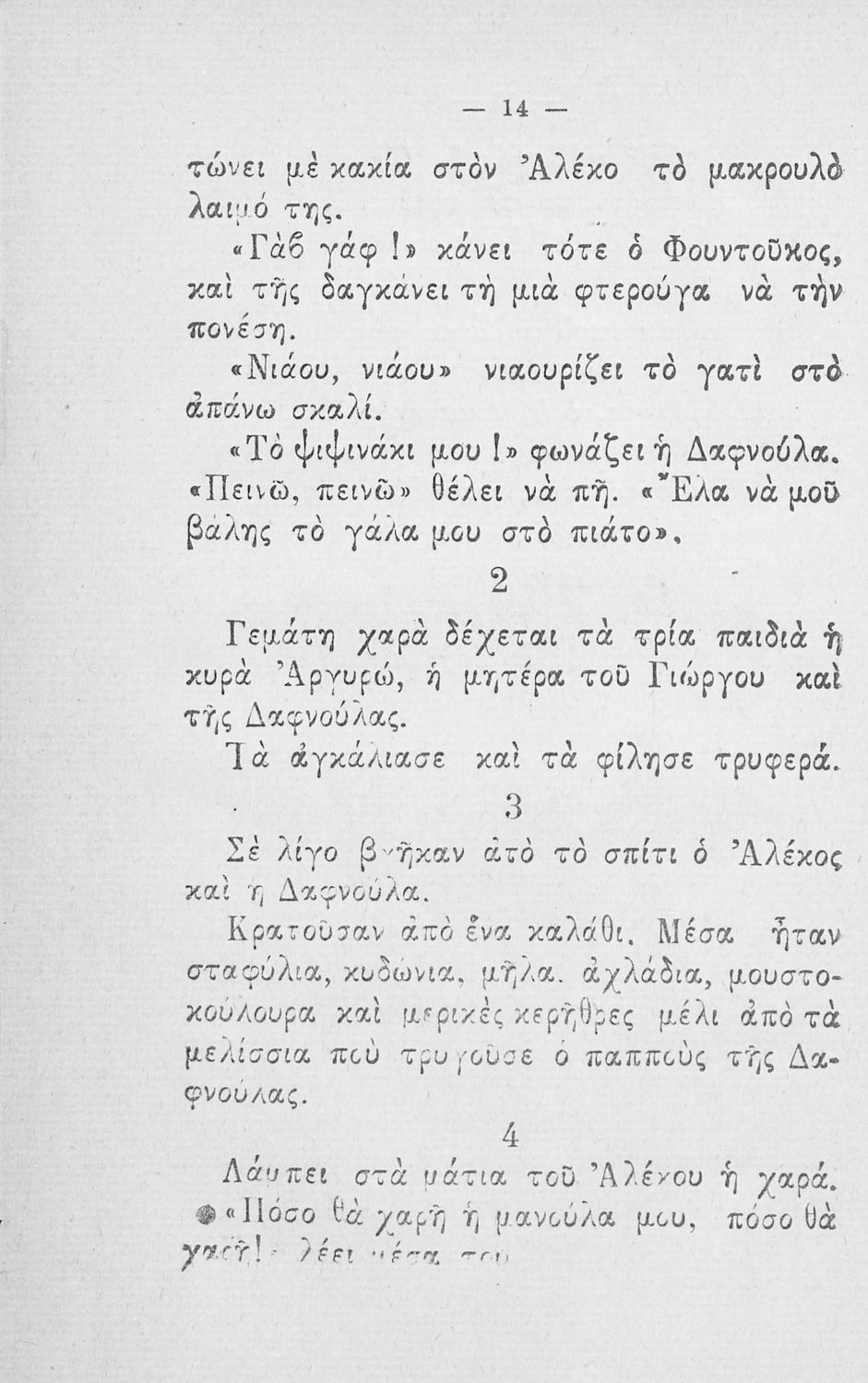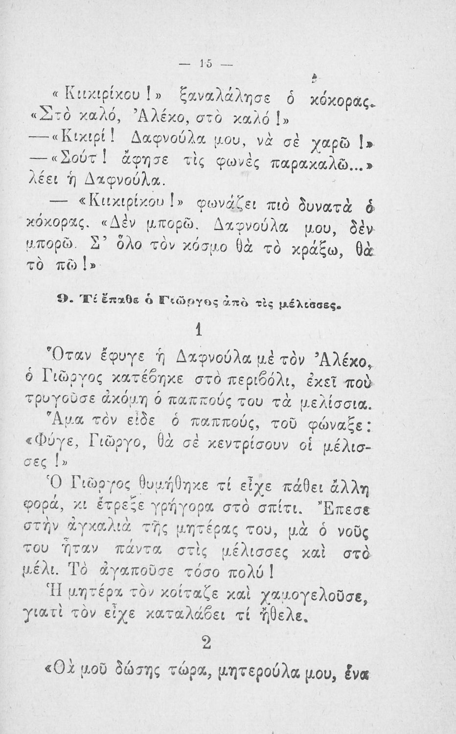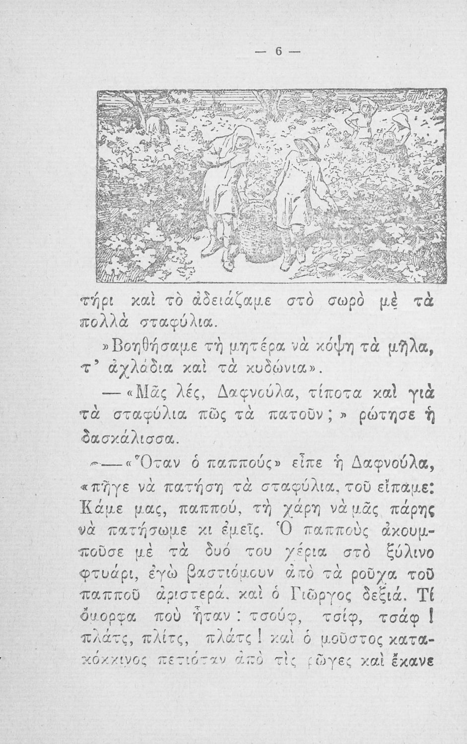 Αναγνωστικό [Α΄ Δημοτικού] που περιλαμβάνει ποιηματάκια και ιστοριούλες και αντλεί τη θεματολογία του από καθημερινά περιστατικά, την ελληνική ύπαιθρο και την ελληνική οικογένεια.