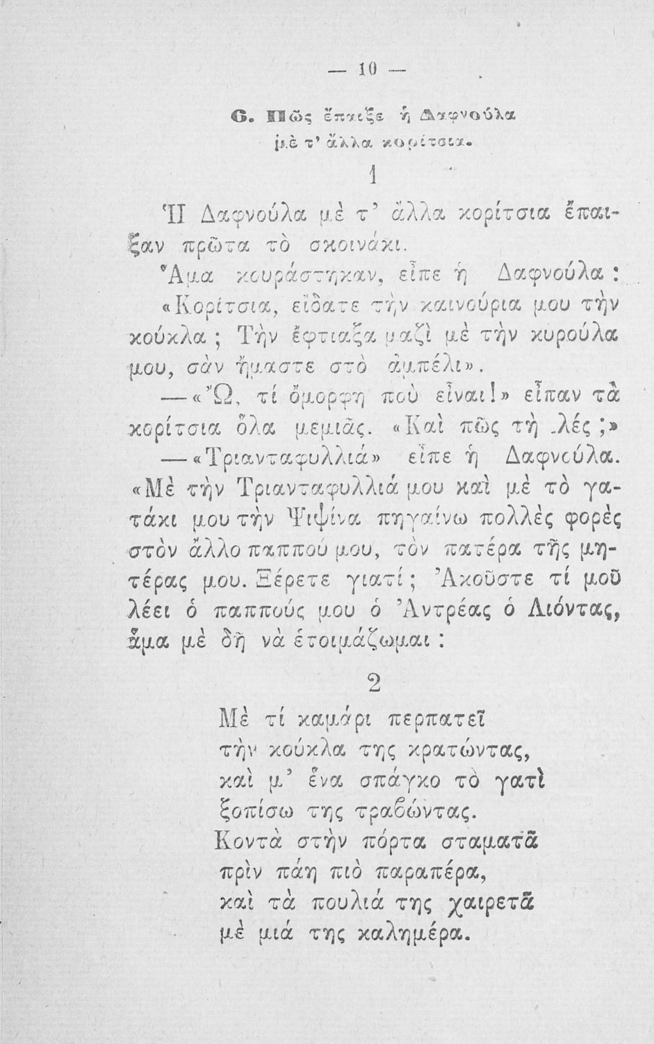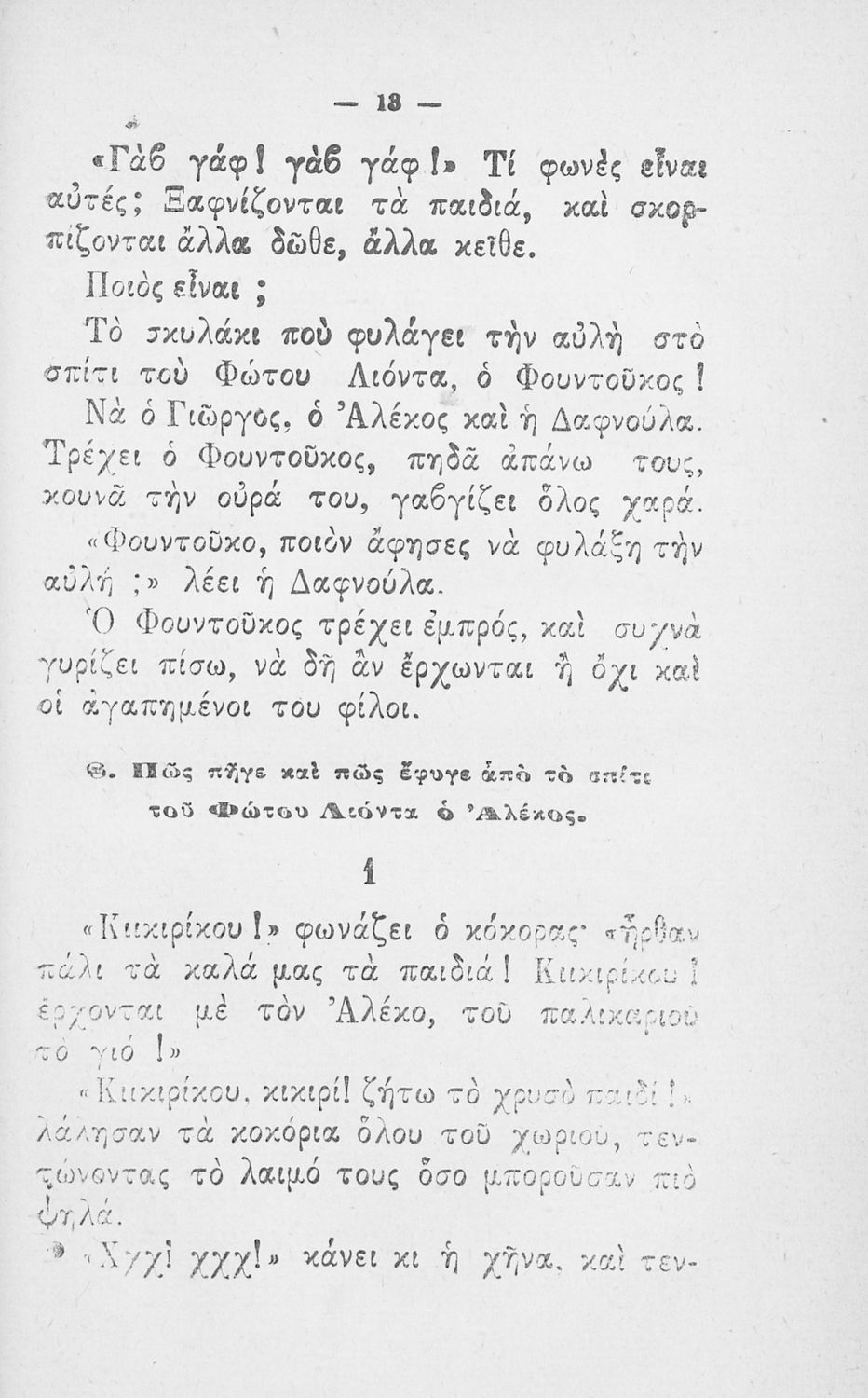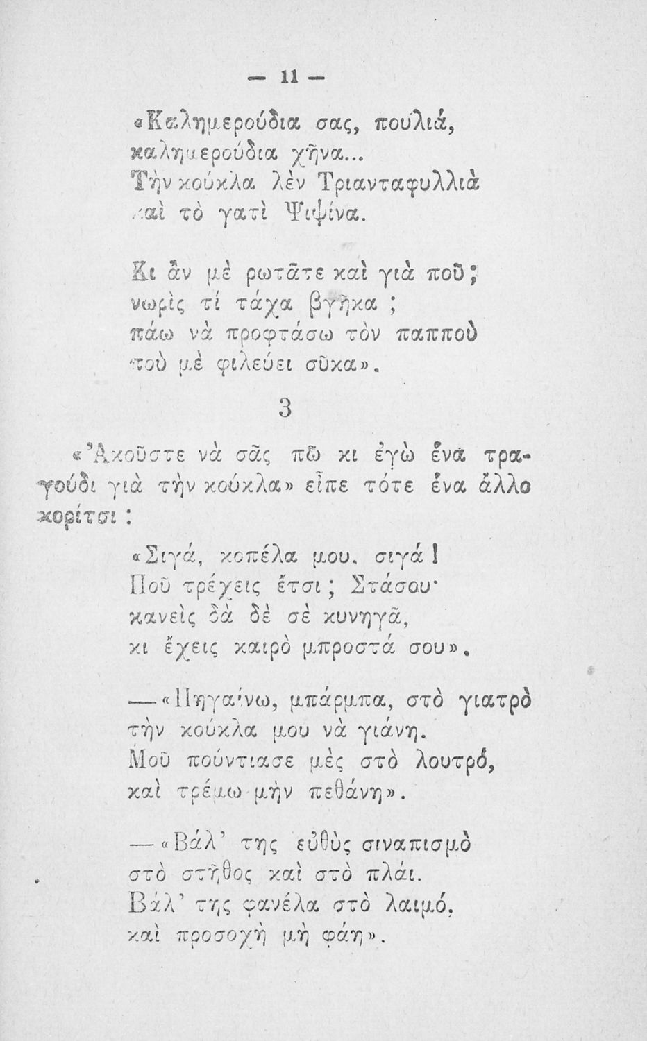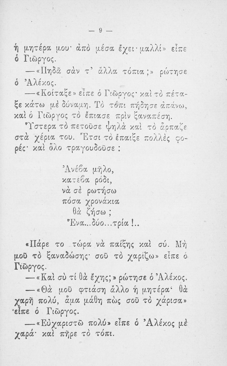 Αναγνωστικό [Α΄ Δημοτικού] που περιλαμβάνει ποιηματάκια και ιστοριούλες και αντλεί τη θεματολογία του από καθημερινά περιστατικά, την ελληνική ύπαιθρο και την ελληνική οικογένεια.