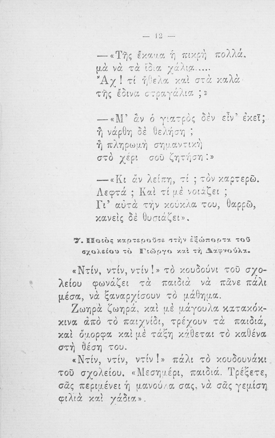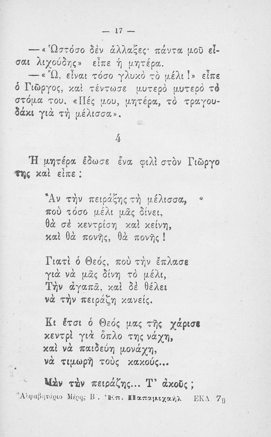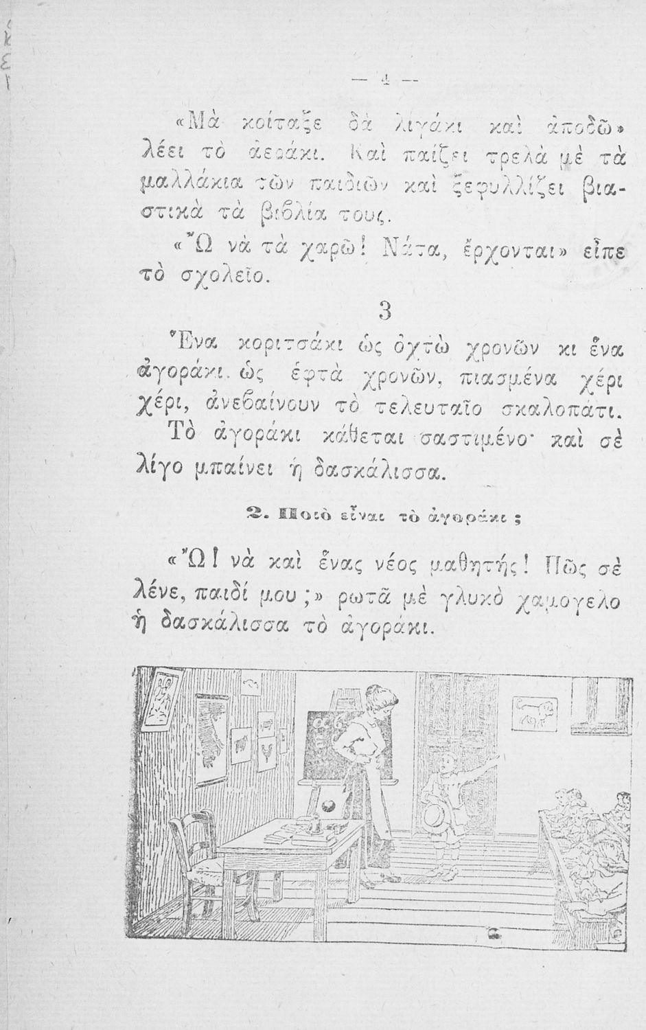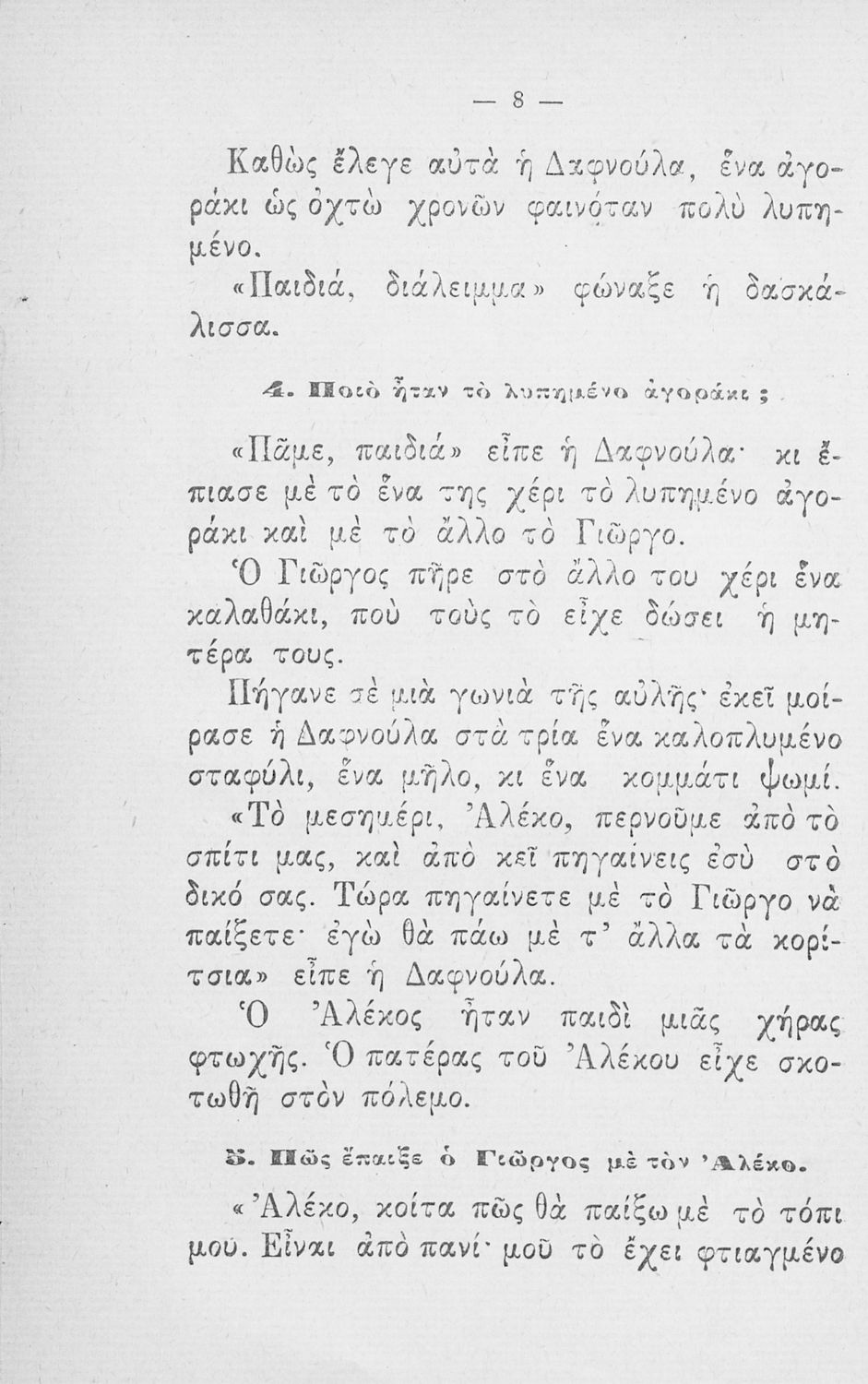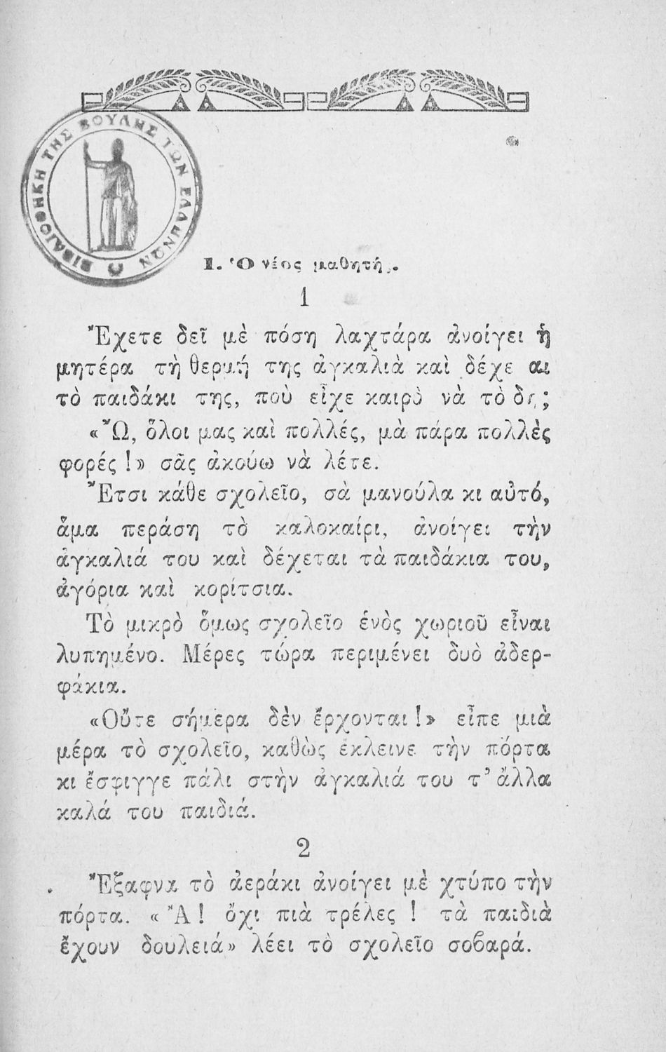 Αναγνωστικό Α΄ Δημοτικού που περιέχει μικρές αφηγηματικές ιστορίες και ποιήματα του Πάλλη και του Πολέμη με ηθικοπλαστικό περιεχόμενο.