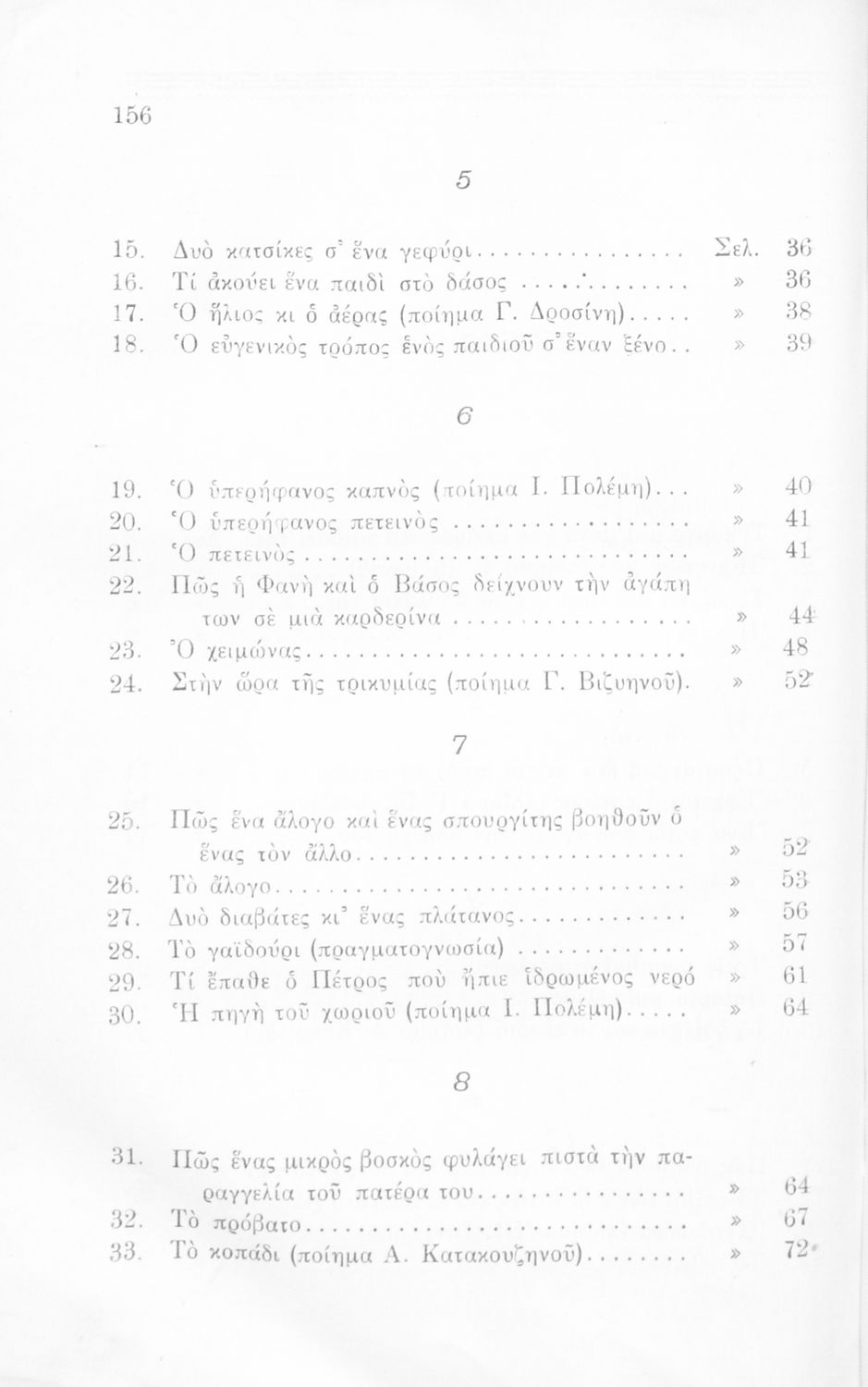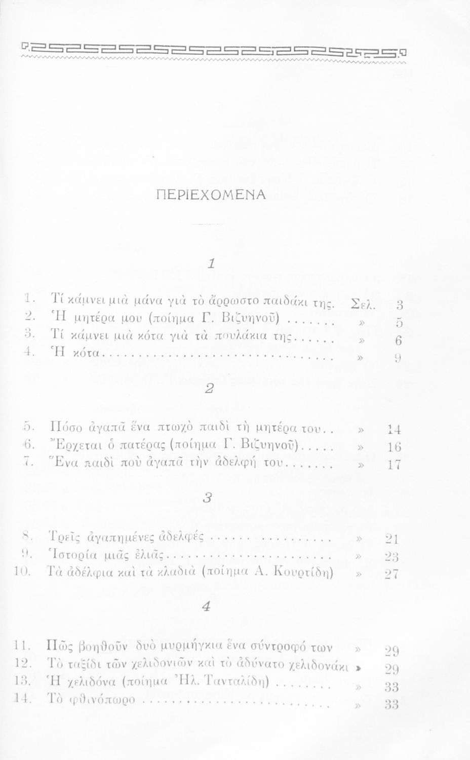 Αναγνωστικό Β' Δημοτικού που περιλαμβάνει ποιήματα και πεζά εμπνευσμένα από την καθημερινή ζωή, την ελληνική μυθολογία, την ελληνική φύση και τη θρησκευτική παράδοση.
