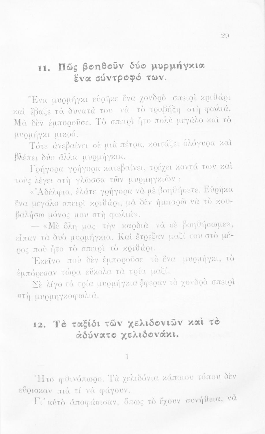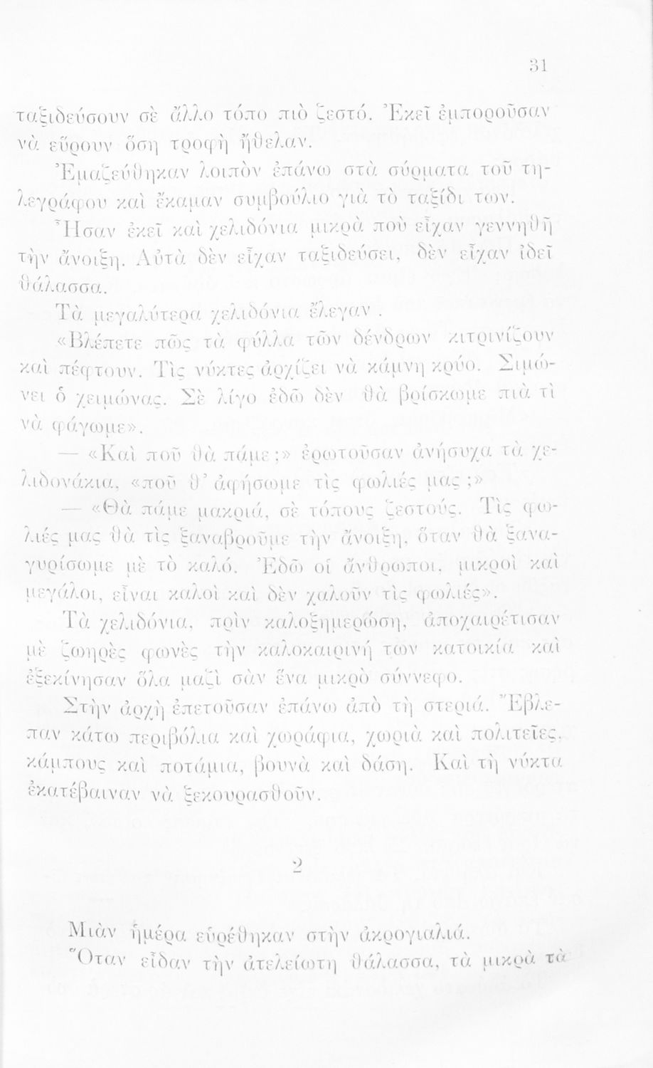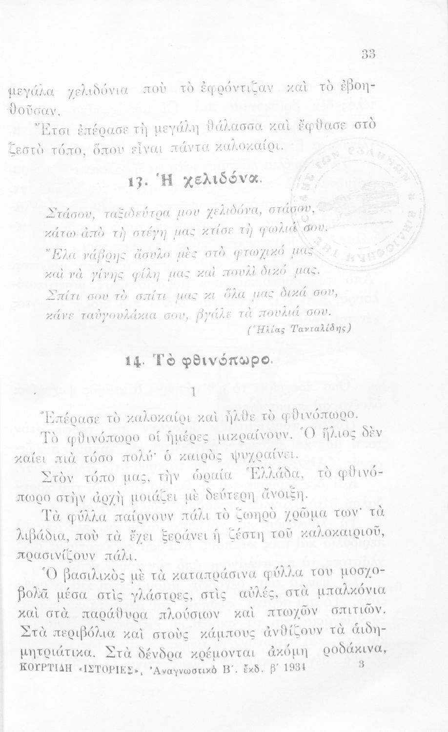 Αναγνωστικό Β' Δημοτικού που περιλαμβάνει μικρά διηγήματα και ποιήματα με περιεχόμενο από την οικογενειακή και κοινωνική ζωή, την ελληνική φύση, την ελληνική ιστορία και μυθολογία και την υγιεινή.