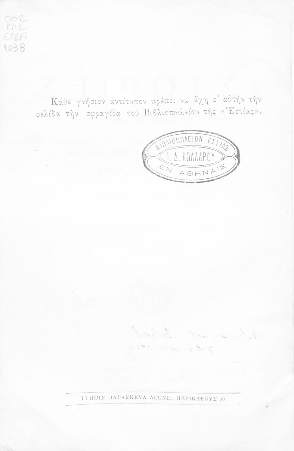 Εκδότης: Ιωάννης Δ. Κολλάρος και ΣΙΑ, Βιβλιοπωλείο της "Εστίας"