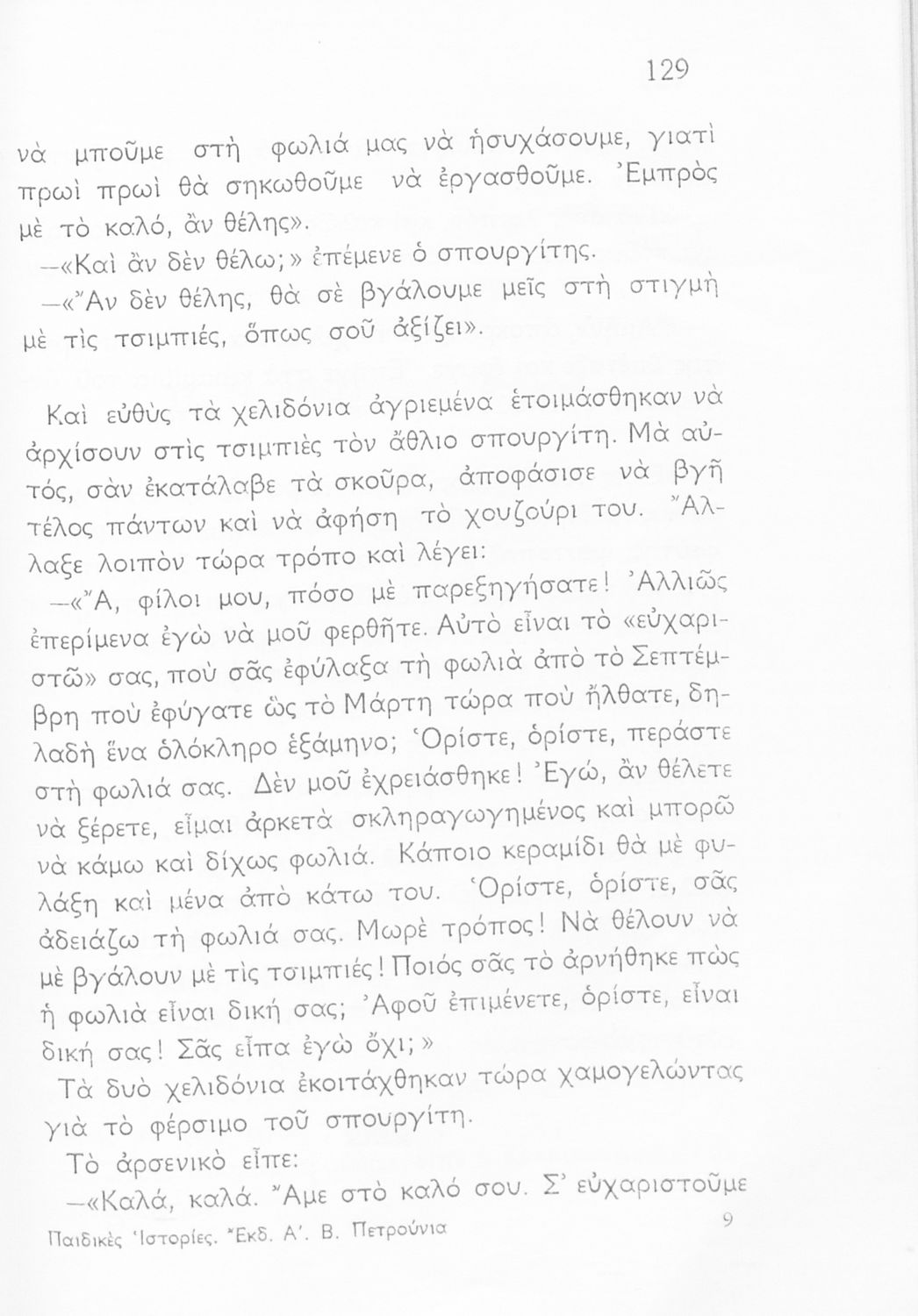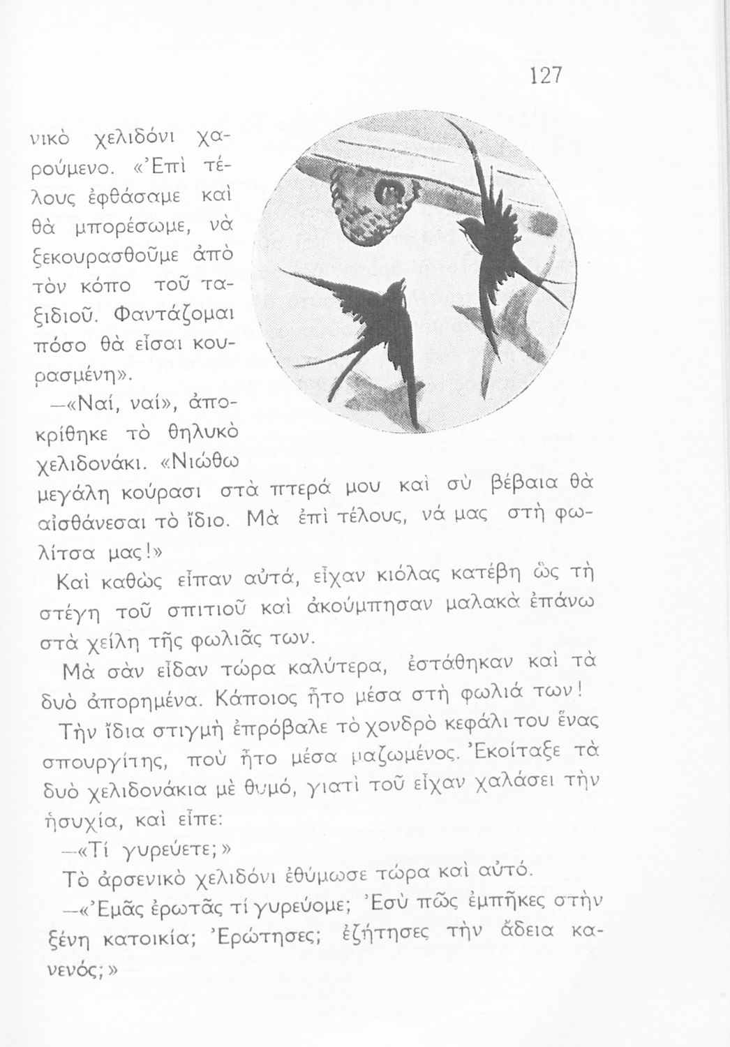 Αναγνωστικό Β' Δημοτικού που περιλαμβάνει μικρά διηγήματα και ποιήματα με περιεχόμενο από την οικογενειακή και κοινωνική ζωή, την ελληνική φύση, την ελληνική ιστορία και μυθολογία και την υγιεινή.