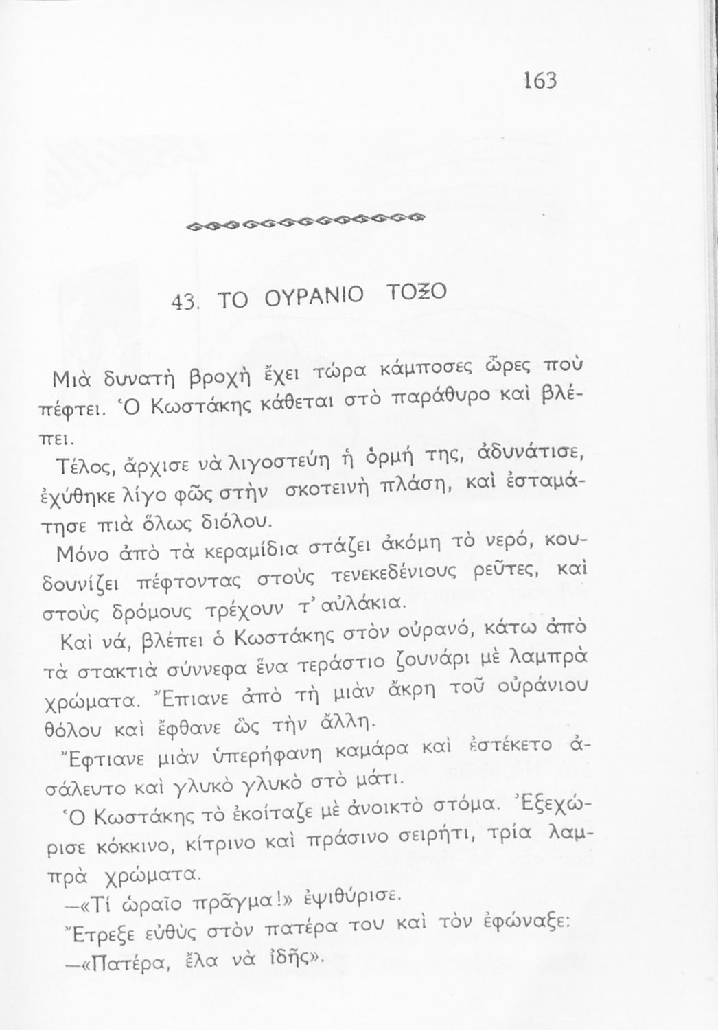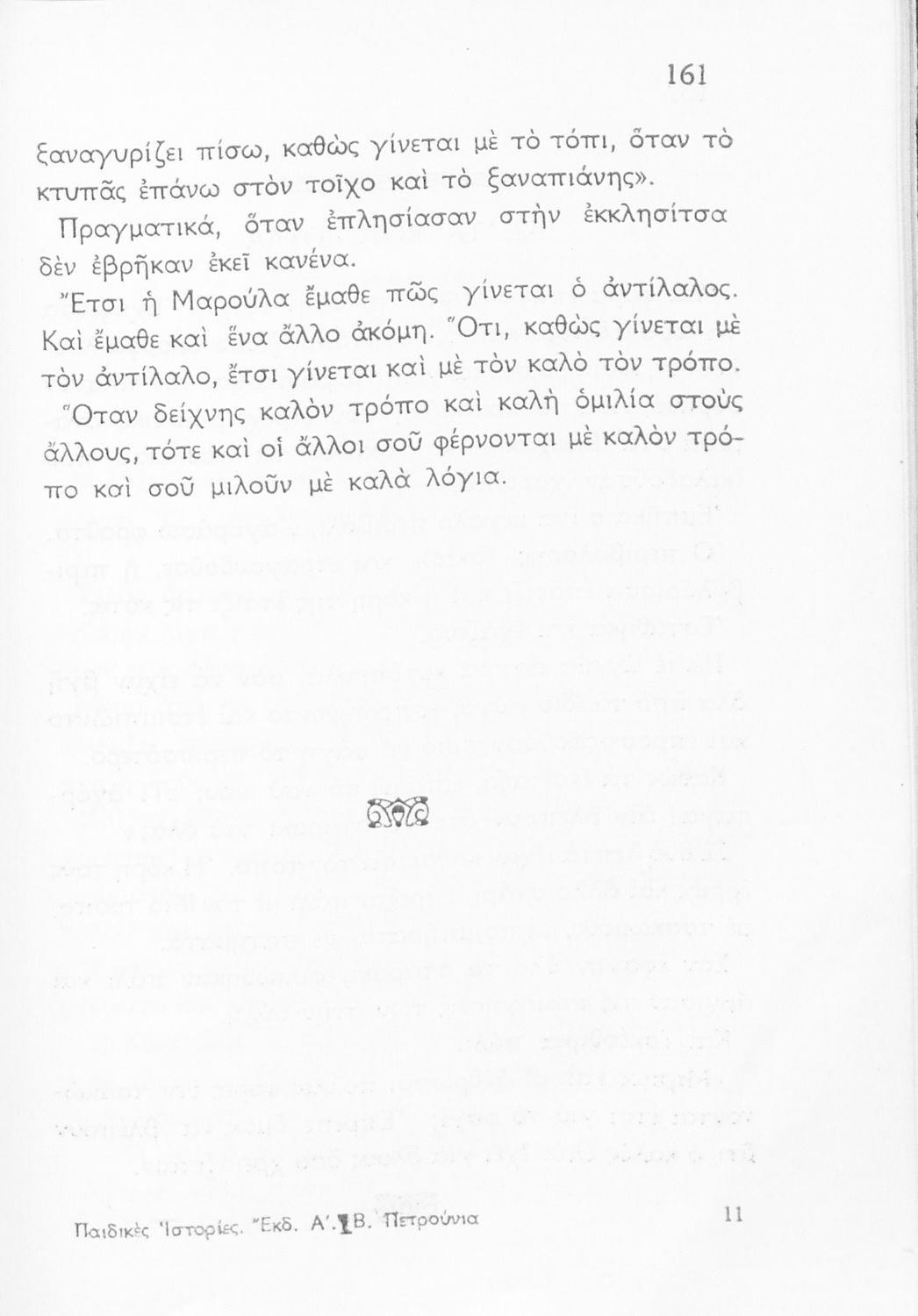 Αναγνωστικό Β' Δημοτικού που περιλαμβάνει μικρά διηγήματα και ποιήματα με περιεχόμενο από την οικογενειακή και κοινωνική ζωή, την ελληνική φύση, την ελληνική ιστορία και μυθολογία και την υγιεινή.