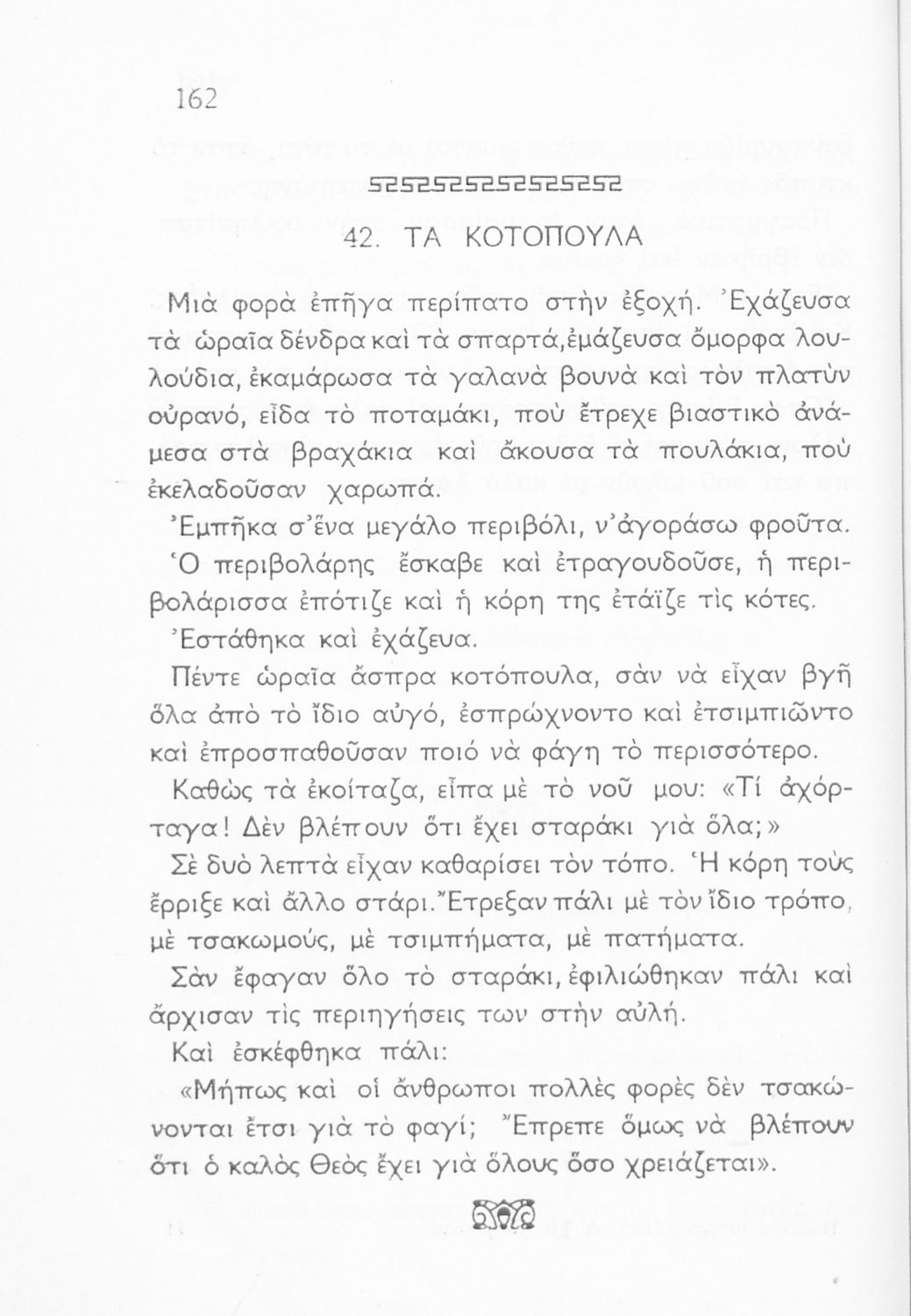 Αναγνωστικό Β' Δημοτικού για το μάθημα της Γλώσσας. Περιέχει πεζά και ποιήματα. Τα κείμενα είναι κατά θεματικές από τη θρησκευτικό, εθνικό, κοινωνικό και ατομικό βίο. Επίσης, περιλαμβάνονται κείμενα από την ελληνική φύση, την ιστορία, τη μυθολογία και την υγιεινή. Όλα τα κείμενα περιέχουν ηθικά διδάγματα. Οι εικόνες εξυπηρετούν τη διδασκαλία καθώς οπτικοποιούν τα κείμενα.