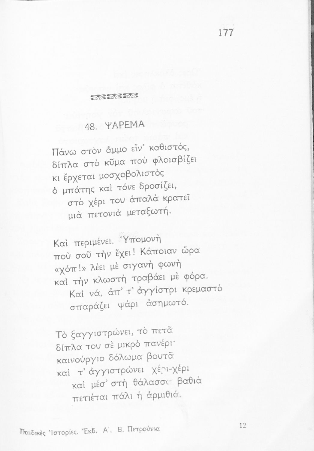 Αναγνωστικό Β' Δημοτικού που περιλαμβάνει ποιήματα και πεζά εμπνευσμένα από την καθημερινή ζωή, την ελληνική μυθολογία, την ελληνική φύση και τη θρησκευτική παράδοση.