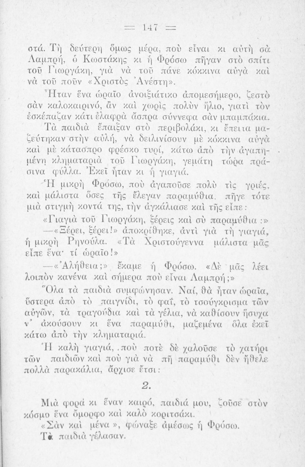 Αναγνωστικό Β' Δημοτικού που περιλαμβάνει ποιήματα και πεζά εμπνευσμένα από την καθημερινή ζωή, την ελληνική μυθολογία, την ελληνική φύση και τη θρησκευτική παράδοση.