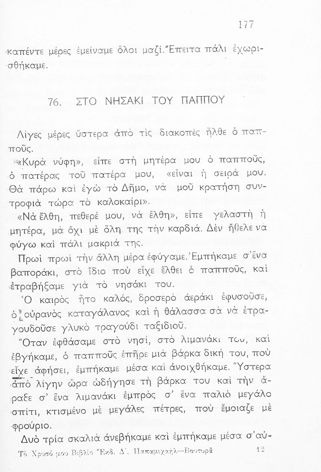Αναγνωστικό Β΄ Δημοτικού που αποτελείται από πεζά γραμμένα σε καθαρεύουσα και ποιήματα σε δημοτική εμπνευσμένα από την οικογένεια, τη θρησκεία, την πατρίδα, την ελληνική φύση και ύπαιθρο, την αγάπη για τα ζώα,