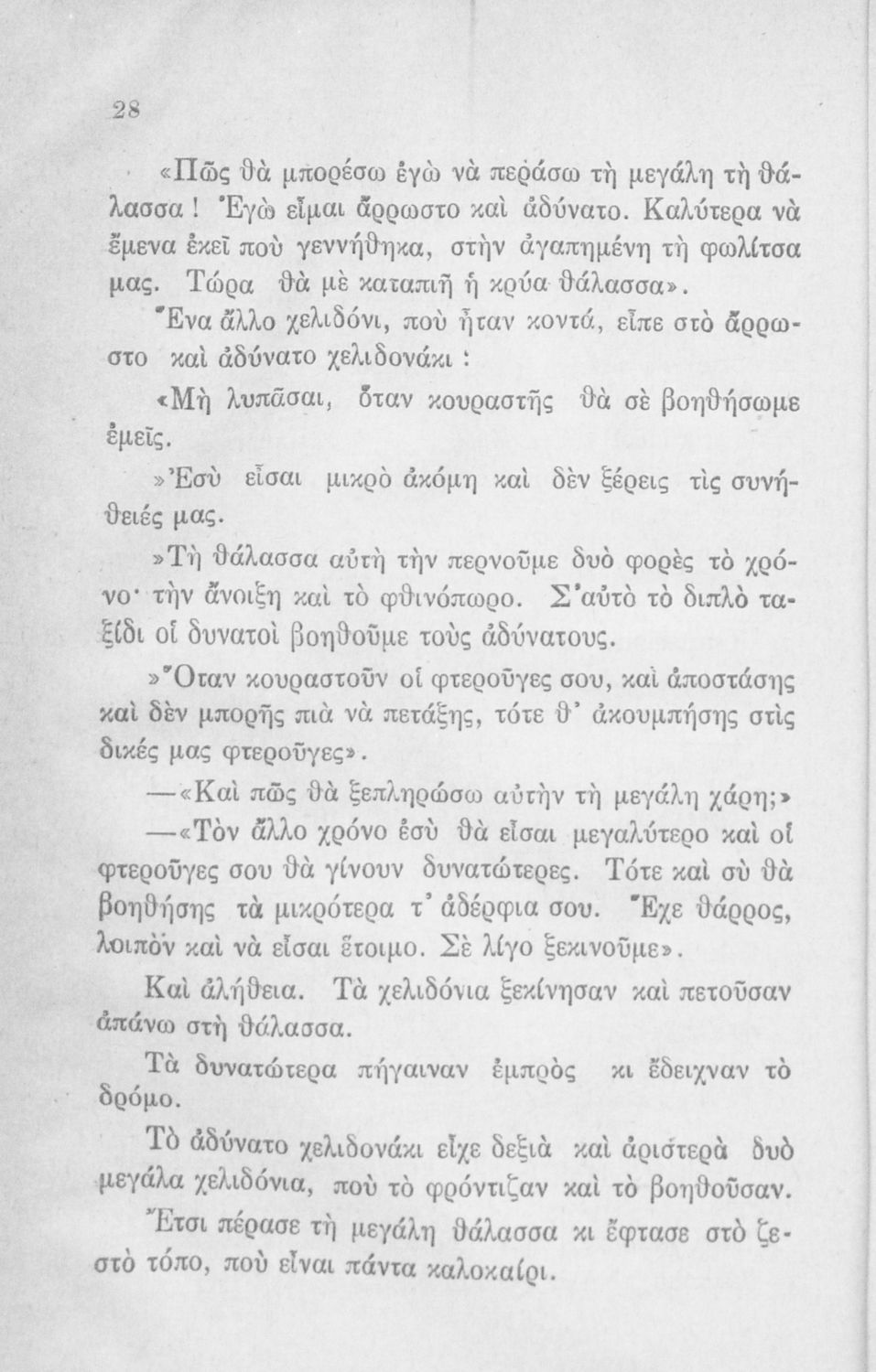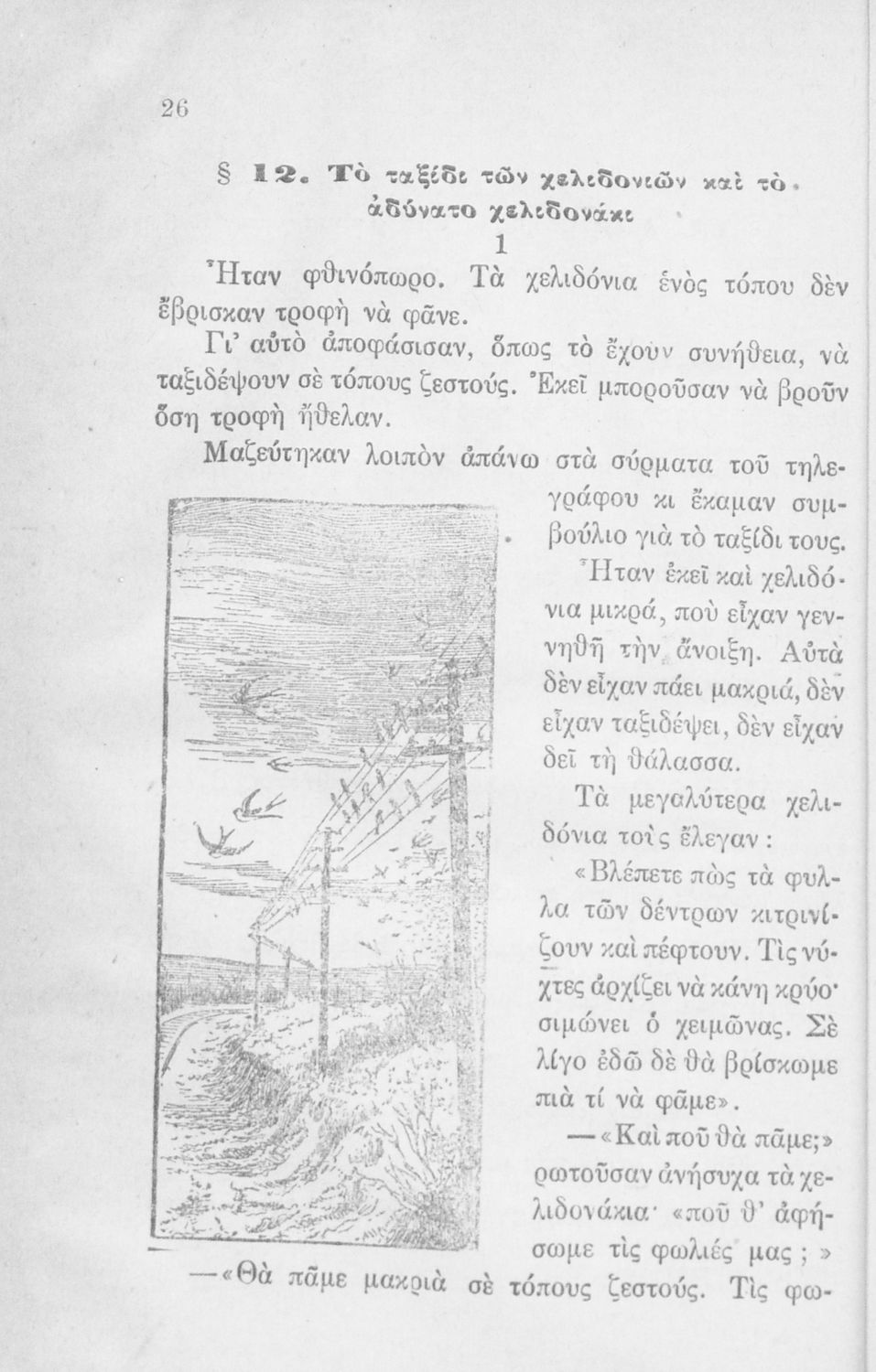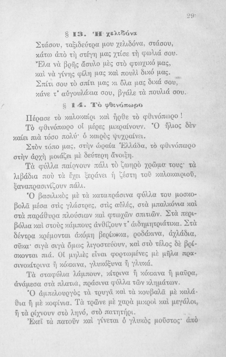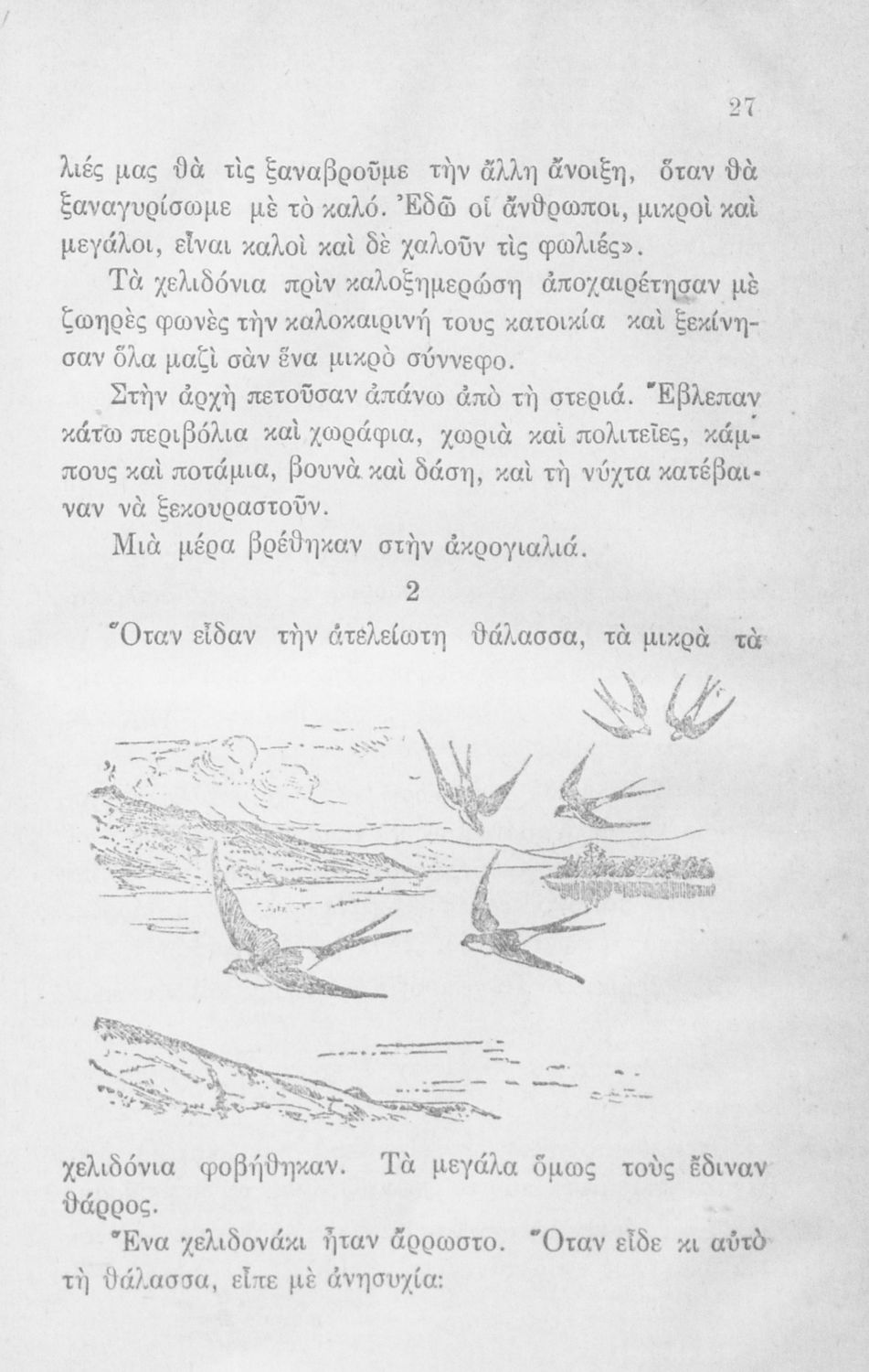 Αναγνωστικό Β' Δημοτικού που περιλαμβάνει μικρά διηγήματα και ποιήματα με περιεχόμενο από την οικογενειακή και κοινωνική ζωή, την ελληνική φύση, την ελληνική ιστορία και μυθολογία και την υγιεινή.