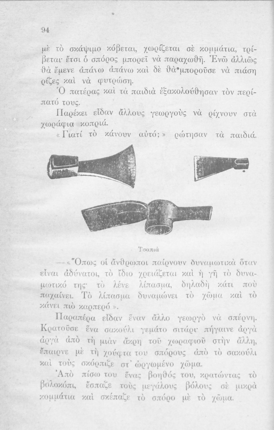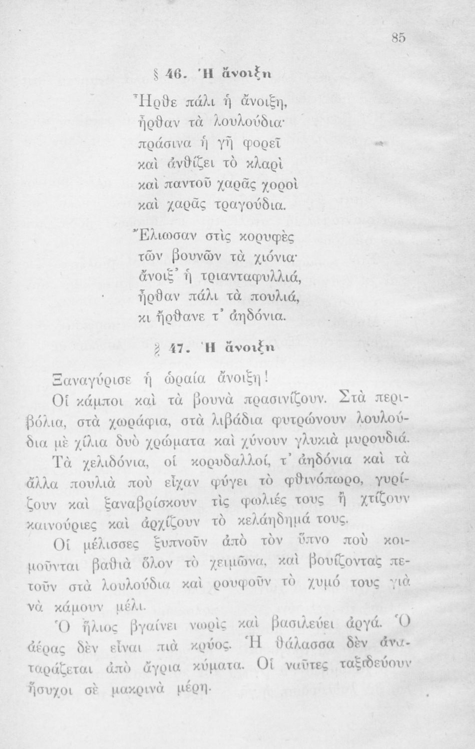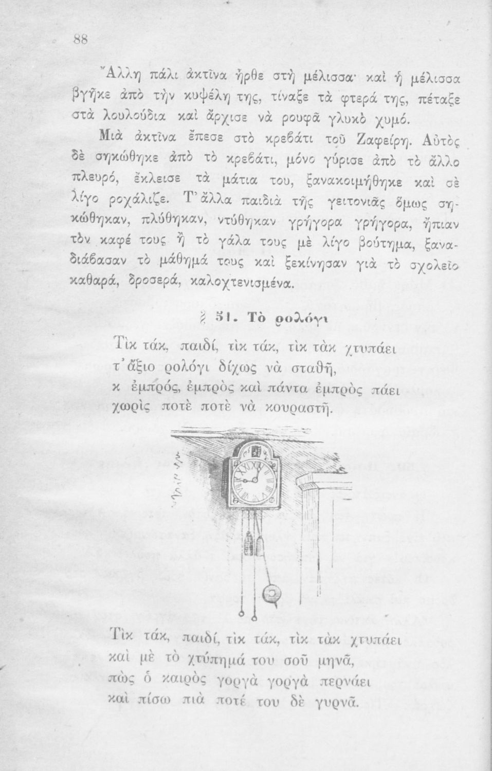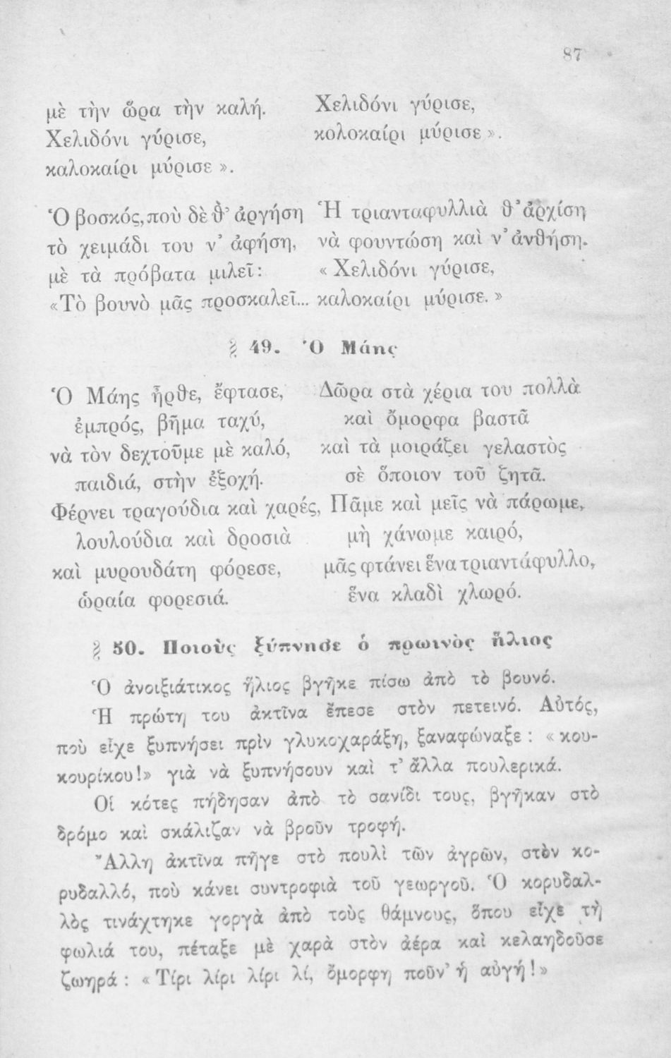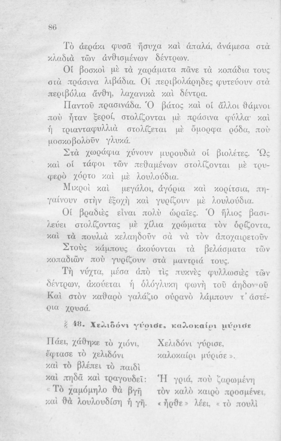 Αναγνωστικό Β' Δημοτικού που περιλαμβάνει μικρά διηγήματα και ποιήματα με περιεχόμενο από την οικογενειακή και κοινωνική ζωή, την ελληνική φύση, την ελληνική ιστορία και μυθολογία και την υγιεινή.