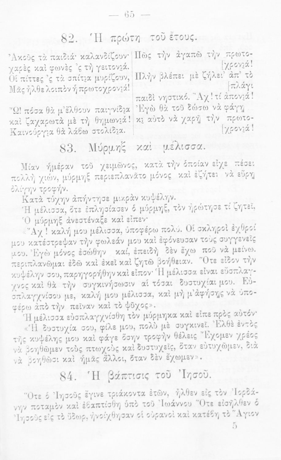 Σχολικό εγχειρίδιο Αρχαίων Ελληνικών Β΄ Ελληνικού Σχολείου και Γ' Δημοτικού που περιλαμβάνει σύντομα κείμενα προσαρμοσμένα στη διδασκαλία των γραμματικών φαινομένων, λεξιλόγιο και ασκήσεις.