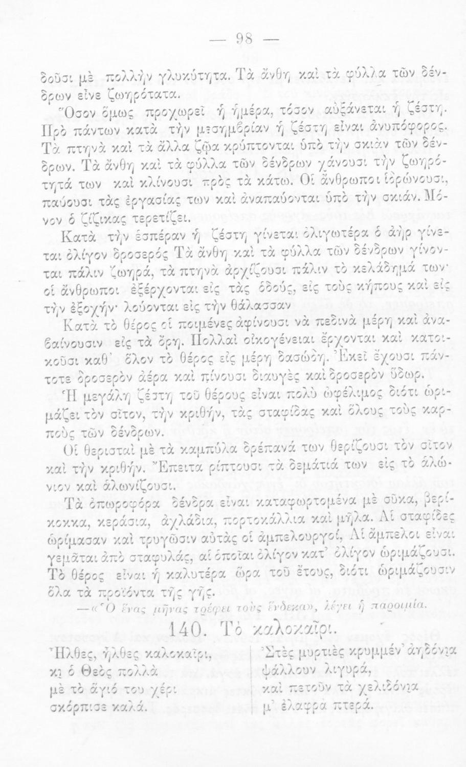 Αναγνωστικό Β΄ Δημοτικού που περιλαμβάνει διηγήματα και ποιήματα εμπνευσμένα από την οικογενειακή ζωή, τη θρησκευτική πίστη και παράδοση, τις ασχολίες και επαγγέλματα των ανθρώπων, την αγάπη για την φύση και τα ζώα, τις εποχές του χρόνους, τις ηθικές αρετές, την ελληνική μυθολογία και την αρχαία Ελλάδα.
