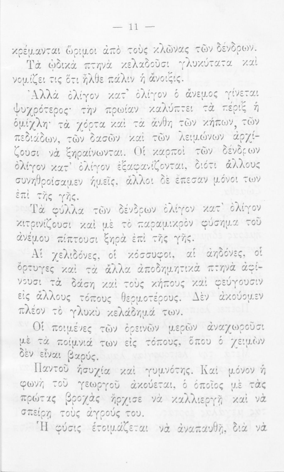 Αναγνωστικό Β΄ Δημοτικού που περιλαμβάνει διηγήματα και ποιήματα εμπνευσμένα από την οικογενειακή ζωή, τη θρησκευτική πίστη και παράδοση, τις ασχολίες και επαγγέλματα των ανθρώπων, την αγάπη για την φύση και τα ζώα, τις εποχές του χρόνους, τις ηθικές αρετές, την ελληνική μυθολογία και την αρχαία Ελλάδα.