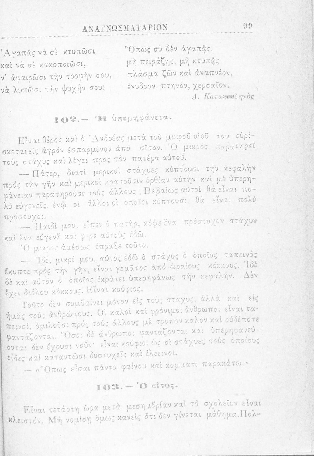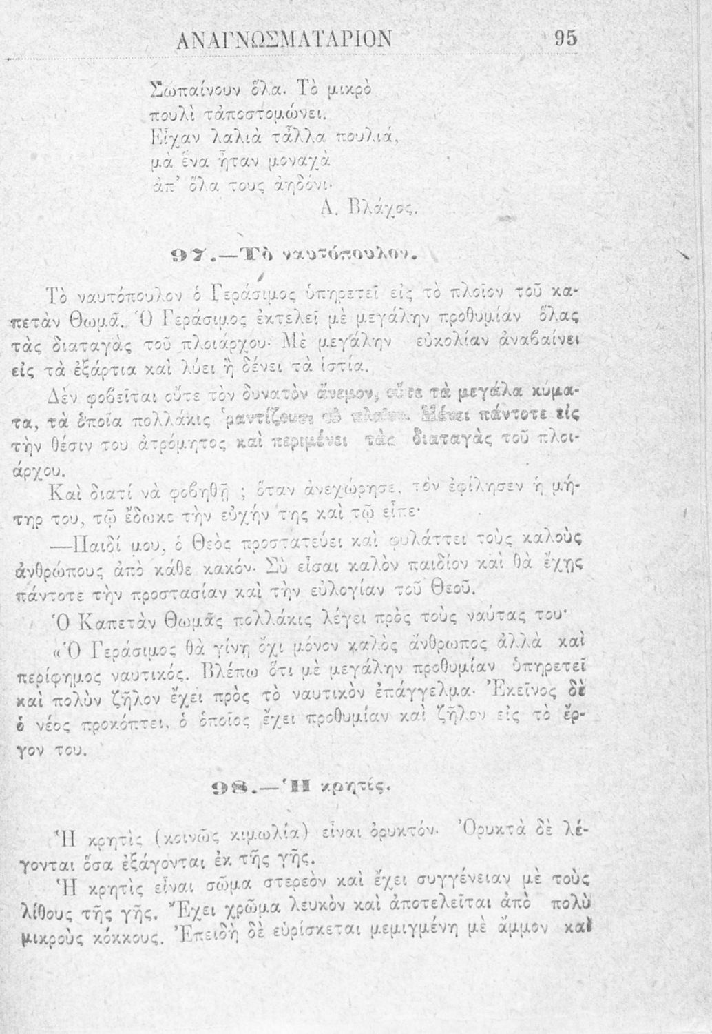 Αναγνωστικό του Δημοτικού. Περιέχει κείμενα της Γαλάτειας Καζαντζάκη. Στο τέλος του βιβλίου υπάρχουν καλλιγραφικά υποδείγματα από το Αναγνωσματάριο του Δημοσθένη Ανδρεάδη.