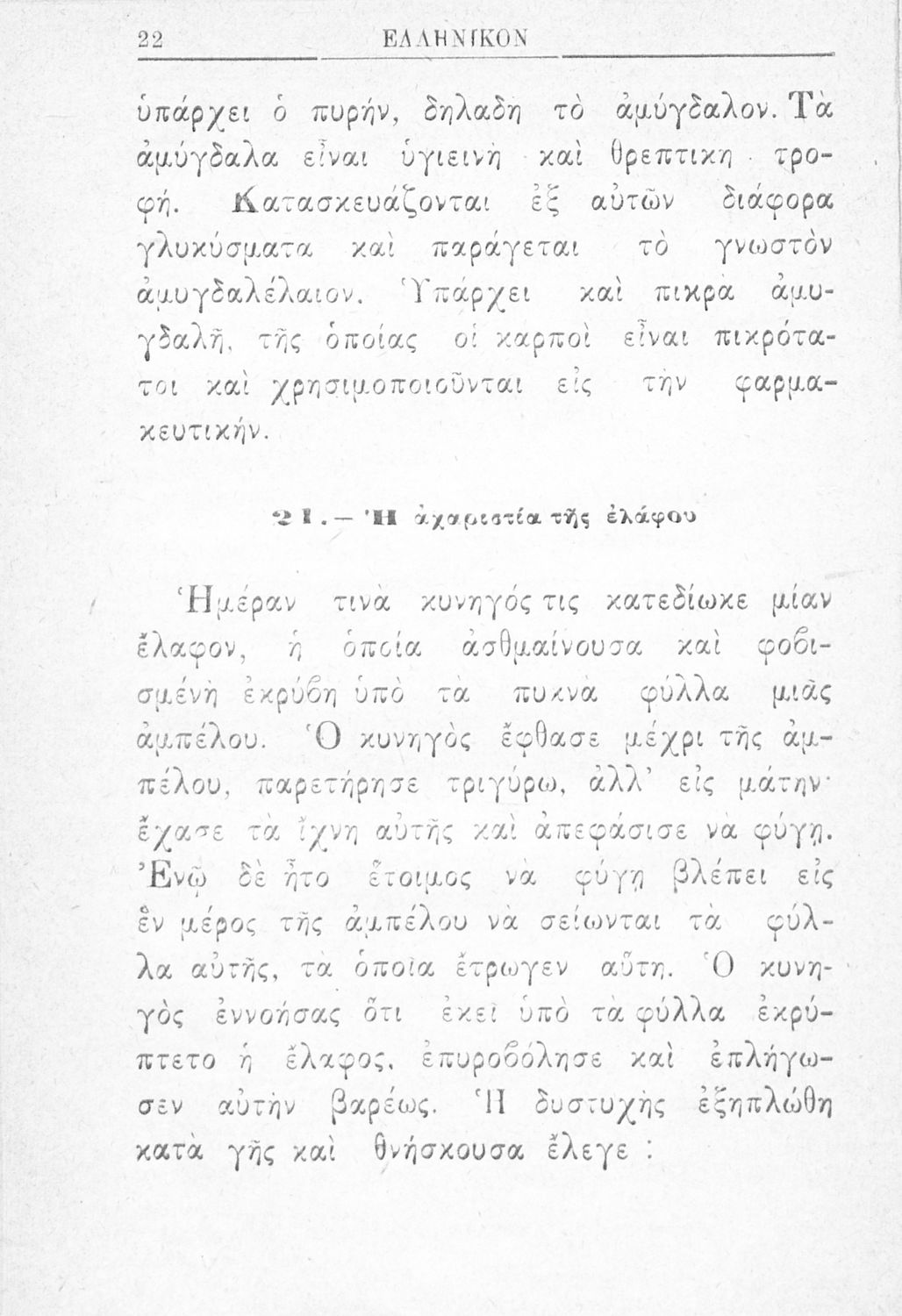 Σχολικό εγχειρίδιο Αρχαίων Ελληνικών Β΄ Ελληνικού Σχολείου και Γ' Δημοτικού που περιλαμβάνει σύντομα κείμενα προσαρμοσμένα στη διδασκαλία των γραμματικών φαινομένων, λεξιλόγιο και ασκήσεις.