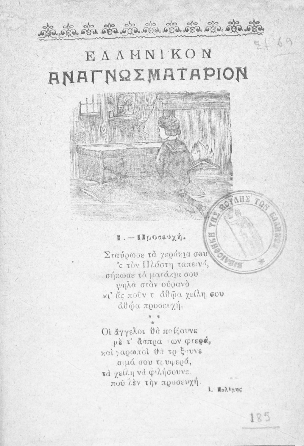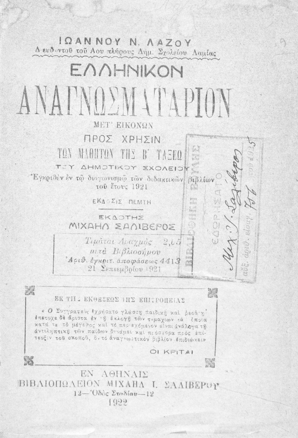 Τίτλος: Ελληνικόν Αναγνωσματάριον μετ' εικόνων. Προς χρήσιν των μαθητών της Β' τάξεως του Δημοτικού Σχολείου