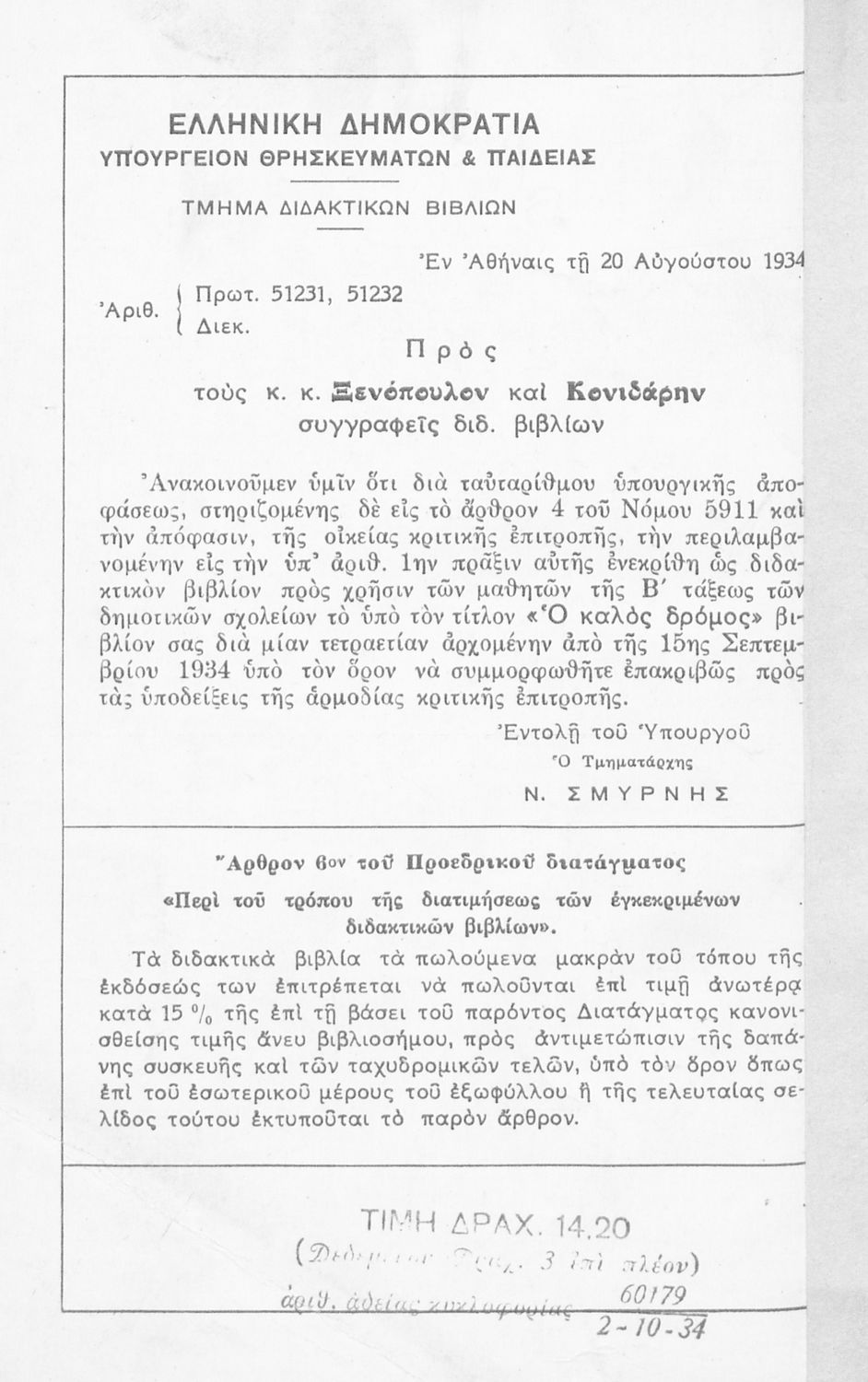 Υπουργική απόφαση / Σύμβαση: 51231,51232/20-8-1934