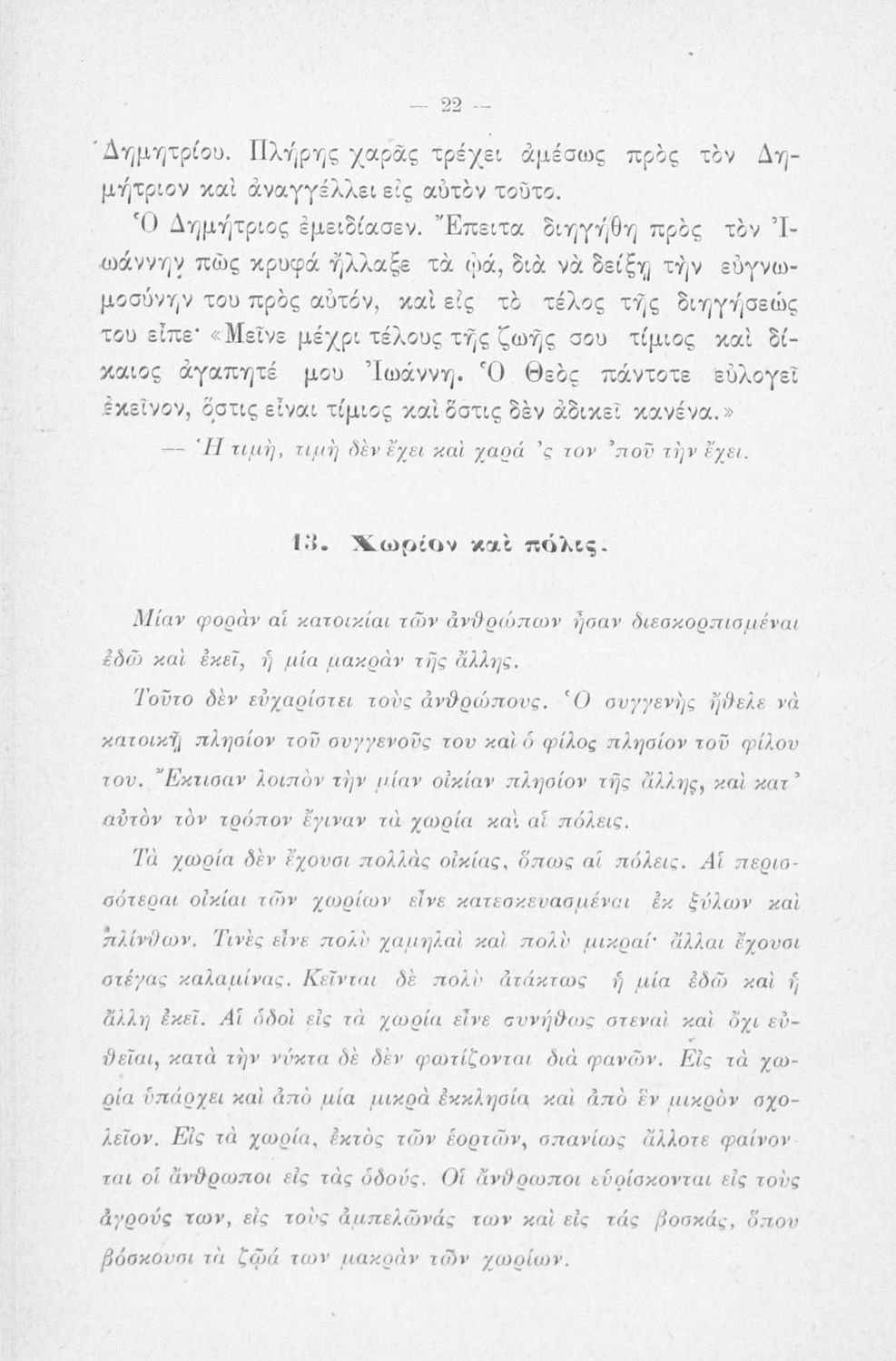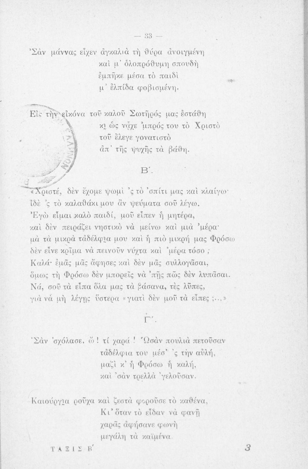 Αναγνωστικό Γ΄ Δημοτικού που περιλαμβάνει ποιήματα και πεζά με θέματα όπως η καλή και κακή συναναστροφή, η φρόνηση, η οκνηρία, η φιλανθρωπία και η πίστη στο Θεό