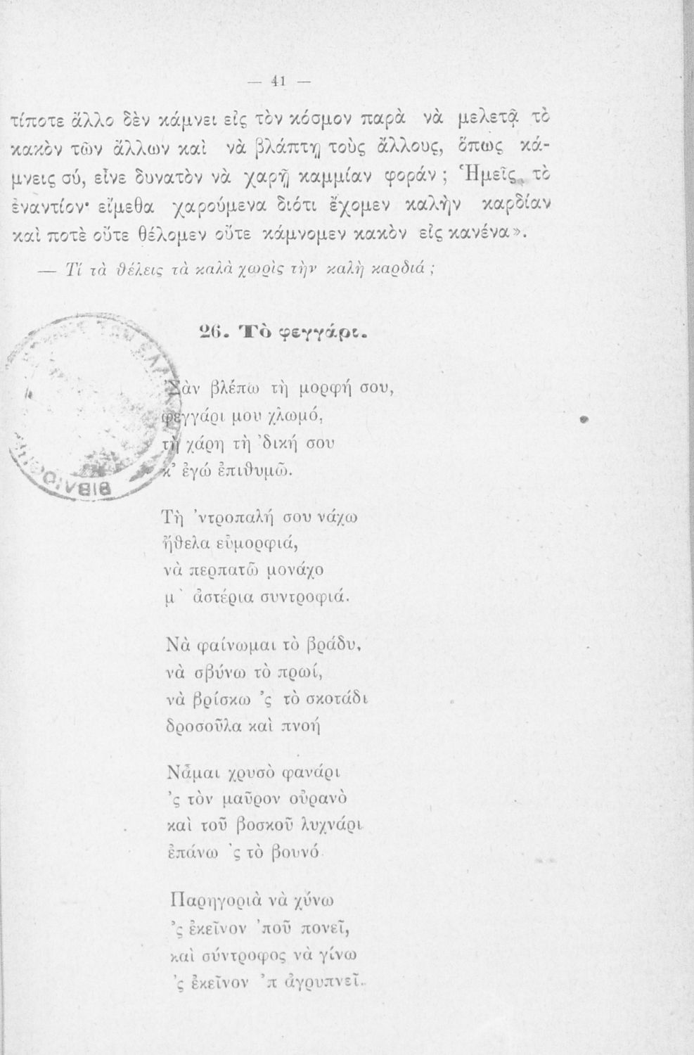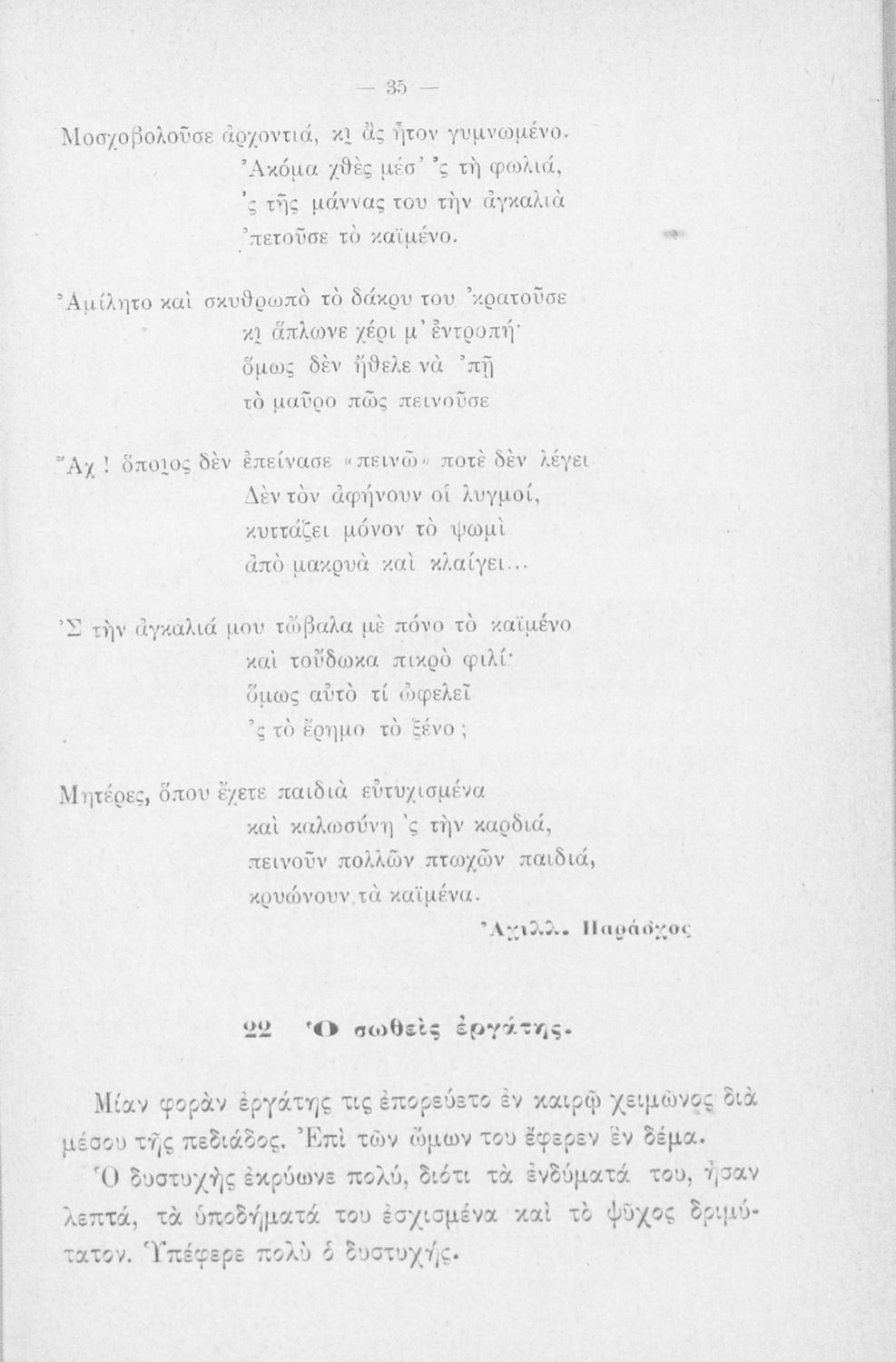 Αναγνωστικό Β' Δημοτικού που περιλαμβάνει πεζά και ποιήματα, ηθικοπλαστικού περιεχομένου, και προβάλει αξίες και αρετές όπως η τιμιότητα, η ευσπλαχνία, η γενναιότητα, η αγάπη, η φιλοπατρία, κι η ευγνωμοσύνη.