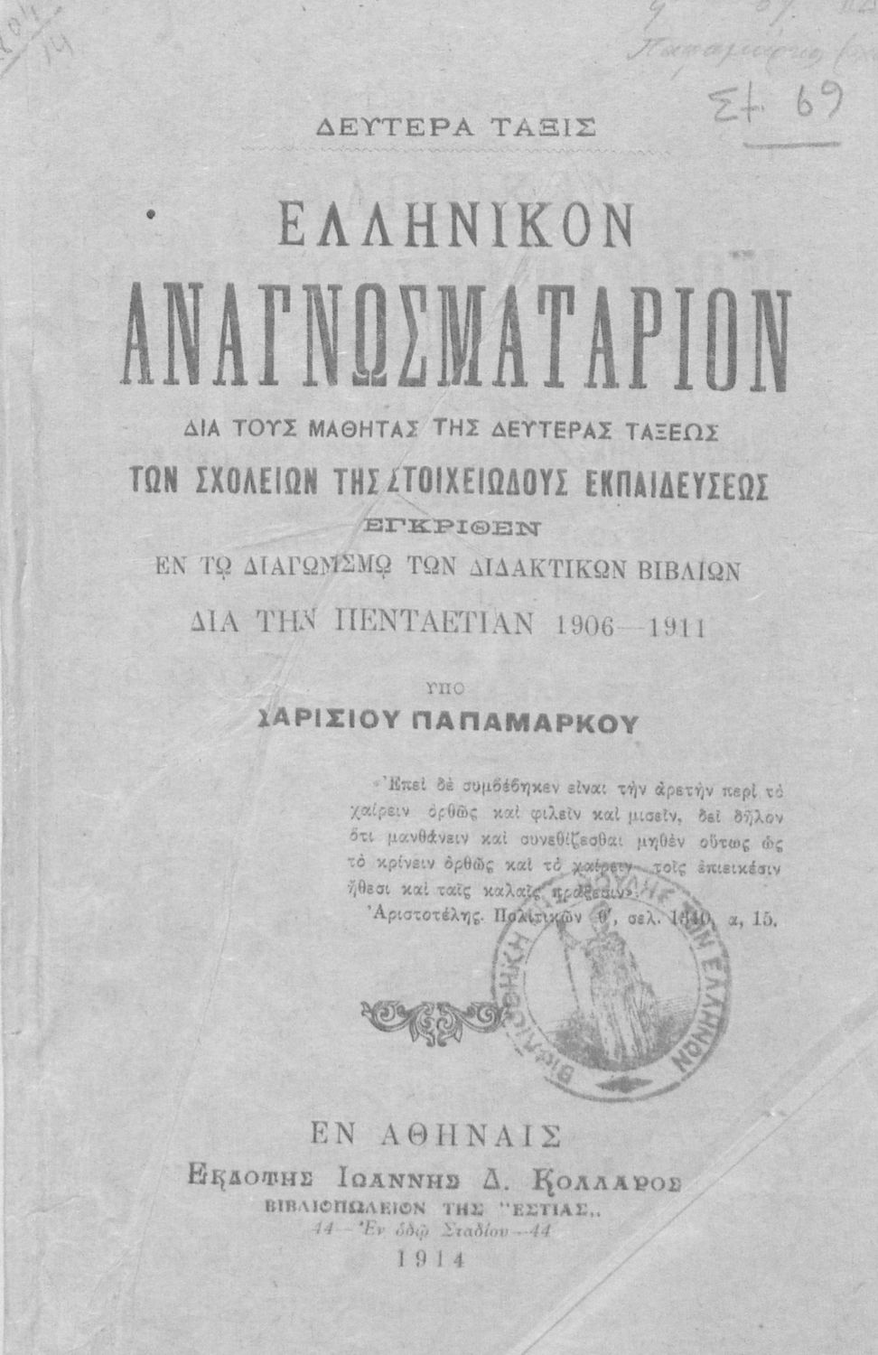 Τίτλος: Ελληνικόν Αναγνωσματάριο. Δια τους μαθητές της Δευτέρας Τάξεως των Σχολείων της Στοιχειώδους Εκπαιδεύσεως