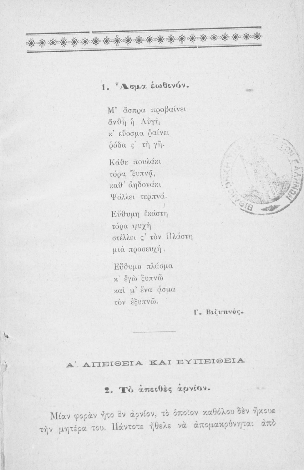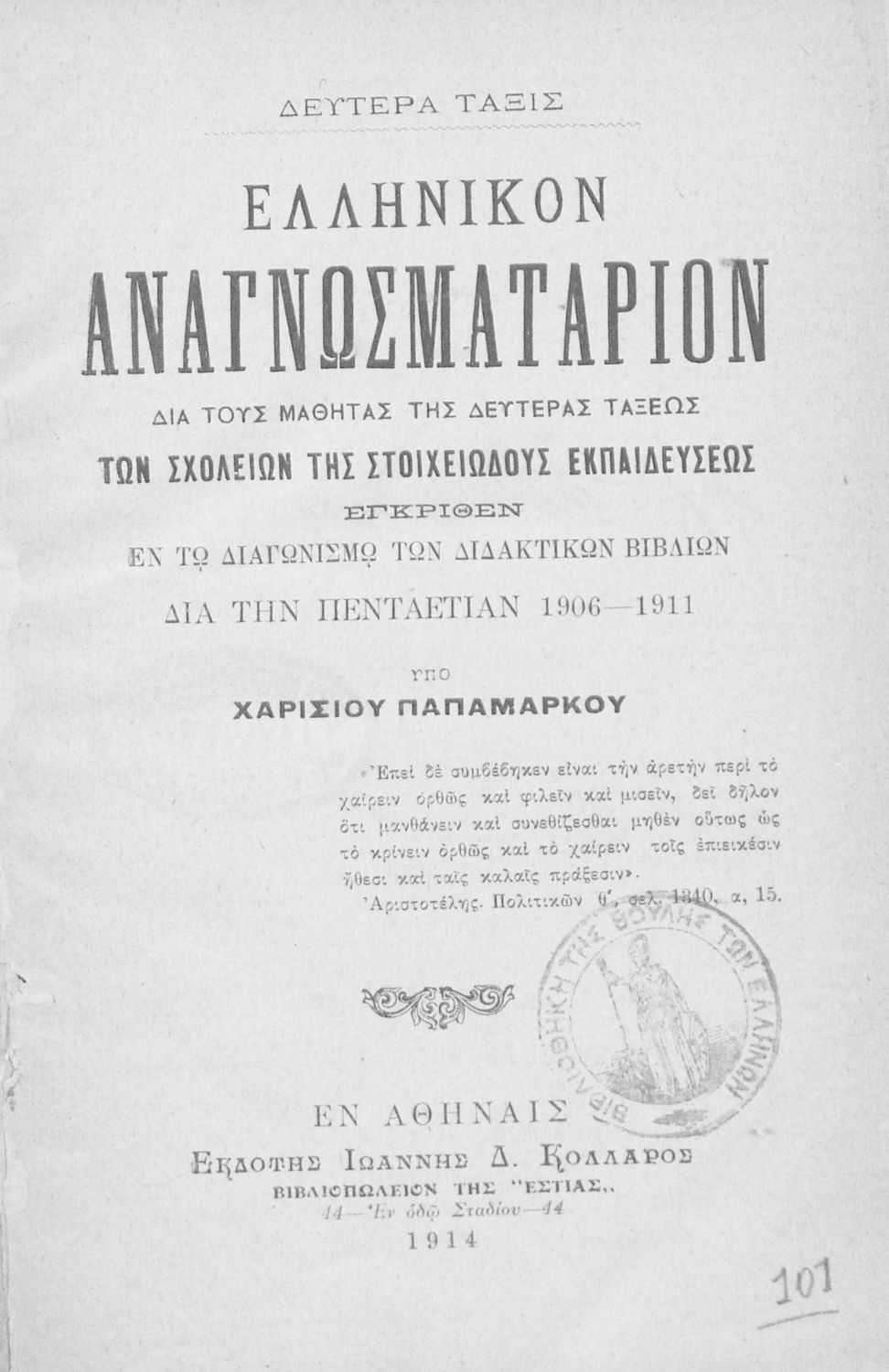 Ελληνικόν Αναγνωσματάριο. Δια τους μαθητές της Δευτέρας Τάξεως των Σχολείων της Στοιχειώδους Εκπαιδεύσεως