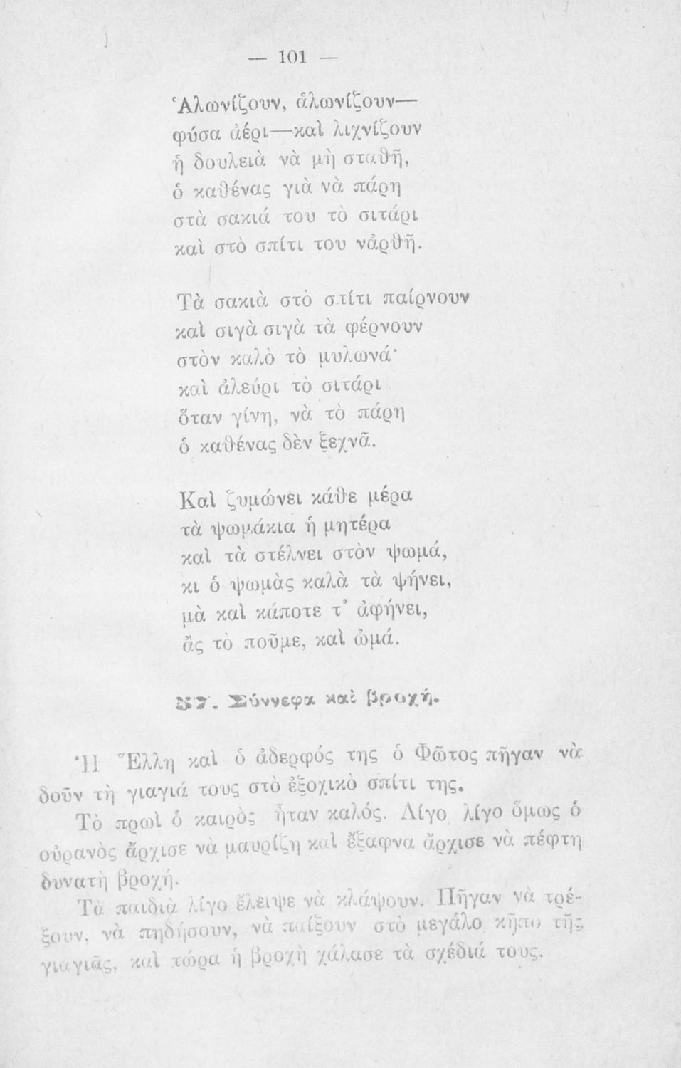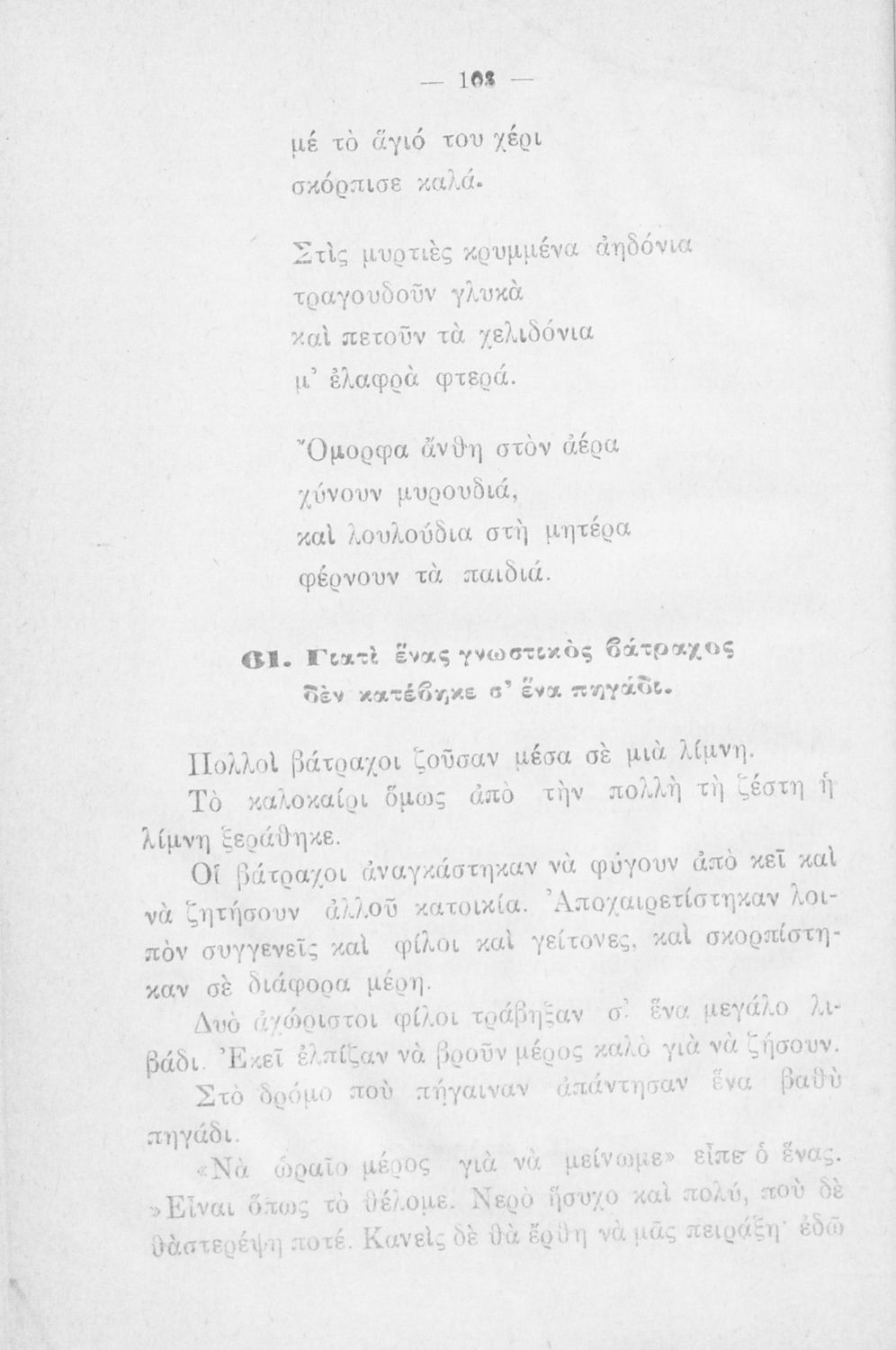 Αναγνωστικό Β' Δημοτικού που περιλαμβάνει ποιήματα και πεζά εμπνευσμένα από την καθημερινή ζωή, την ελληνική μυθολογία, την ελληνική φύση και τη θρησκευτική παράδοση.