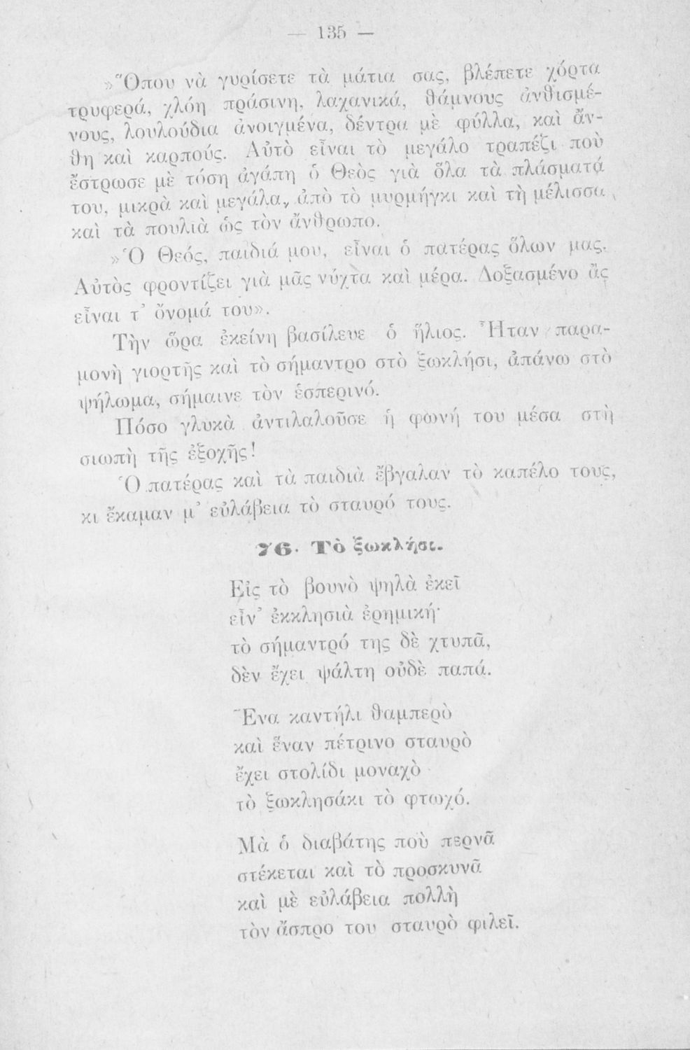 Αναγνωστικό Β' Δημοτικού που περιλαμβάνει ποιήματα και πεζά εμπνευσμένα από την καθημερινή ζωή, την ελληνική μυθολογία, την ελληνική φύση και τη θρησκευτική παράδοση.