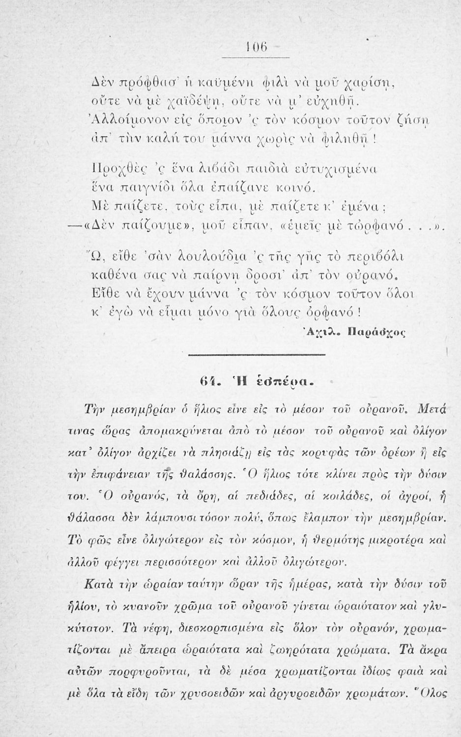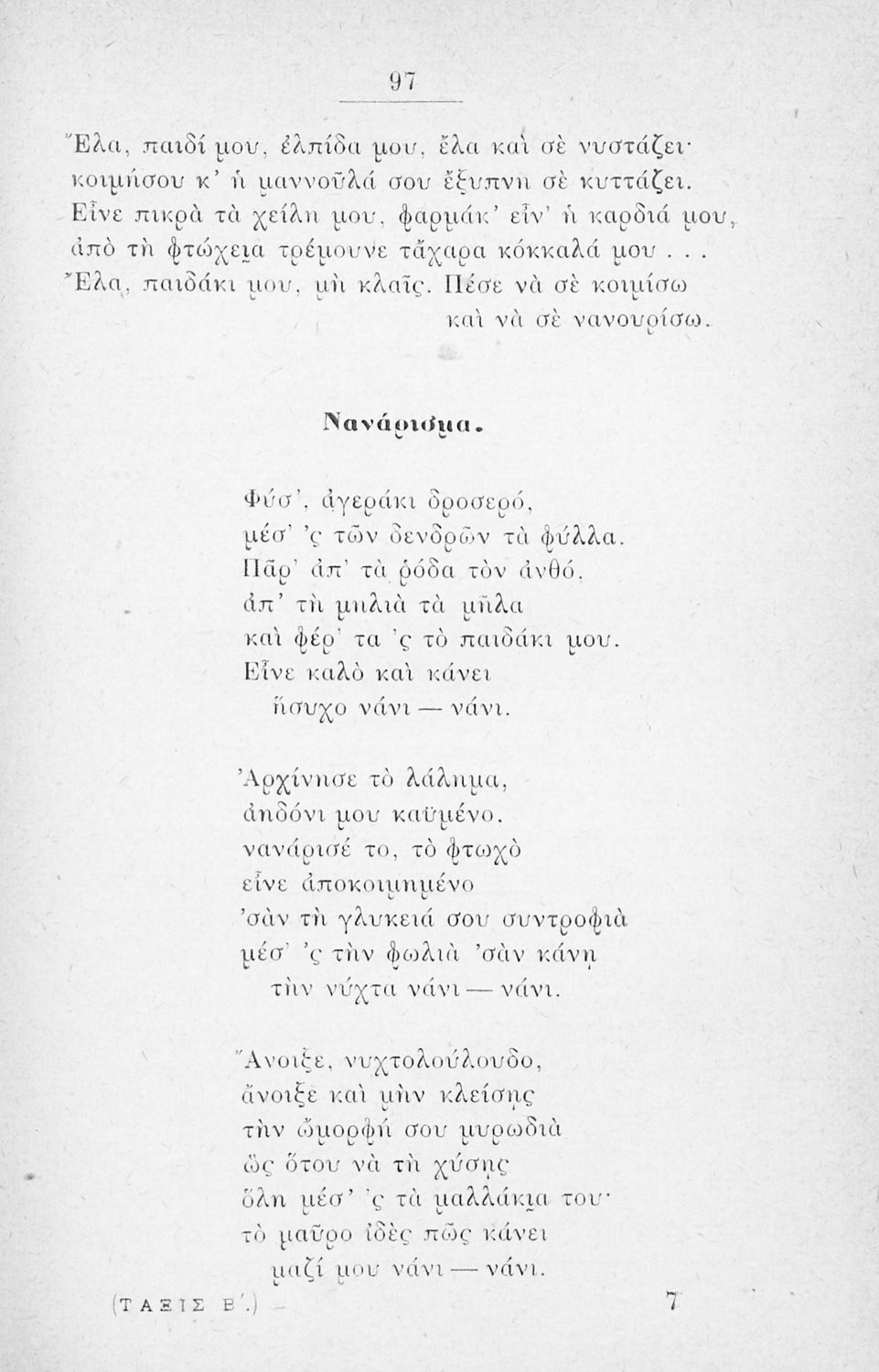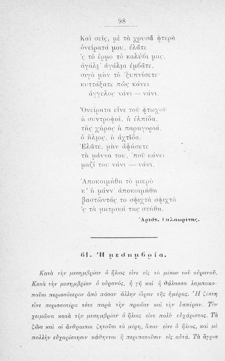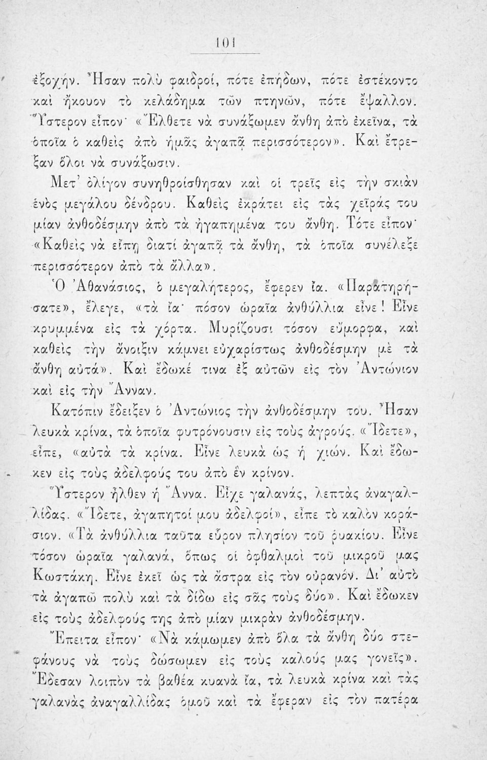 Αναγνωστικό Β' Δημοτικού που περιλαμβάνει πεζά και ποιήματα, ηθικοπλαστικού περιεχομένου, και προβάλει αξίες και αρετές όπως η τιμιότητα, η ευσπλαχνία, η γενναιότητα, η αγάπη, η φιλοπατρία, κι η ευγνωμοσύνη.