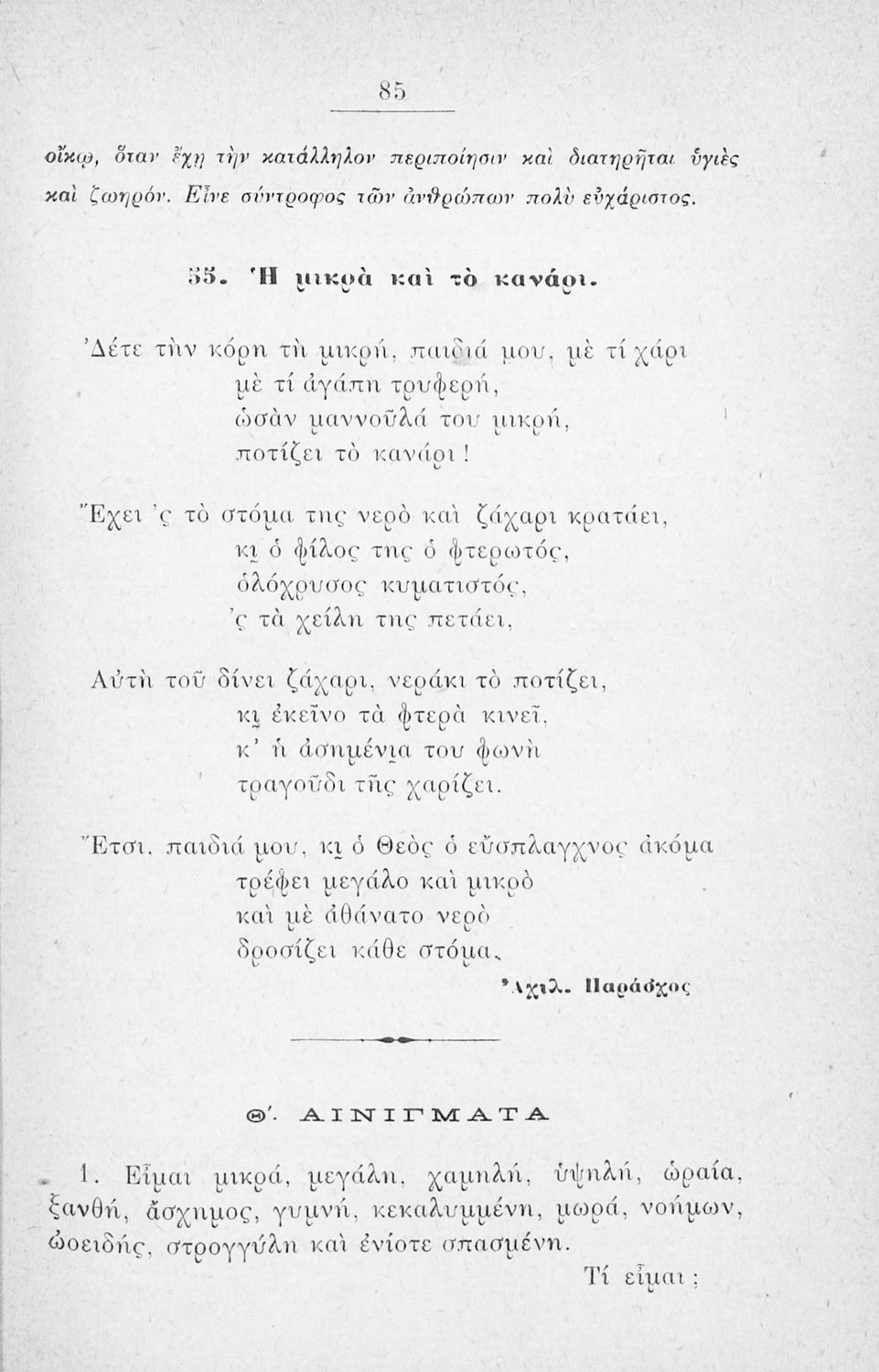 Αναγνωστικό Γ΄ Δημοτικού που περιλαμβάνει ποιήματα και πεζά με θέματα όπως η καλή και κακή συναναστροφή, η φρόνηση, η οκνηρία, η φιλανθρωπία και η πίστη στο Θεό