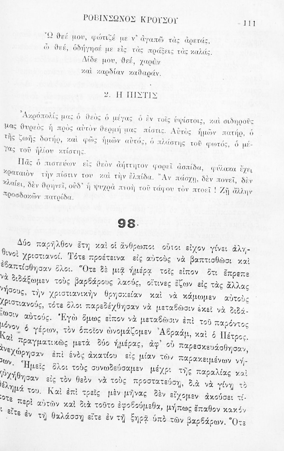 Σχολικό εγχειρίδιο για την Β Τάξη του Δημοτικού για το μάθημα της Γλώσσας. Περιλαμβάνει την αφηγηματική ιστορία του Ροβινσώνα Κρούσου, η ιστορία διαθέτει ηθικά διδάγματα για τους μικρούς μαθητές. Στο τέλος του βιβλίου υπάρχει παράρτημα με ποιήματα με περιεχόμενο εθνικό.