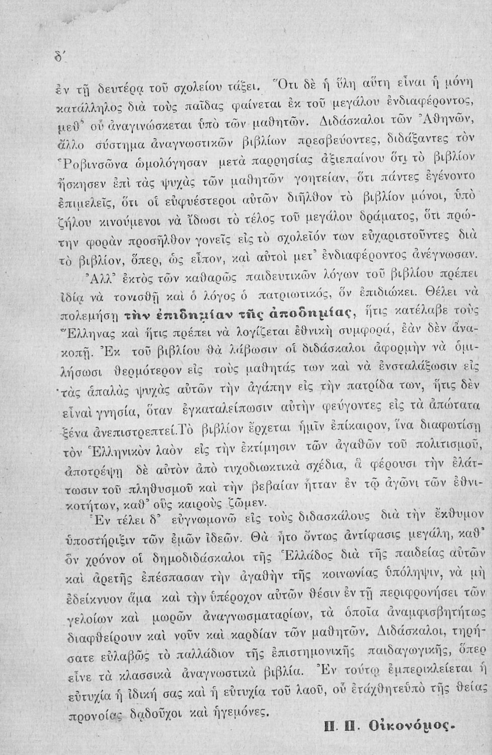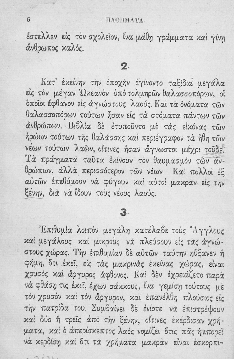 Βαθμίδα εκπαίδευσης: Πρωτοβάθμια Τάξη: Β' Δημοτικού Μάθημα: Νέα Ελληνικά Γλώσσα: Απλή καθαρεύουσα Παρουσίαση περιεχομένου: Σχολικό εγχειρίδιο για την Β Τάξη του Δημοτικού για το μάθημα της Γλώσσας. Περιλαμβάνει την αφηγηματική ιστορία του Ροβινσώνα Κρούσου, η ιστορία διαθέτει ηθικά διδάγματα για τους μικρούς μαθητές. Στο τέλος του βιβλίου υπάρχει παράρτημα με ποιήματα με περιεχόμενο εθνικό. |