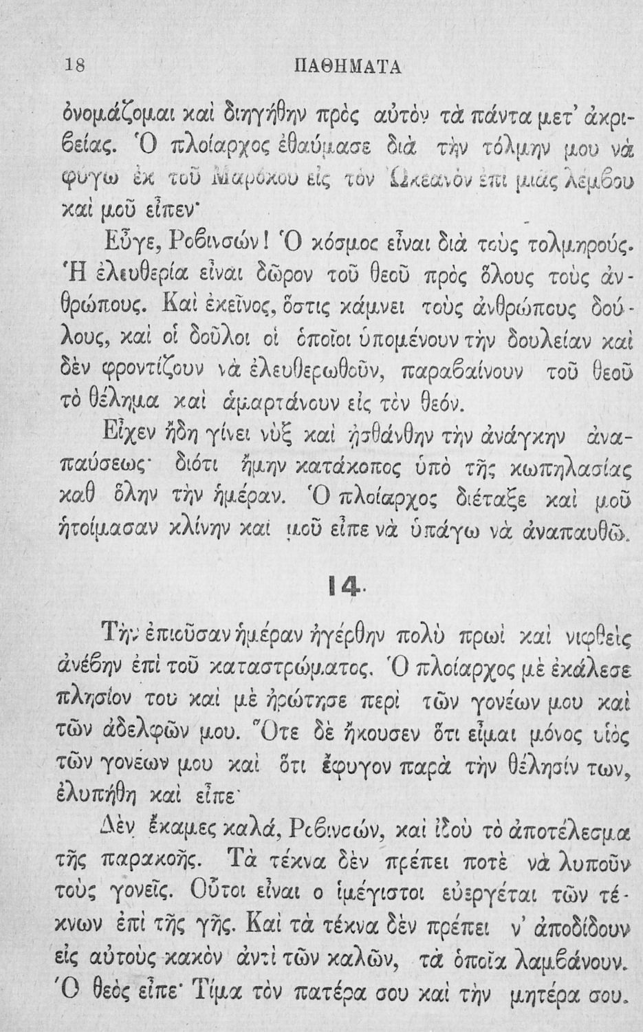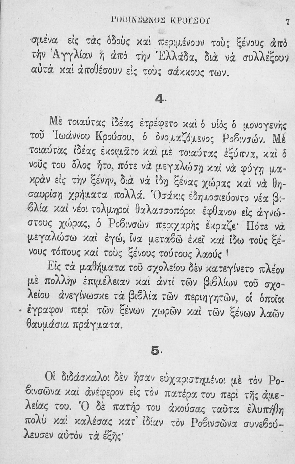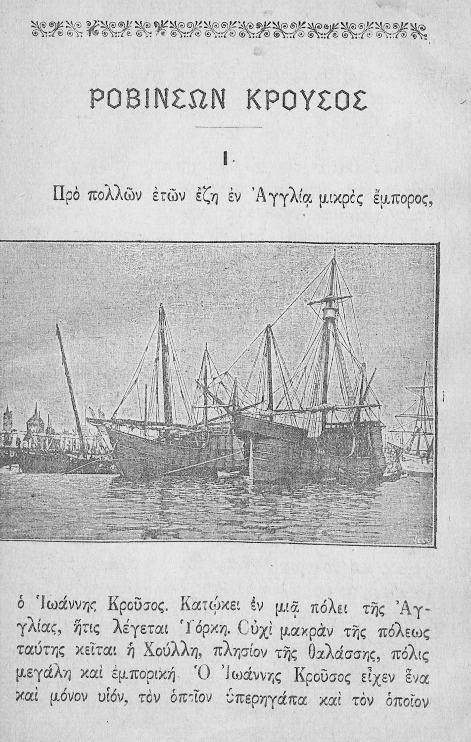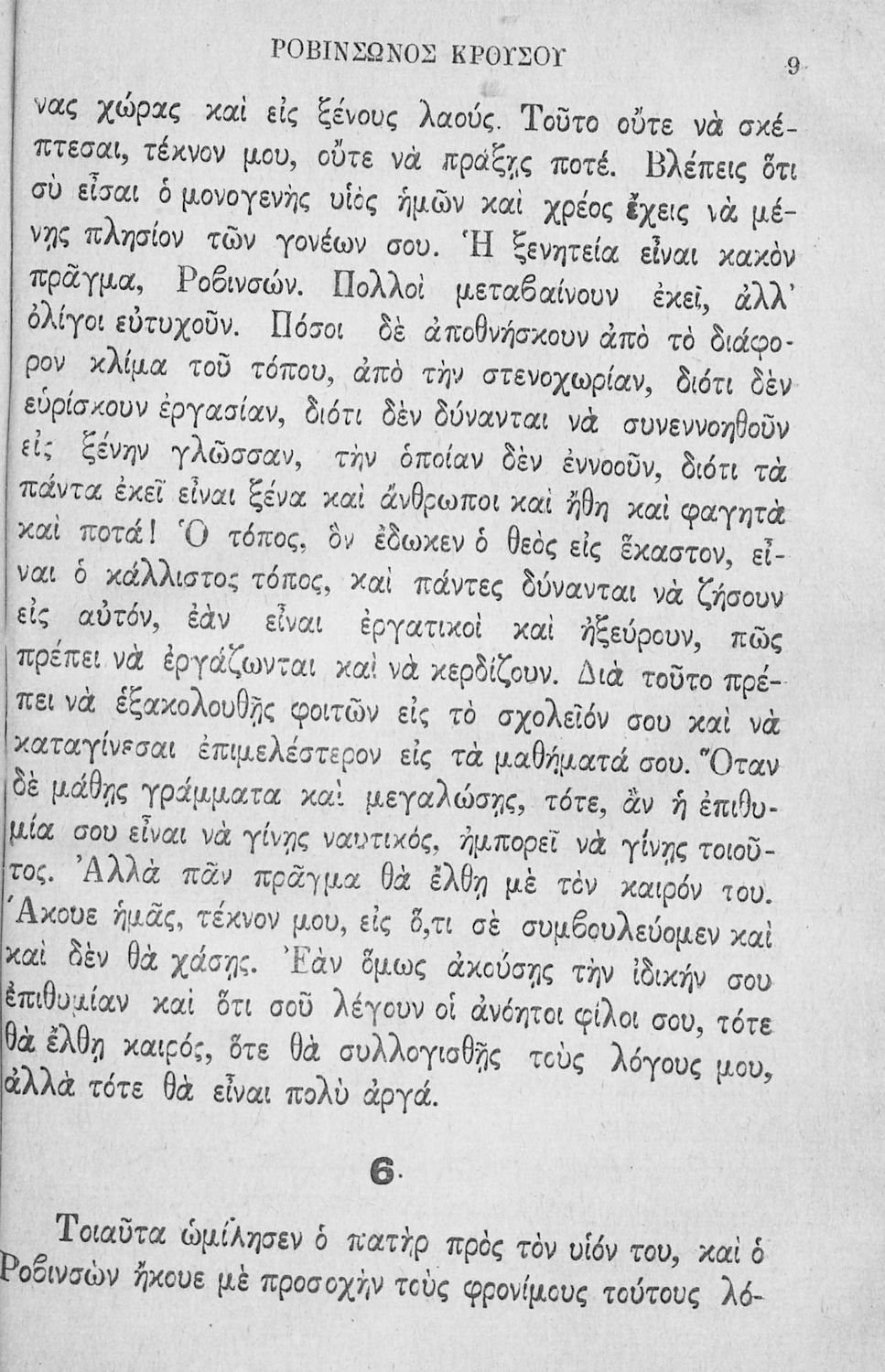 Σχολικό εγχειρίδιο για την Β Τάξη του Δημοτικού για το μάθημα της Γλώσσας. Περιλαμβάνει την αφηγηματική ιστορία του Ροβινσώνα Κρούσου, η ιστορία διαθέτει ηθικά διδάγματα για τους μικρούς μαθητές. Στο τέλος του βιβλίου υπάρχει παράρτημα με ποιήματα με περιεχόμενο εθνικό.