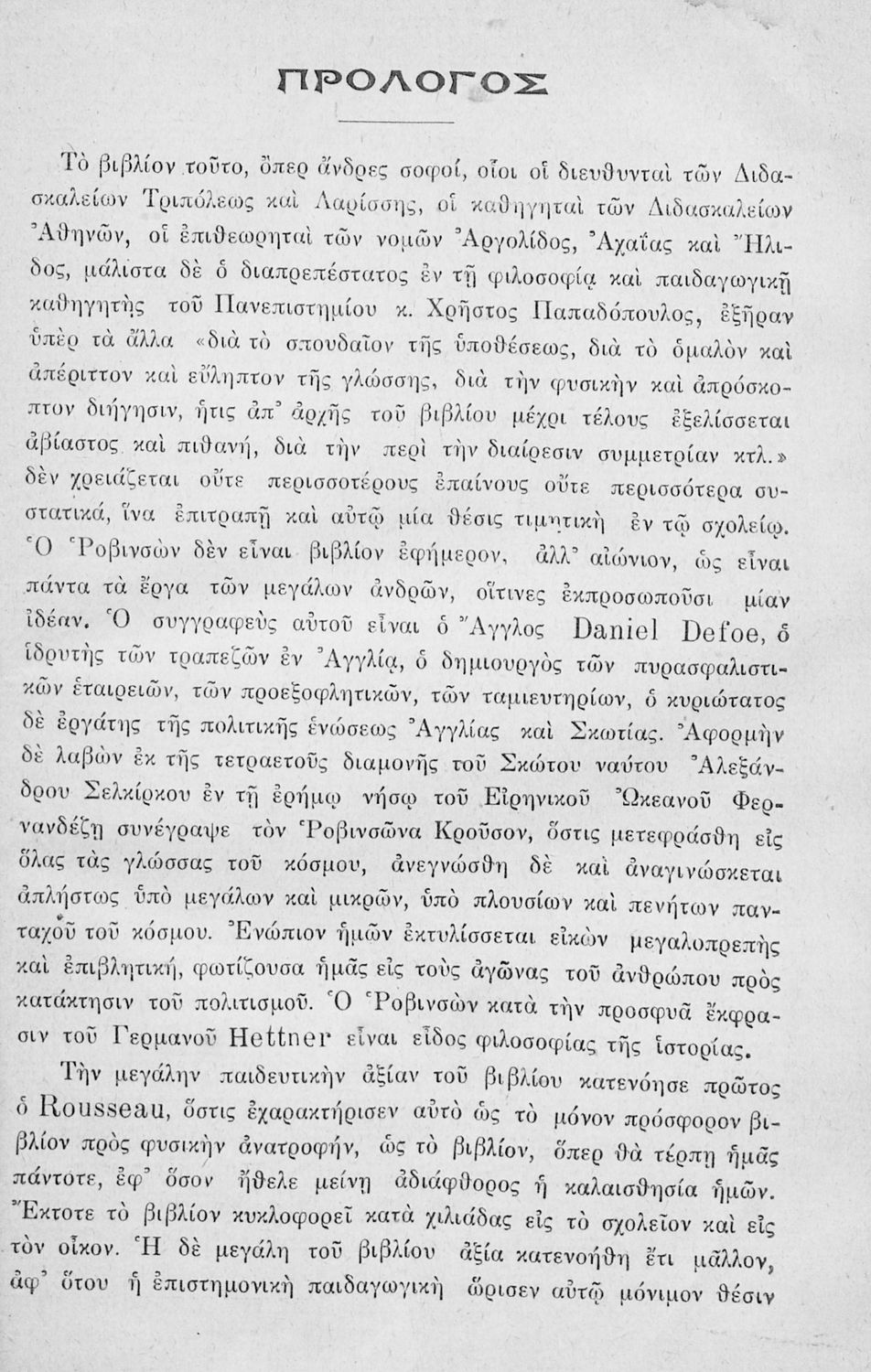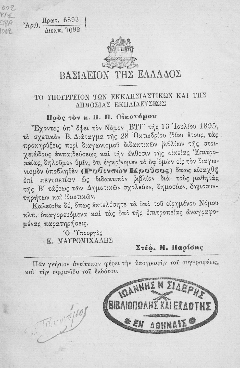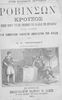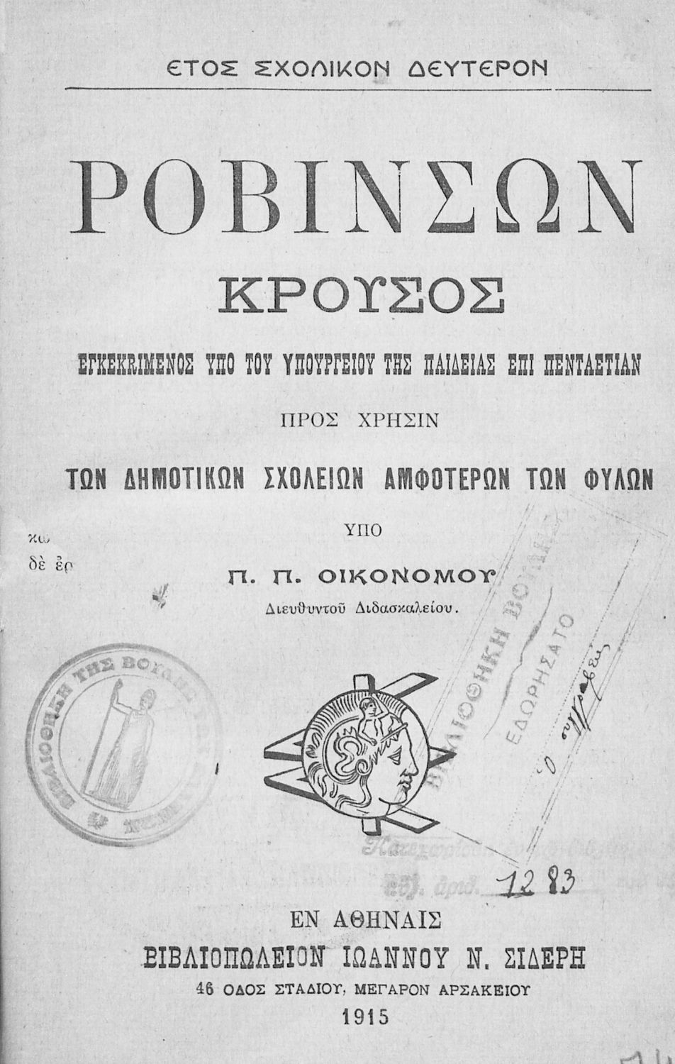 Κωδικός αναγνώρισης: 03-20561104 Τίτλος: Ροβινσών Κρούσος. Προς χρήσιν των Δημοτικών Σχολείων Αμφότερων των Φύλων Συγγραφέας: Π. Π. Οικονόμος Μέγεθος και υπόστρωμα: Σχολικό εγχειρίδιο, σκληρό εξώφυλλο, 144 σελίδες. Σκίτσα, εικόνες (ασπρόμαυρα). |
