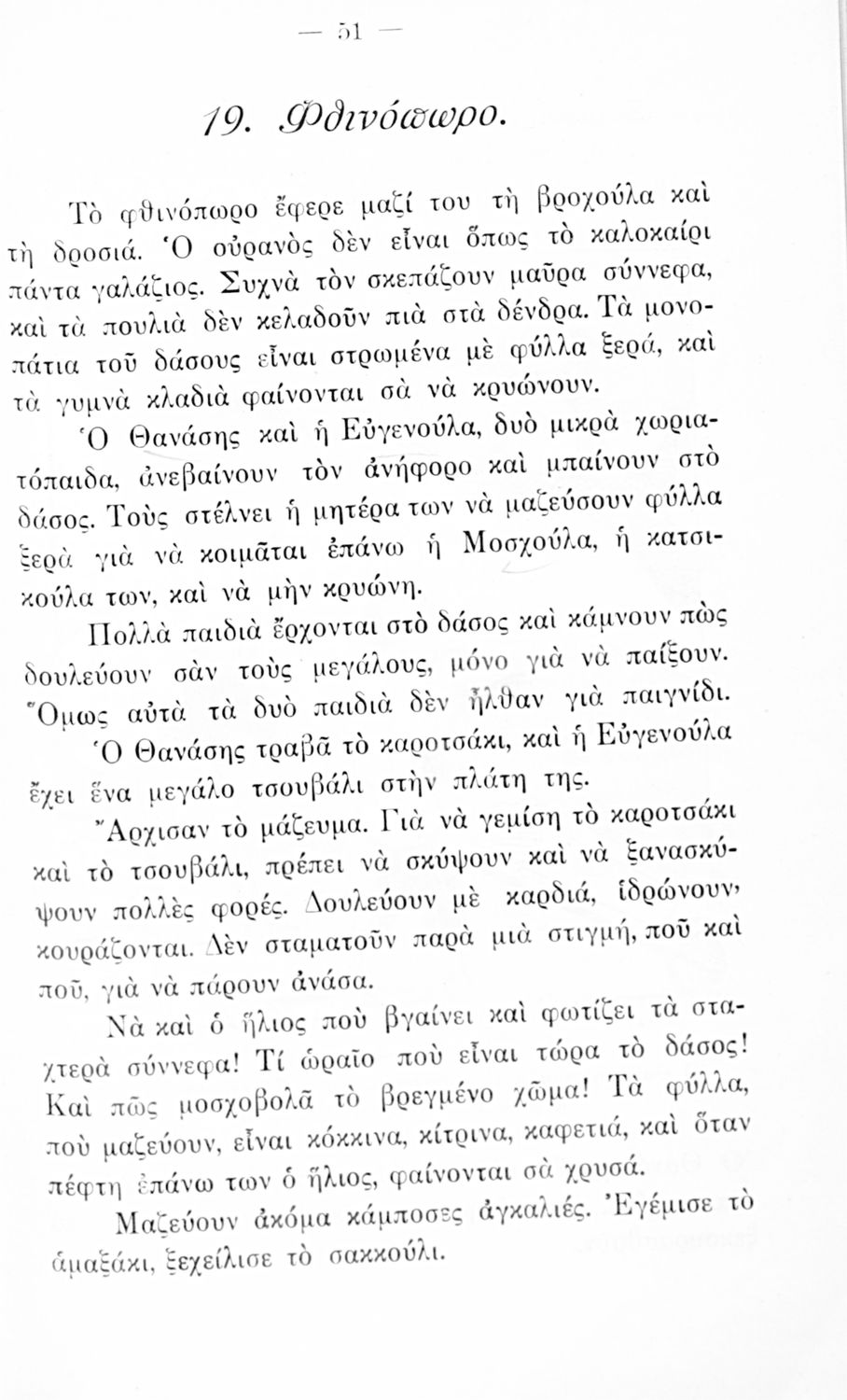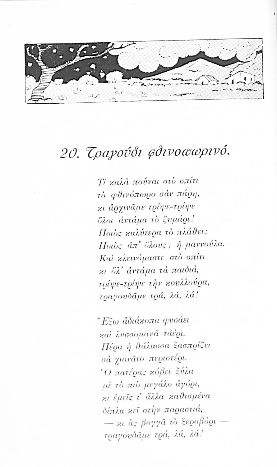 Αναγνωστικό Β' Δημοτικού που είναι χωρισμένο σύμφωνα με τις εποχές του χρόνου και περιλαμβάνει κείμενα ηθοποιητικού περιεχομένου εμπνευσμένα από τη θρησκευτική, εθνική, κοινωνική και οικογενειακή ζωή. Φέρει το