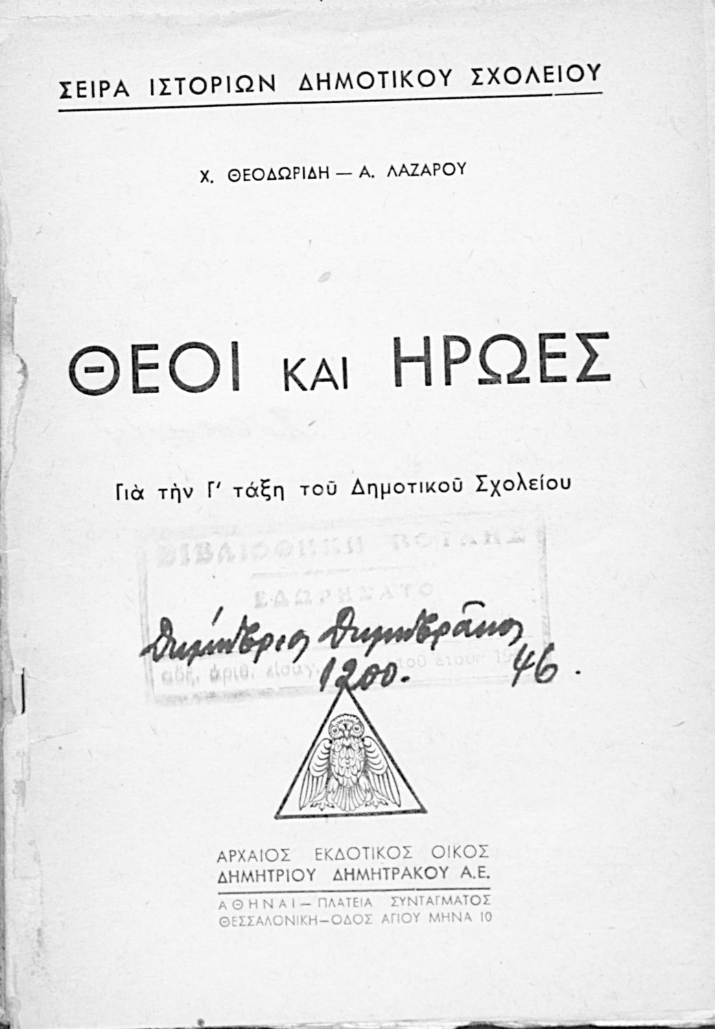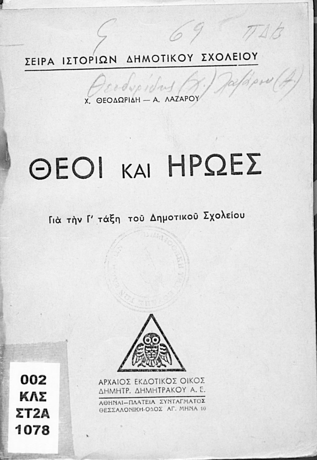 Κωδικός αναγνώρισης: 03-20561120 Τίτλος: Θεοί και ήρωες για τη Γ΄ τάξη του Δημοτικού Σχολείου Συγγραφέας: Χ. Θεοδωρίδης, Α. Λαζάρου Μέγεθος και υπόστρωμα: Μαθητικό βοήθημα, 75 σελίδες. Εικόνες (ασπρόμαυρες). |