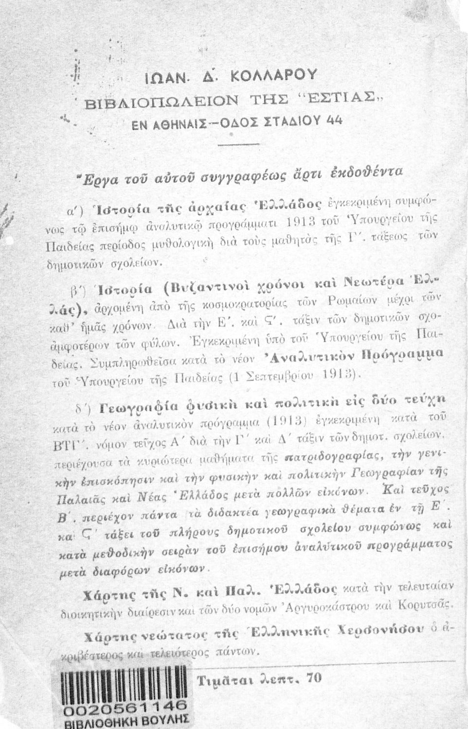 LDR 01250 2200193 4500 035 ## _a03-20561146 040 ## _aΒιβλιοθήκη της Βουλής των Ελλήνων 041 ## _ael 100 ## _aΝικόλαος Μεταξάς 110 ## _a20561146 245 0# _aΙστορία της αρχαίας Ελλάδος δια τους μαθητάς της Δ΄ τάξεως των Δημοτικών Σχολείων αμφοτέρων των φύλων 260 ## _aΑθήνα _bΙωάννης Δ. Κολλάρος, Βιβλιοπωλείο της "Εστίας" _c1916 300 ## _a138 _bΣκίτσα (ασπρόμαυρα) 520 ## _aΣχολικό εγχειρίδιο Ιστορίας Δ΄ Δημοτικού που καλύπτει το διάστημα από τους προϊστορικούς χρόνους ως την κατάληψη της Ελλάδας από τους Ρωμαίους. 521 ## _aΔ' Δημοτικού 522 ## _aΕλλάδα 546 ## _aΚαθαρεύουσα 563 ## _aΣκληρό Εξώφυλλο 650 #4 _aΑθήνα _aΔωριείς _aΘήβα _aΜ Αλέξανδρος _aΠελασγοί _aΠελοποννησιακός πόλεμος _aΠερσικοί πόλεμοι _aΣπάρτη _aΧαιρώνεια