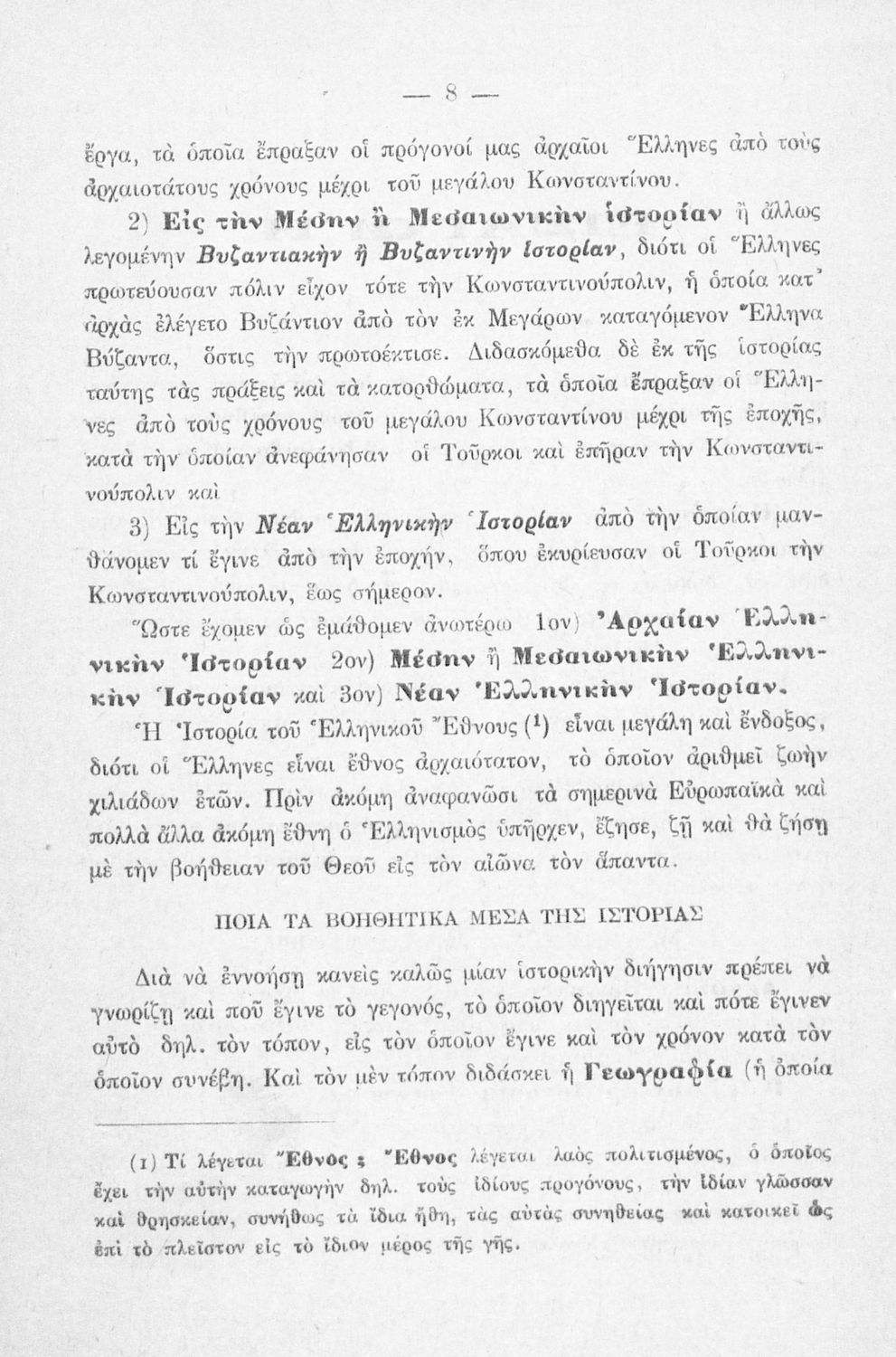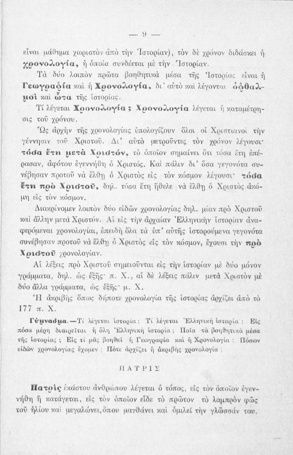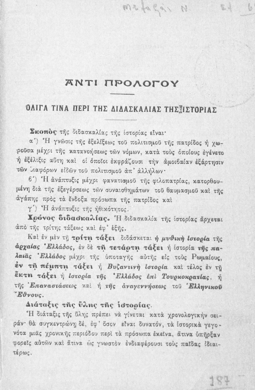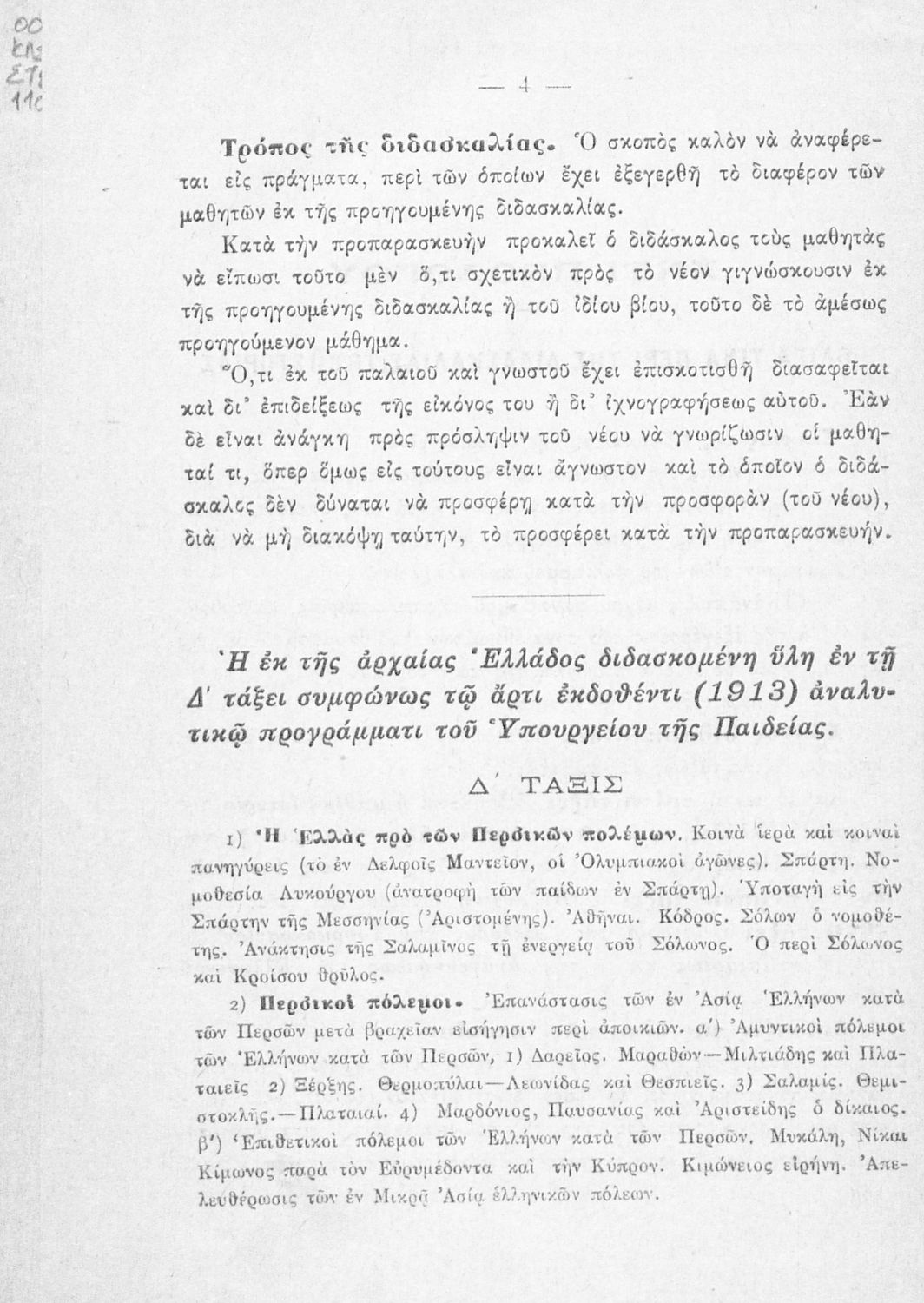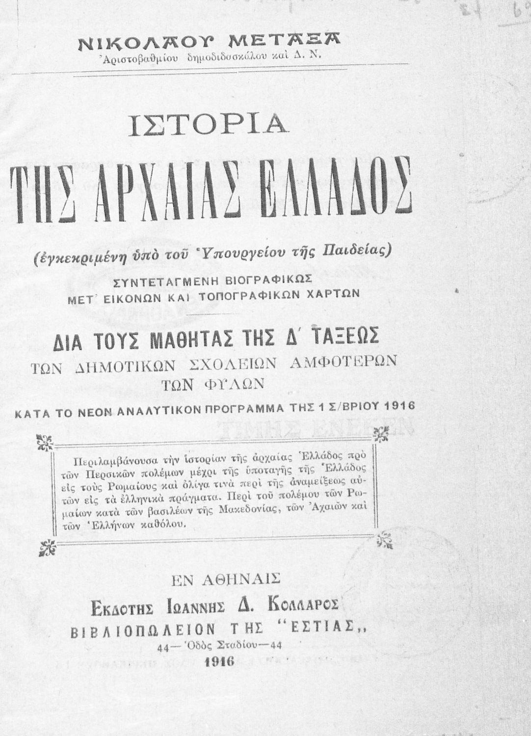 Βαθμίδα εκπαίδευσης: Πρωτοβάθμια Τάξη: Δ' Δημοτικού Μάθημα: Ιστορία Γλώσσα: Καθαρεύουσα Παρουσίαση περιεχομένου: Σχολικό εγχειρίδιο Ιστορίας Δ΄ Δημοτικού που καλύπτει το διάστημα από τους προϊστορικούς χρόνους ως την κατάληψη της Ελλάδας από τους Ρωμαίους. |