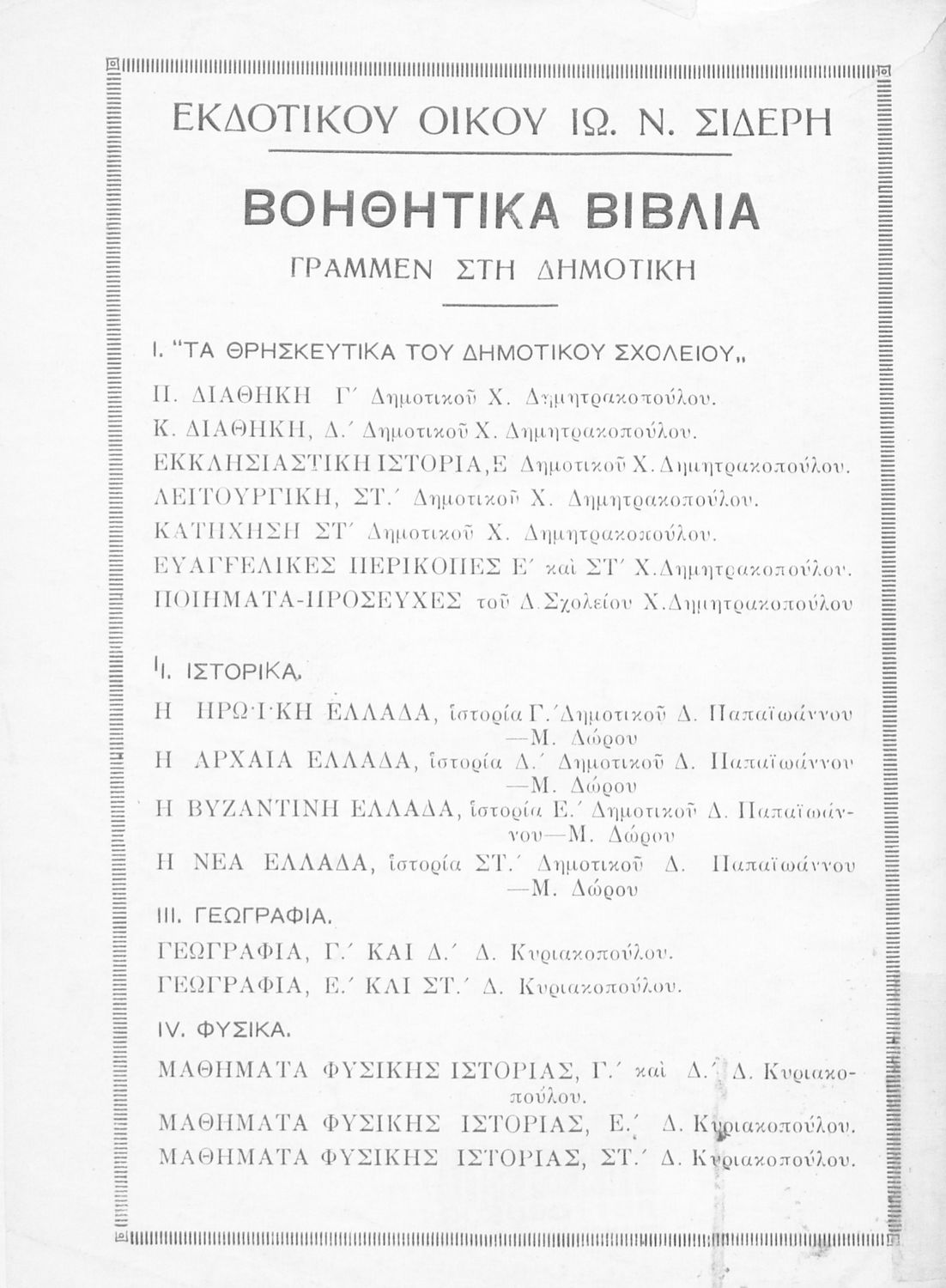 Εκδότης: Ιωάννης Ν. Σιδέρης Έτος έκδοσης: 1946 Τόπος έκδοσης: Αθήνα Υπουργική απόφαση / Σύμβαση: 44451/10-9-1930 Έτος έγκρισης: 1930 |