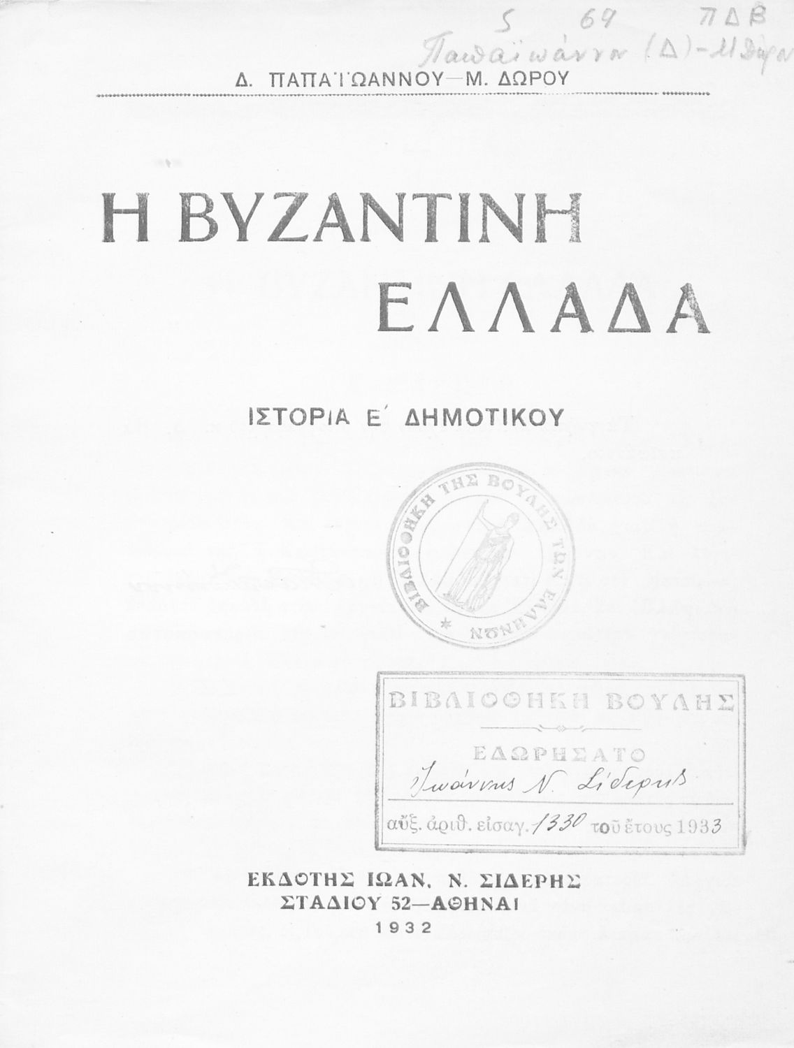 Εκδότης: Ιωάννης Ν. Σιδέρης Έτος έκδοσης: 1946 Τόπος έκδοσης: Αθήνα Υπουργική απόφαση / Σύμβαση: 44451/10-9-1930 Έτος έγκρισης: 1930 |