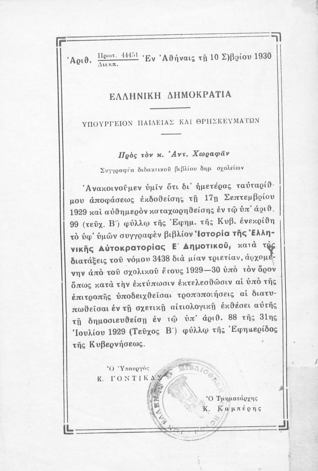 Υπουργική απόφαση / Σύμβαση: 44451/10-9-1930